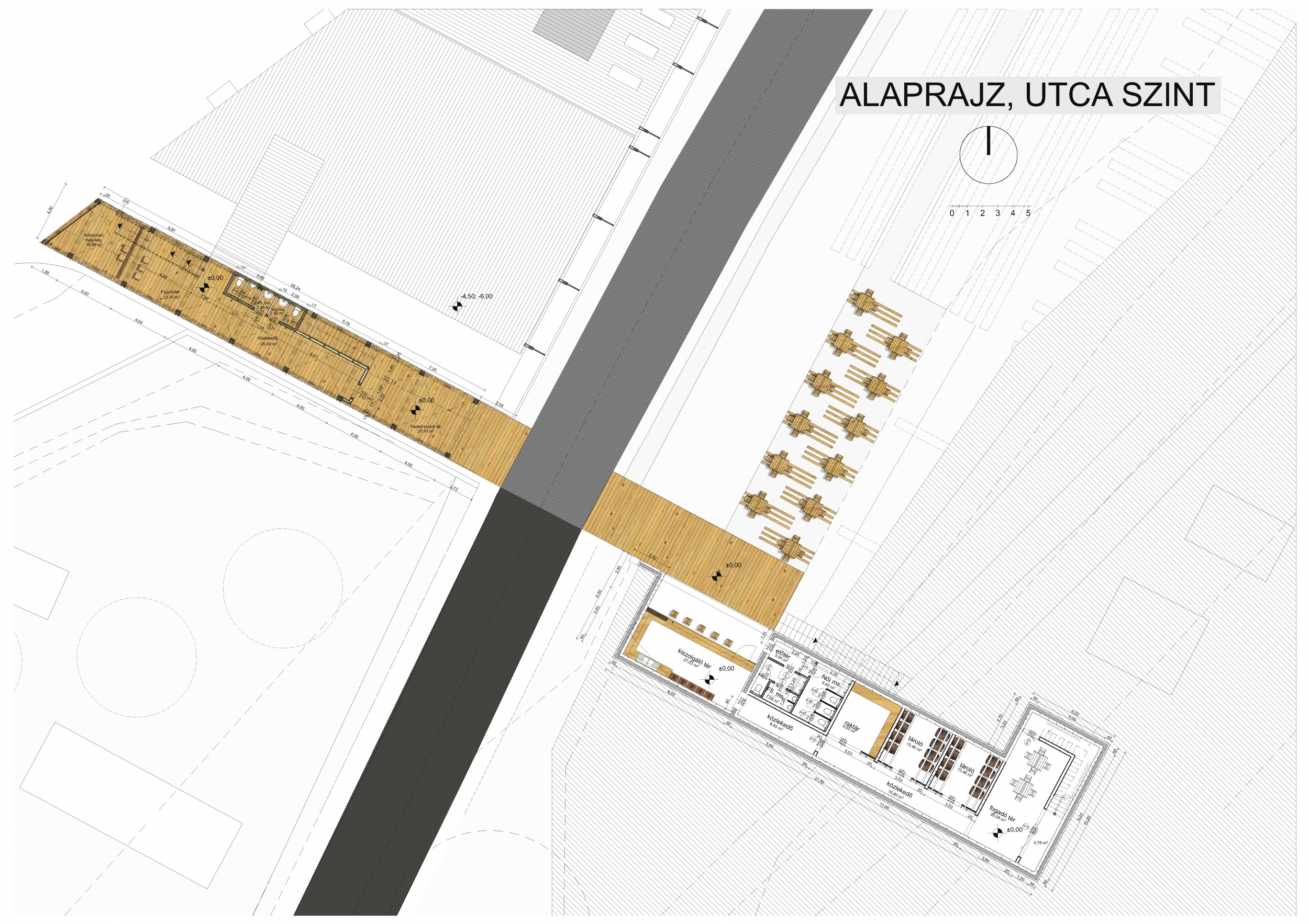 A telek különleges helyzete továbbá, hogy az utca túl oldalán közvetlenül helyezkedik el az alsópincesor. Az itteni pincék is hasonló helyzetűek, mint a domb tetején lévő elhagyott épületek. A könnyű megközelítés miatt viszont több pince és telek is használatban van jelenleg is. A használaton kívüliek elég rossz állapotúak, és sok közülük már elbontásra került. A pincesor elején ezért számos üresen maradt telek található. A két terület közelsége miatt ideálisnak tűnt az út jobb oldalát is bevonni a programba. A további pusztulás elkerülése miatt egy borterasz kialakítását képzeltem el, amelyhez (kiegészítve a meglévő présházakat) kisebb kunyhók tartoznak, a kirándulók számára tehát pihenő lehetőséget is biztosítva ezzel. A borterasz létrehozásával ismét fellendülhetne az egykor virágzó szőlőtermesztés is, megmentve a helyi présházakat.