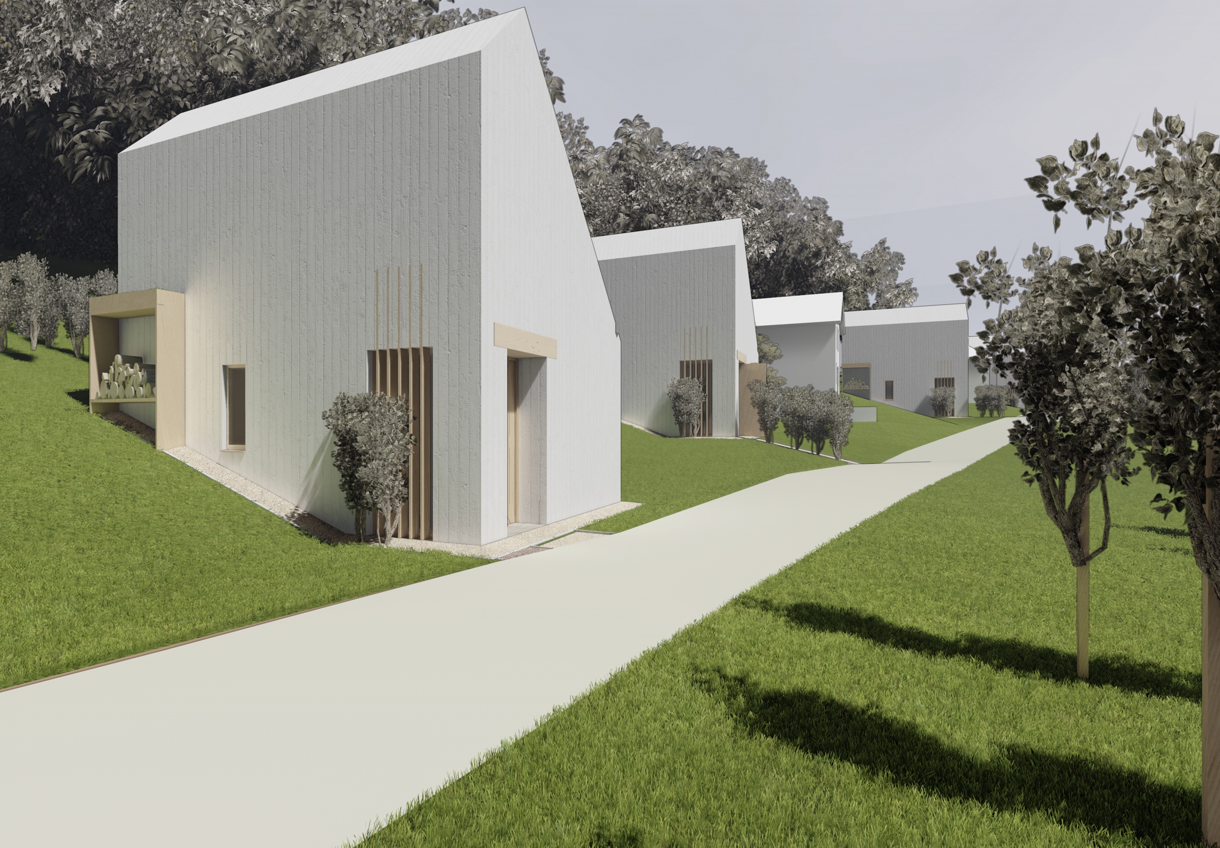 A területre és a programra egyaránt érvényes a kettősség, amelynek a határvonala a Petőfi út. Ezt a kettősséget próbáltam feloldani az épületek elhelyezésével. A meglévő présházak méretarányainak megfelelően a teljes területre egy 4x6 méteres rasztert helyeztem el, s ez a háló jelölte ki az új épületek helyét, beleértve a csónakházat is. A kunyhók kialakításánál a meglévő présházak tömegeit vettem alapul. A közös jellemzőjük közül a zártság, nyeregtető és a széles faszerkezetű bejárati ajtó volt az, amelyet az új kunyhóknál is alkalmazni szerettem volna. A már kialakult pincesoron kiegészítve a meglévő utcaképet 5 db kunyhót helyeztem el. A 6. kunyhóm, bár formailag megegyezik az előbb említett épületekkel más funkciót kapott. Fontosnak tartottam, hogy a kialakuló borteraszomhoz egy présház is tartozzon, így ez az épület, - amely a csónakházzal egy vonalba esik- a hagyományokat követve présházzá alakult. A pince kialakítása viszont a hagyományostól eltérően nem az épület mögé került. Ennek az elhelyezését a borterasz kialakítása indokolta.