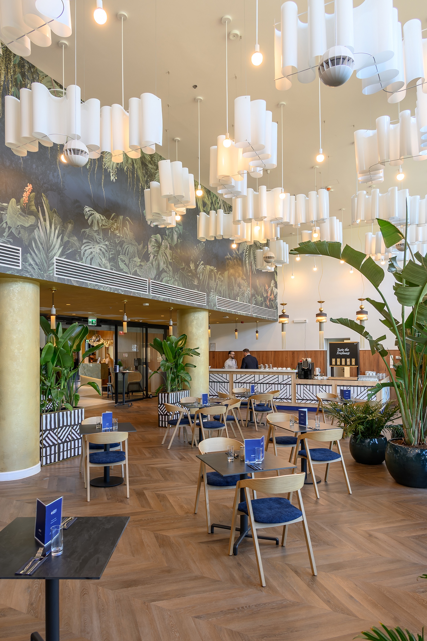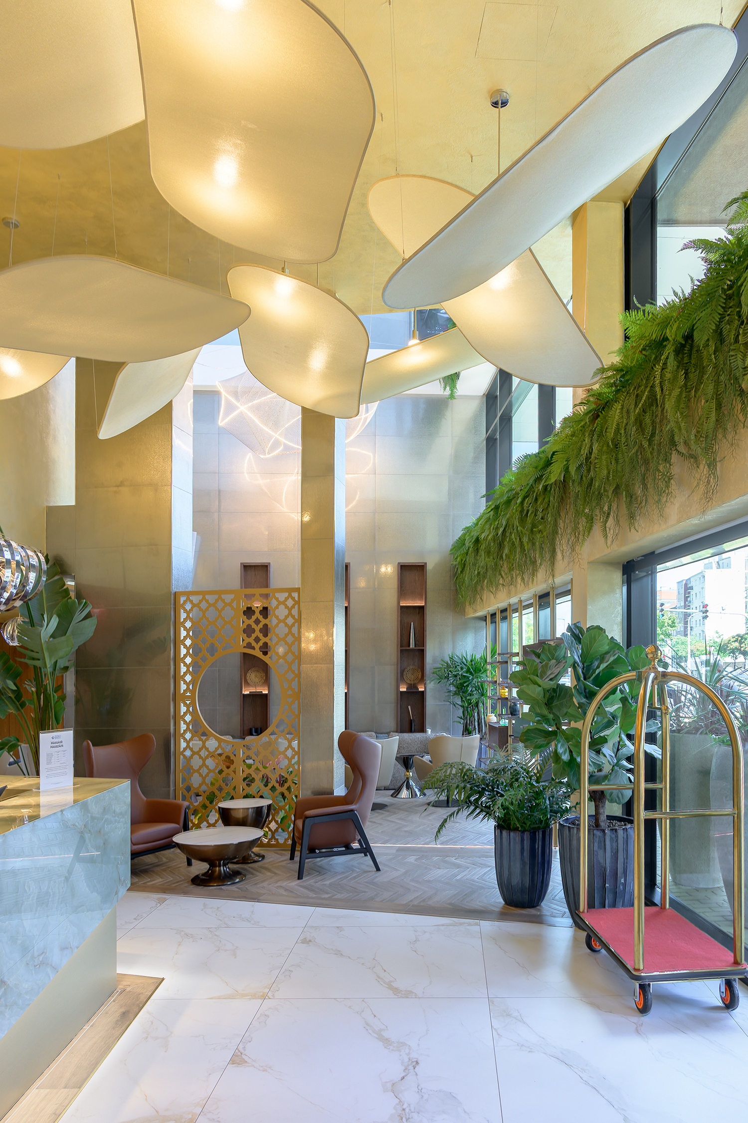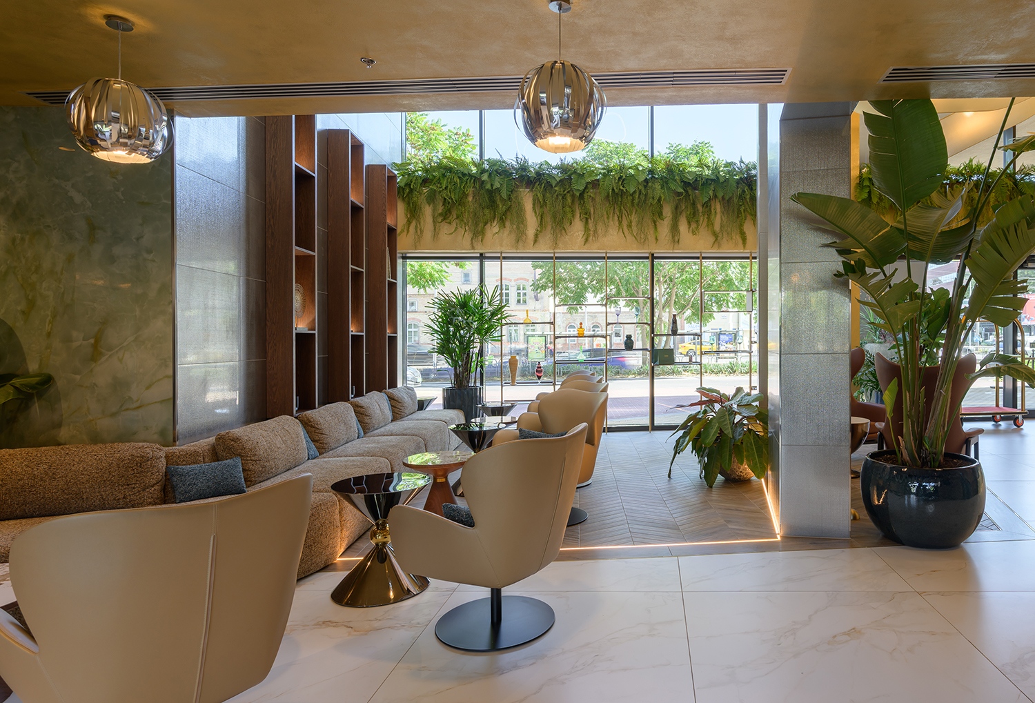 Egy hotelbe a vendégek mindig a recepción keresztül érkeznek, ott szerzik az első benyomást, magam is ezt jártam először körbe. Márványfelületei, faberakásai, a nagyméretű kaspókba helyezett és fentről lefuttatott növények ellenpontozzák a műanyag székek és a fémes elemek ipari jellegét. Az étkezőben, a folyósokon, de leginkább a szálloda Sky Bar részlegében érződik a törekvés a természet megidézésére – hol természetes anyagokkal, hol növényindás tapétával. Az aranyban játszó megvilágítás, a sok függő, lelógatott elem (áttetsző lapok, rézbúrák, fémspirálok) egzotikus, számomra kissé ázsiai hatást keltenek, ám zsúfoltságával mégis barátságossá teszi ezt az amúgy sem zord épületet. A különböző kategóriájú szobák berendezése megfelel a ma divatos, visszafogott stílusnak: nincs bennük semmi extrém különleges, de ezáltal kivetnivaló sem.