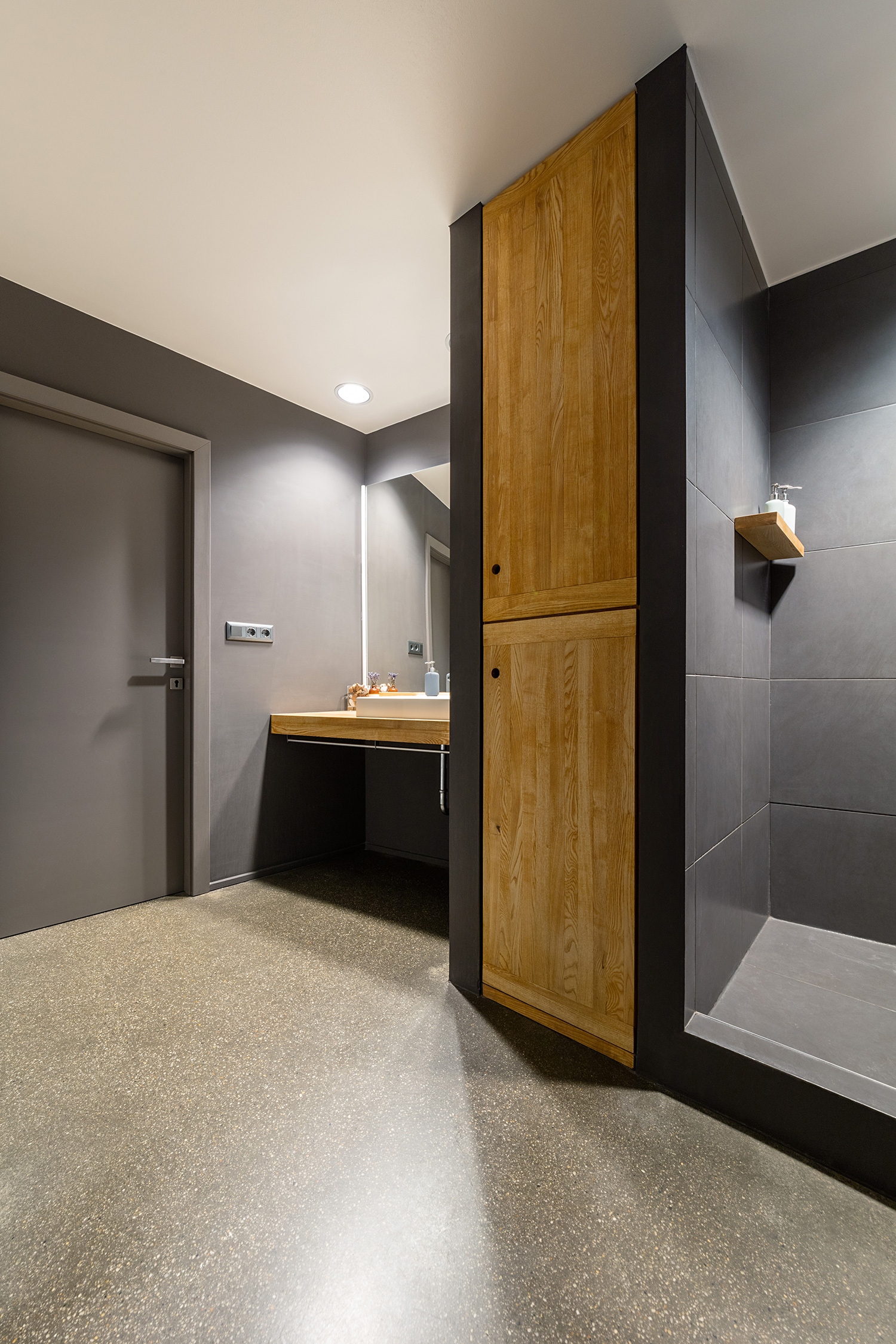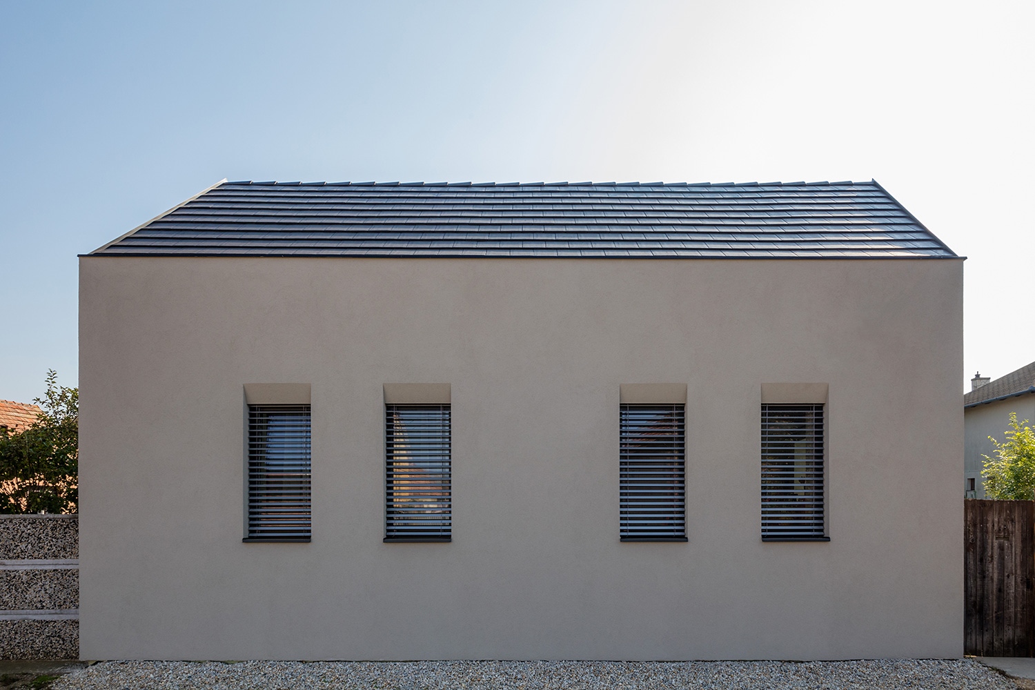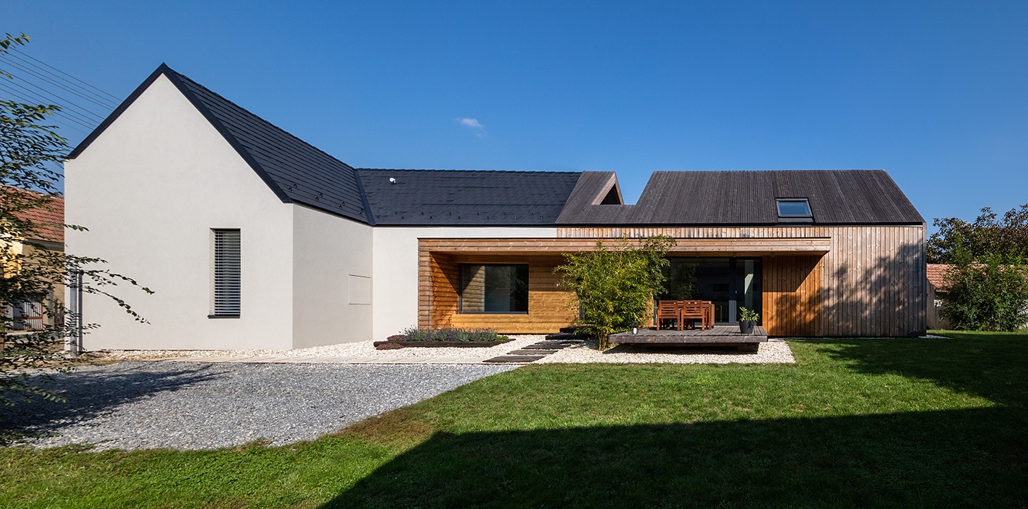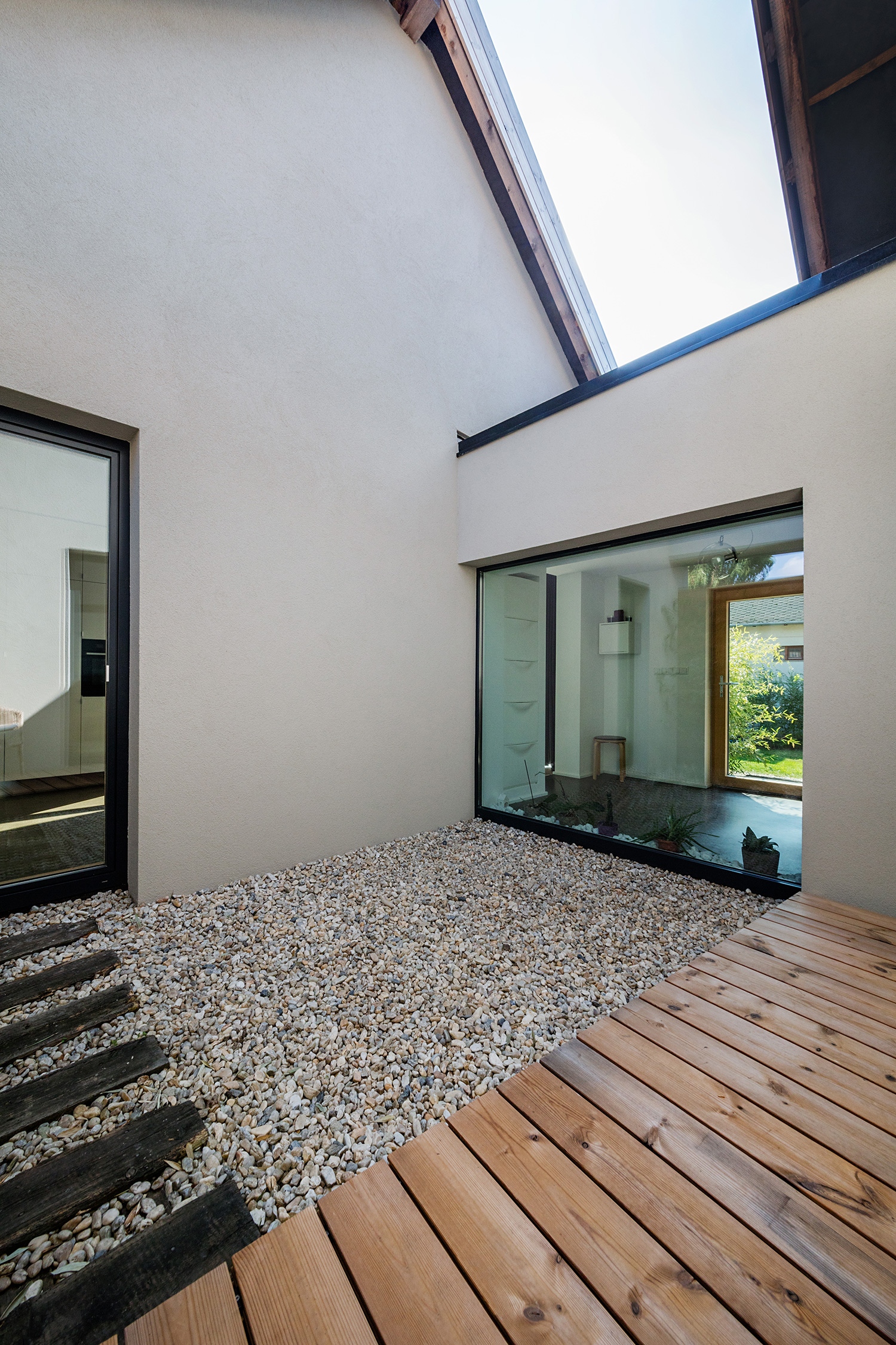 Régi és új között nem pusztán a vakolat-tégla, továbbá a faburkolat kontrasztja jelöli ki a határokat, hanem a tetőidomon látható bátor, izgalmas beharapás, lényegében egy áttörés, ami alatt bájos „bevilágító-udvar”, kicsi belső átrium található. Trükkös időkezelést látunk tehát Papp László épületén, hiszen a régi pajta helyére kerülő új épületrész és a felfrissült homlokzatú utcai traktus úgy képes megidézni a régi épületkontúrt, eredeti anyaghasználatot, az eredeti szalagszerű hosszanti parasztház hagyományát, hogy semmiféle nosztalgikus, negédes gesztust sem fedezünk fel. Jó megoldásnak tűnik, hogy az épületrészek kapcsolatát tovább erősíti a belső közlekedő vonalát lekövető, keretezett terasz is, ami a családi ház bejárati traktusát is kijelöli.