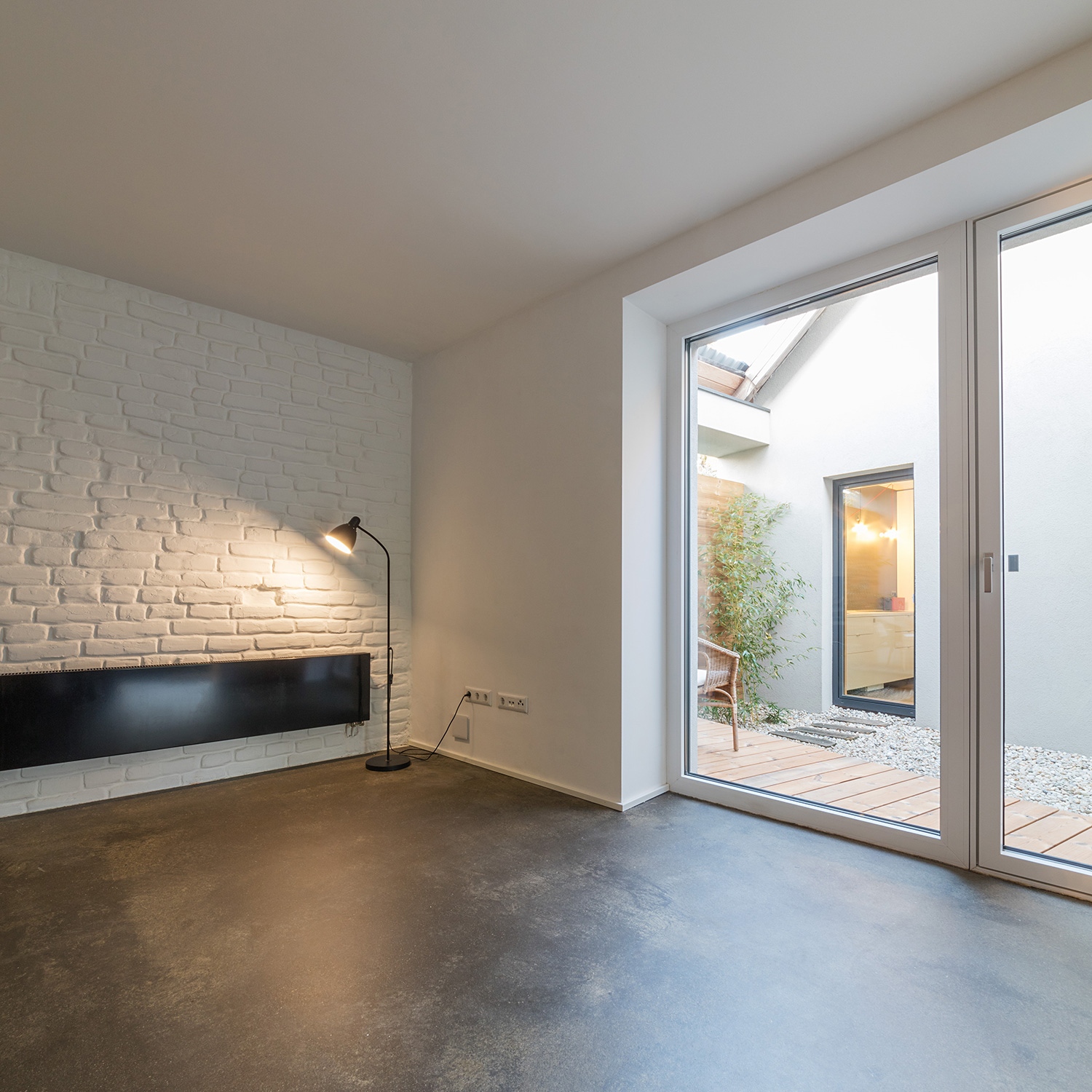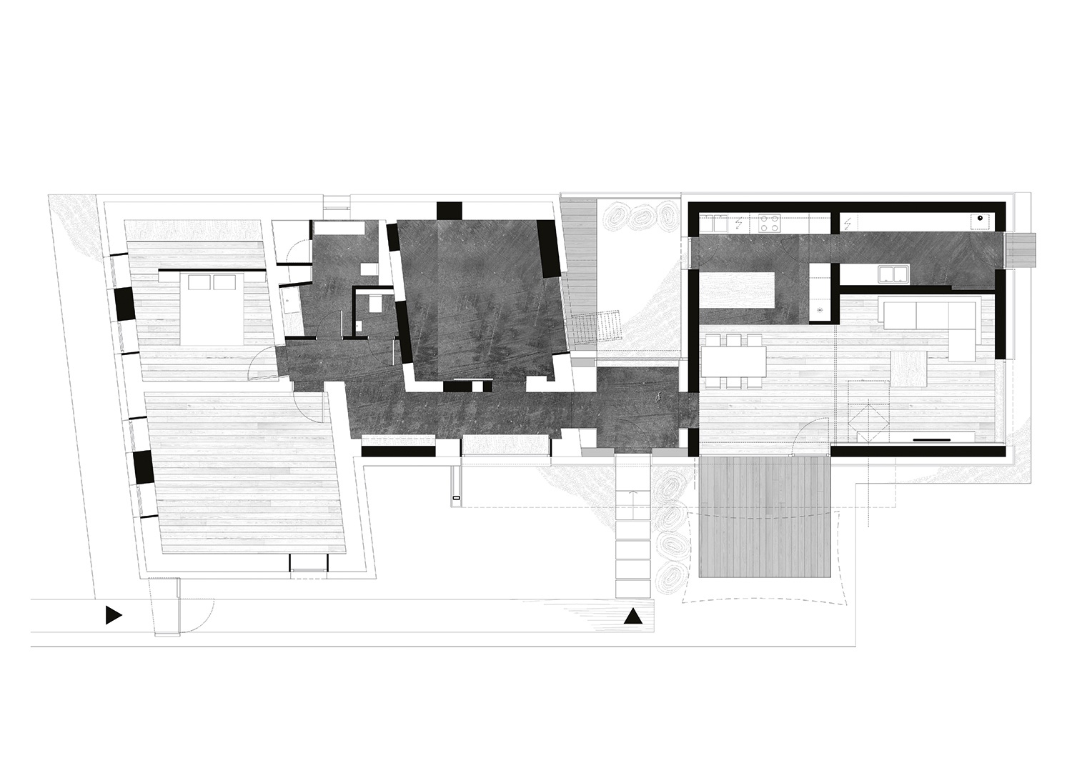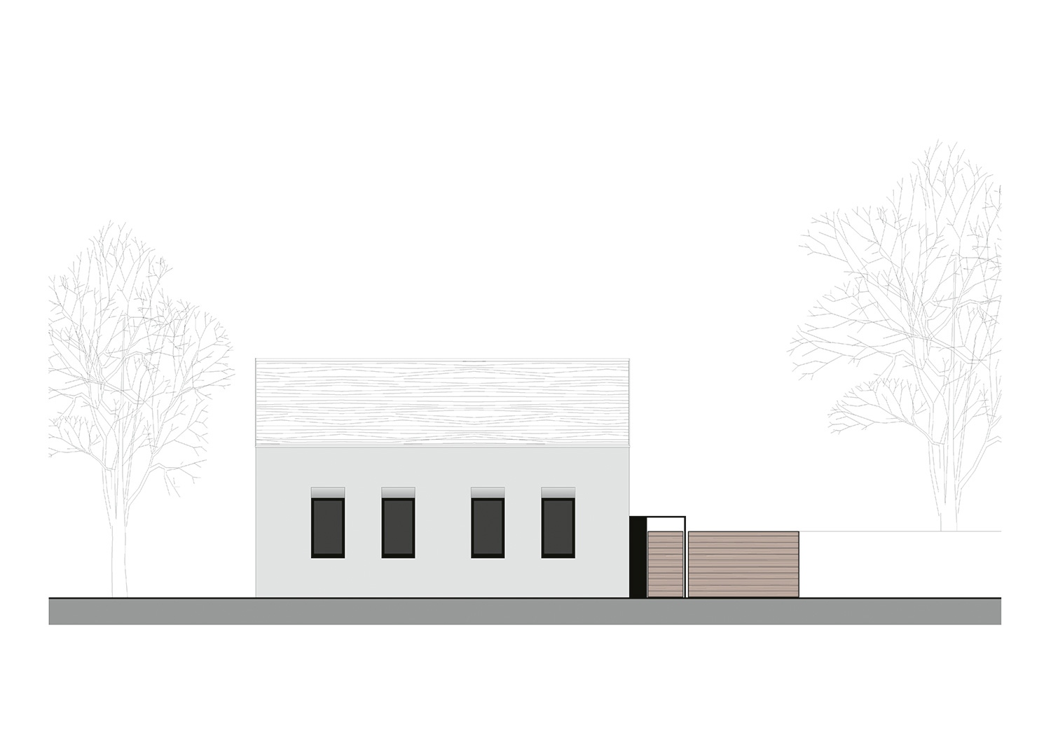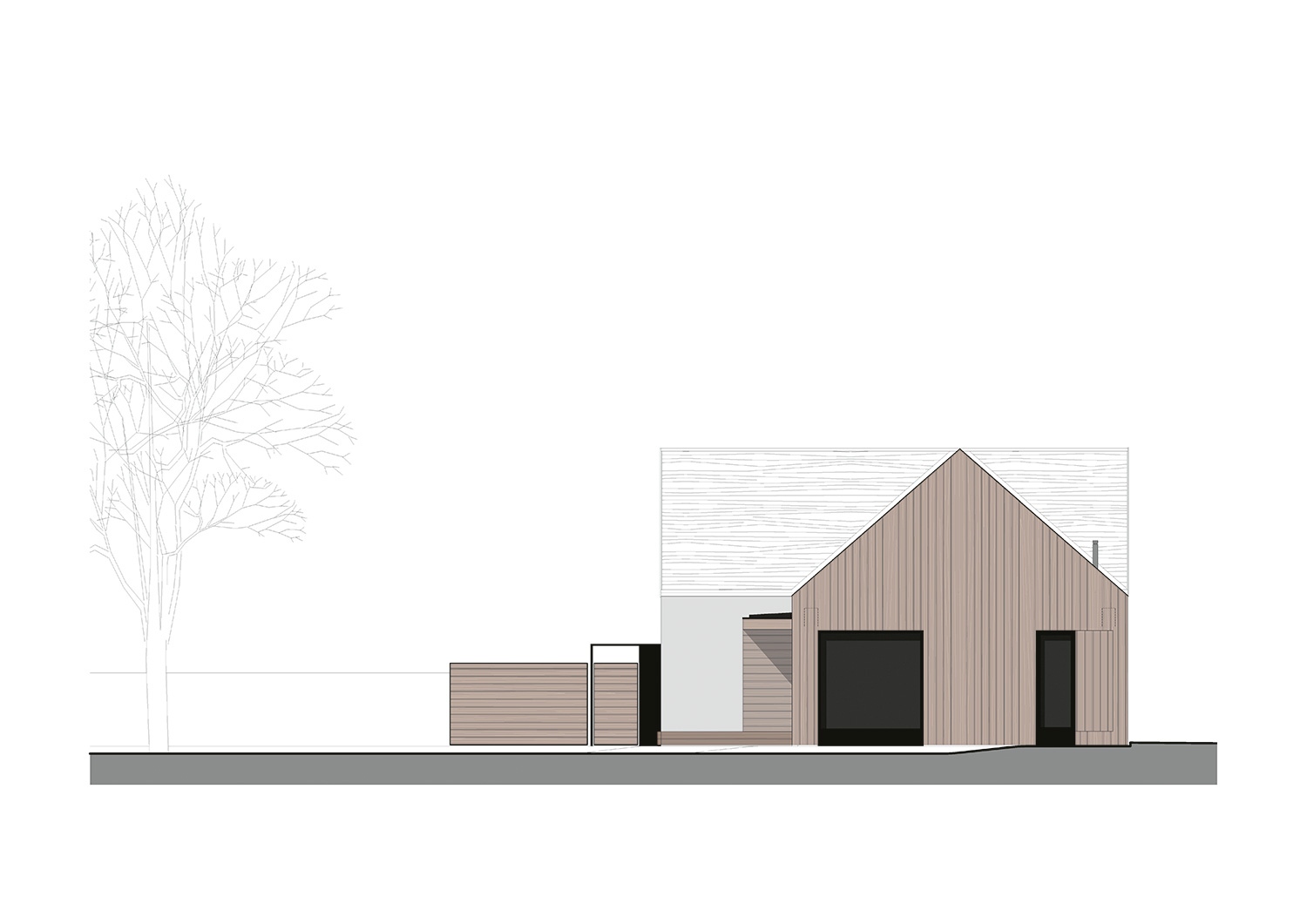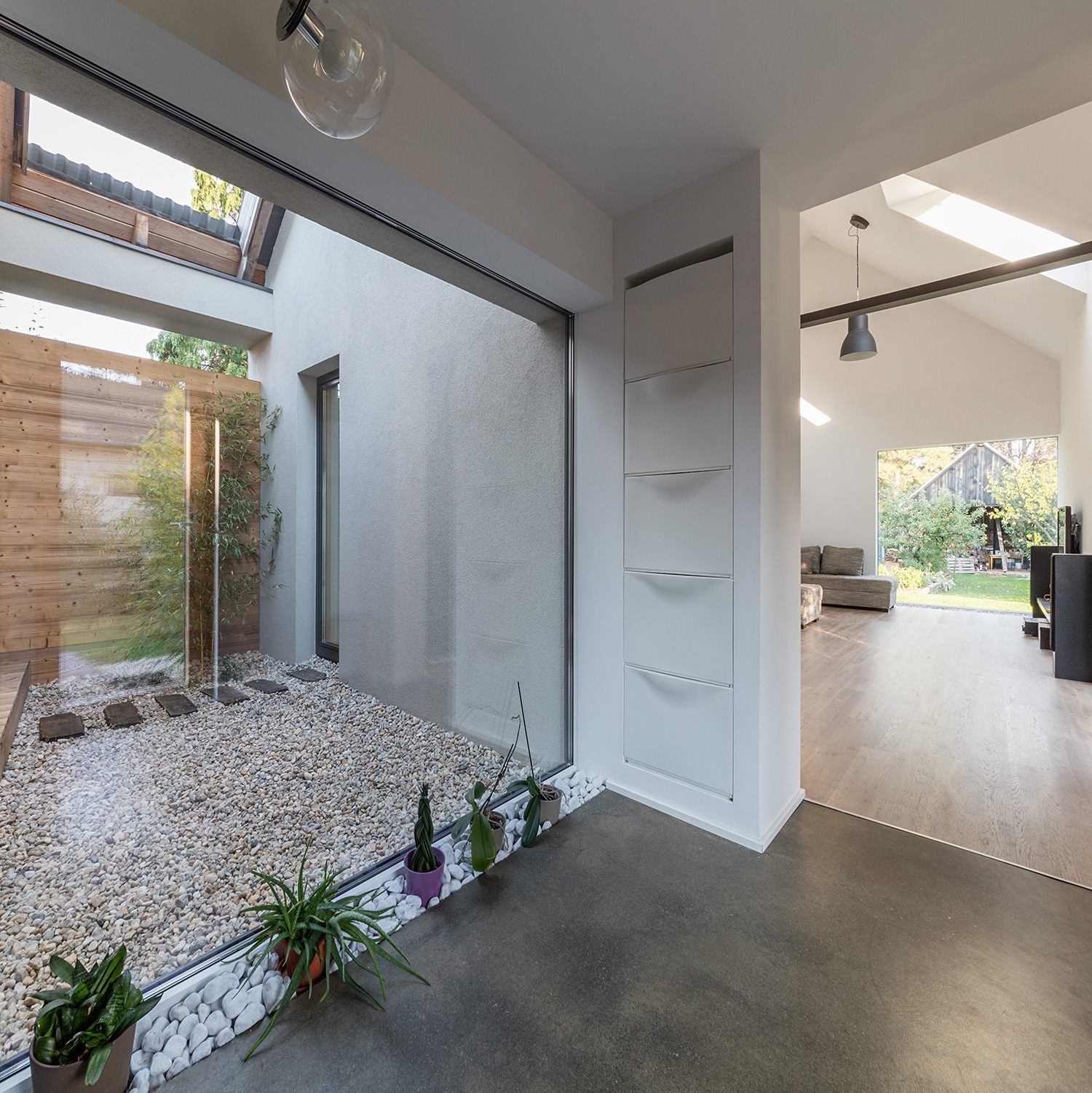 Egy generációk óta a család birtokában lévő ház és kert transzformációját látjuk itt, ahol az utcafronti egykori lakóházhoz egy pajtatoldalék csatlakozott a kert felől. Ez a százéves épületelem adja az elemzés és szerkesztés kulcsát: tulajdonképpen az történt, hogy a téglaházról leválasztott faszerkezetes, rozogán is gyönyörű, rusztikus deszkázatú, imitt-amott girbegurba tartószerkezetű, tolóajtós gazdasági épületet a kert végébe hátradaruzták. Így a pajta kontúrját átvéve, annak eredeti helyén született meg a nappalit, konyha-étkezőt magába foglaló, teraszos új építés.