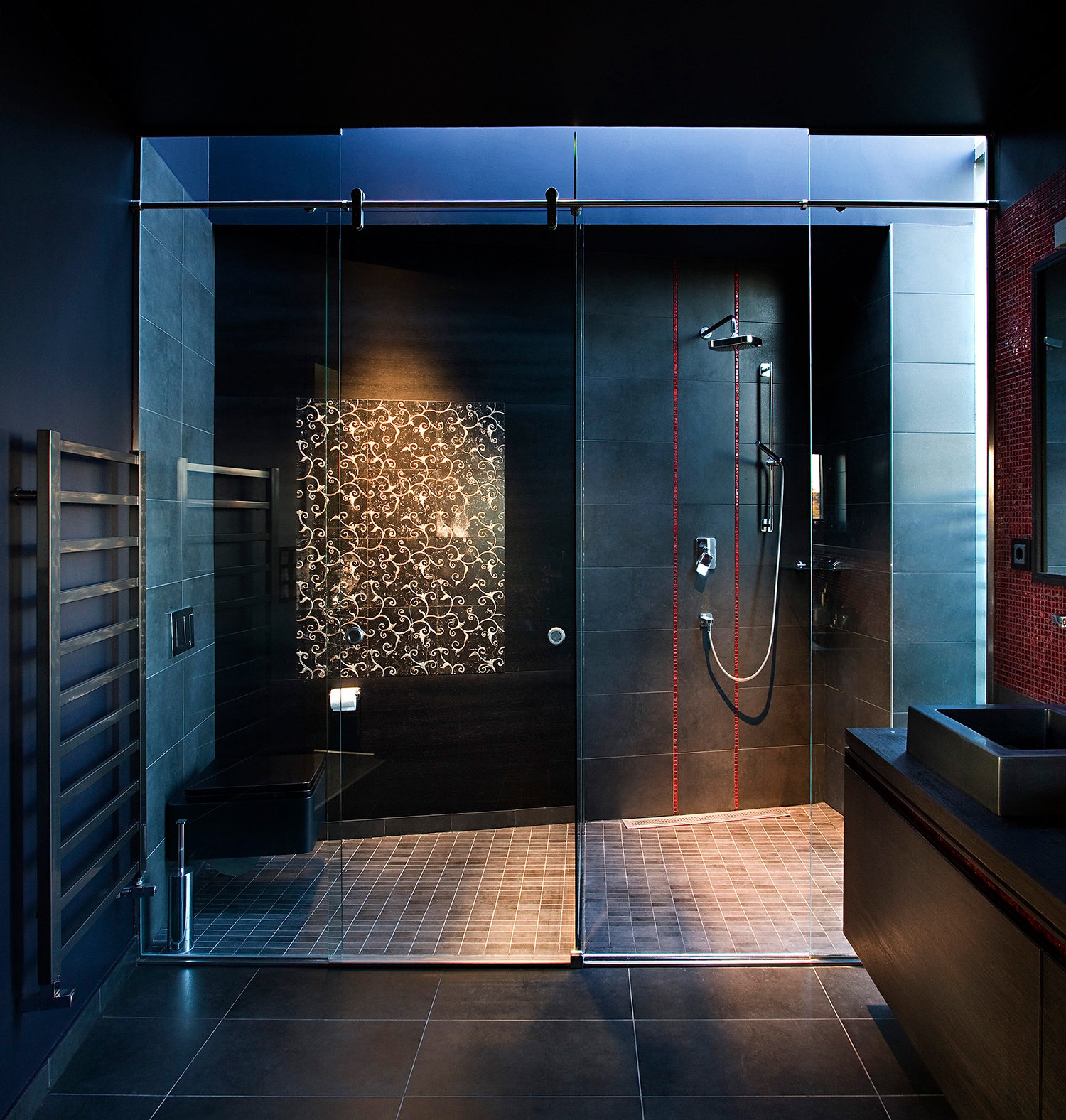 Az emeletre vezető korlát nélküli „lebegő” lépcsősor nappal átereszti futurisztikus hatást kelt, lila színű spotlámpasorral megvilágítva. Az emelet egyik felét a gyerekek birodalma foglalja el, míg a másikat a szülők lakosztálya, a kényelmes és elegáns hálószoba, amely a déli oldalon terasszal kapcsolódik a kerthez. A házat szinte teljesen kettéválasztja a fölül végigfutó tetőablak csíkja.