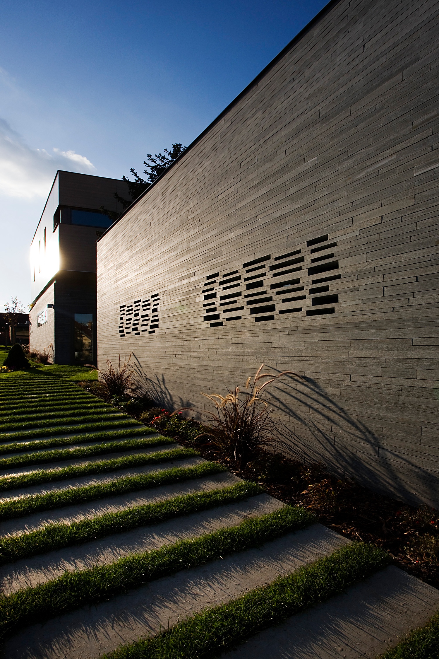GPS igazít útba, kíváncsian nézzük a házakat, vajon melyik lehet az? A perforált fémkerítésnél már tudjuk, jó helyen járunk, és leparkolunk. Az utcafront északkeleti irányú, a telek tájolása ideális. Kifelé erődszerűen zártnak tűnik az épület, első óriási építőkockája a garázs. A tervező koncepciója szerint a ház alsó szintje olyan, mintha egyetlen kőtömbből faragták volna – olasz bányából hozatták a szép szürke színű természetes követ, amelyet speciális formára vágattak. A Trespa lapokkal burkolt fölső szint pedig olyan, mintha az alsó fölött lebegne. A garázs és a lakótér között jó nagy fenyőfa áll, a háziasszony kérésére köré tervezték az épületet.