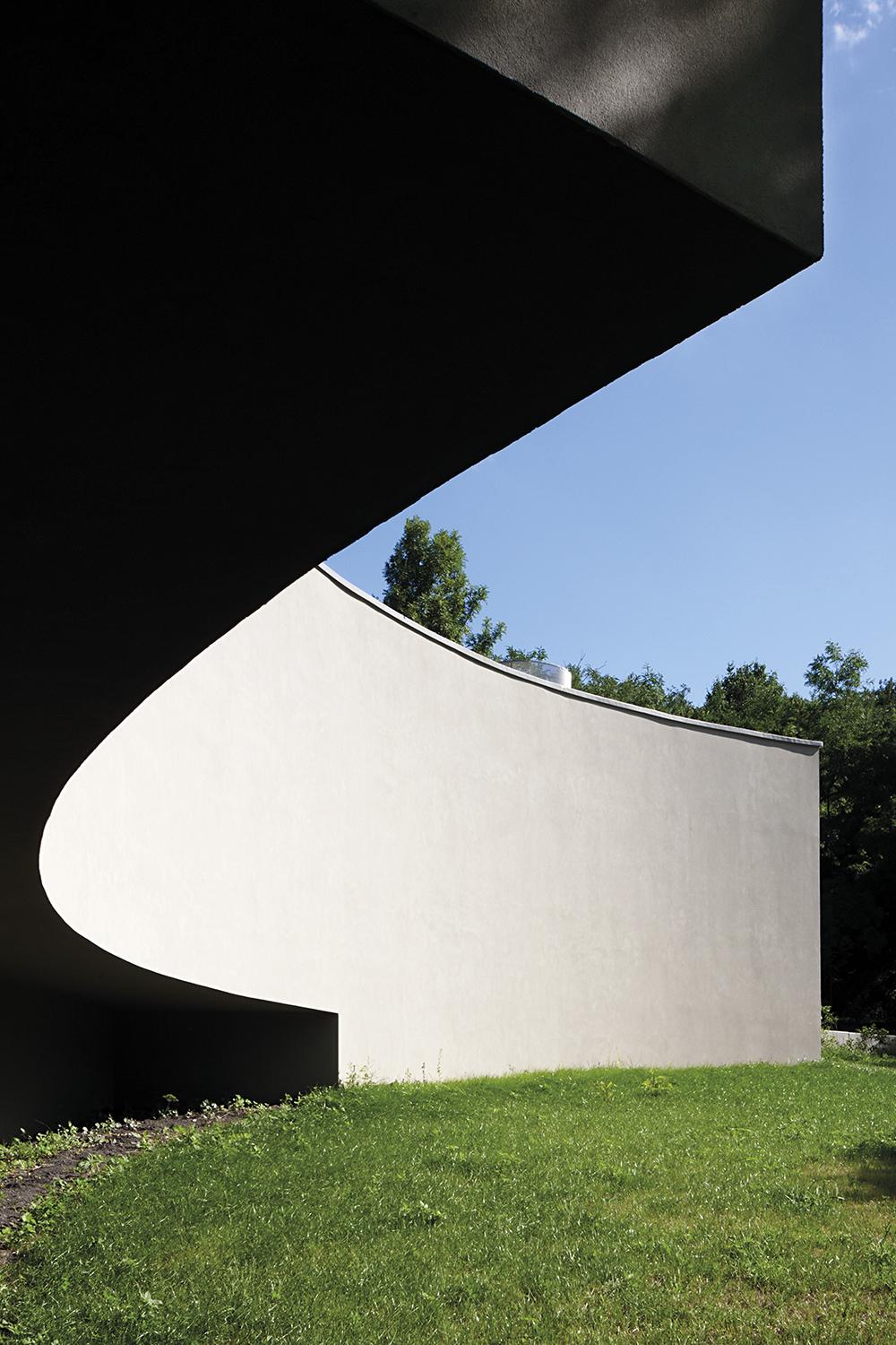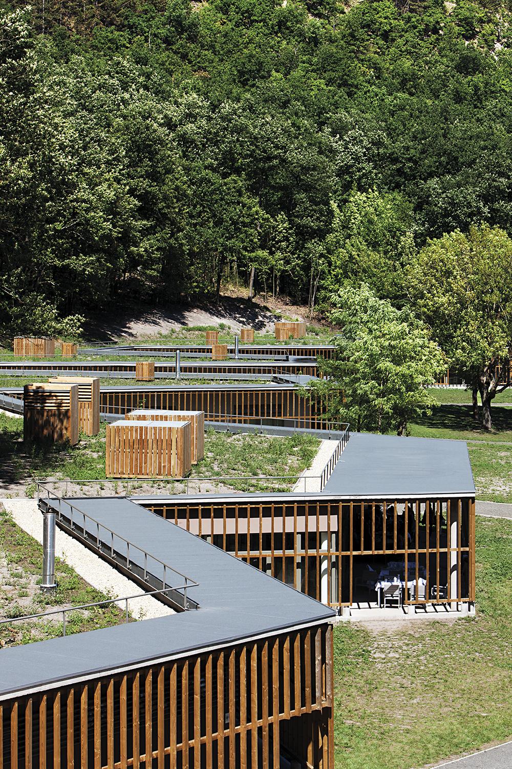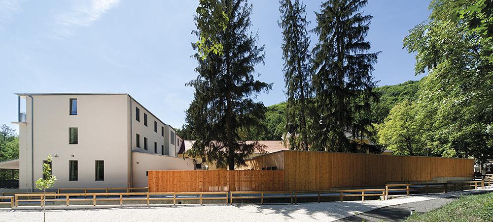 A meglévő történeti épületek renoválása és adott esetben bővítést is jelentő rekonstrukciója kimért precizitással végrehajtott munka lett – az összkép a gyalogos járófelületektől, a nyílászárókon át a hagyományos gerendás fafödémek megjelenéséig gondos mérnöki munka eredménye, mely a tapintható részletekre koncentrál. A szállásház semlegességre törekvő puritánsága mellett a fogadóépület up-to-date szellemi frissessége pedig magával ragadó. A funkcionálisan precízen illesztett belső oldali, buszfordulóhoz alkalmazkodó nyers vasbeton oszlopos tornác már említett egyöntetű tisztaságához finoman cizellált hátsó homlokzat tartozik. A meredek lejtésű terep adottságaiból művészien könnyed kompozíció serken: íves visszametszésekkel konvex épülettömegek lebegnek be a kis liget fáinak lombkoronái közé. Nehezen észlelhető, szimbolikával telített utalás ez – a tervező személyes útja. A kinyújtott tésztából kiszakított ostyák fennmaradó lapja ez, a minta transzformációja – mely a hiányra utal. Mely csak a kereséssel, a követéssel, az út megtételével lesz újfent teljessé. Személyes stációelemek sorakozó ritmusán keresztül válva egésszé.