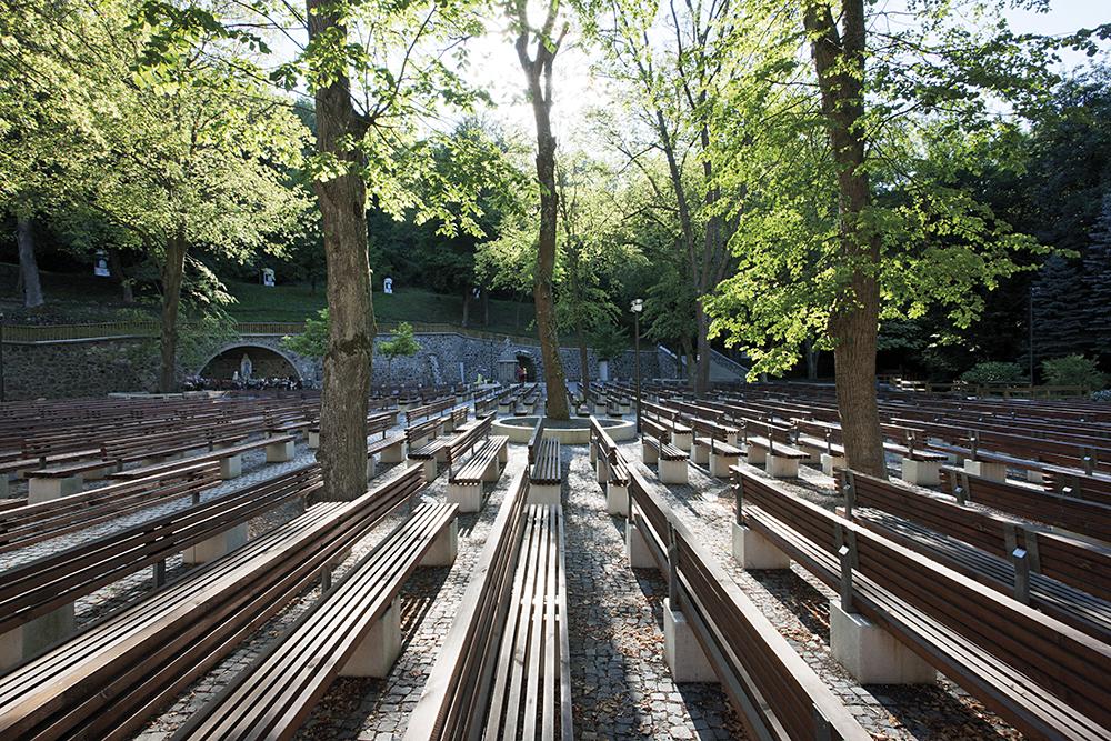 Felhőket át-áttörő még erőteljes napfény, friss, ősziesen hűvös szellő. A hétvégén tízezrek közösségében felszentelt épületegyüttes – ma, hétköznap, csend. A fákon még termések, éppen sárgulni kezdenek levelek. Az erdő gazdag hangokkal, néha gördül bele egy-egy autó gépies zöreje. Távolban a természet nemes szépséget kutató kirándulók, kutyájuk vidáman csahol bele a levegőbe, domboldalak visszhangja teszi teljessé a hang szabadságát. A felkapaszkodó völgy magaslatából érkező szél még lombokat suhogtat, az egyéni és kiscsoportos zarándokok beszédhangjait felerősítve kapja fel. Nyugodt csend néhány nappal a zajos zarándoklat után.