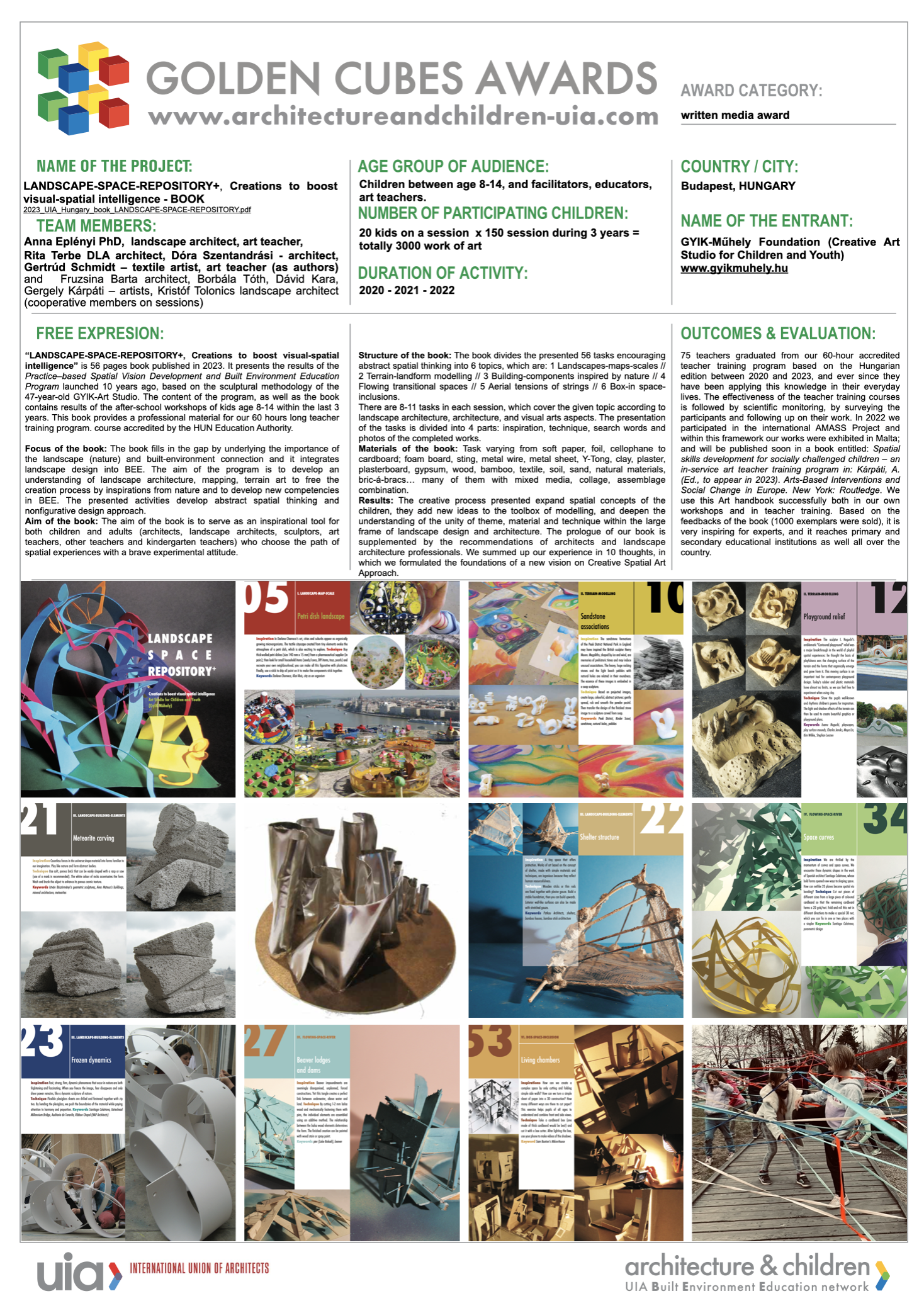 Az Építészek Nemzetközi Szövetsége (UIA) kihirdette az UIA Építészet és Gyerekek munkaprogramja által szervezett, ötödik alkalommal megrendezett Golden Cubes Awards eredményeit. Az épített környezeti nevelés területén létrehozott díjat 4 kategóriában ítélik oda, ezek az Intézmények, az Iskolák, a Nyomtatott média és az Audiovizuális média.