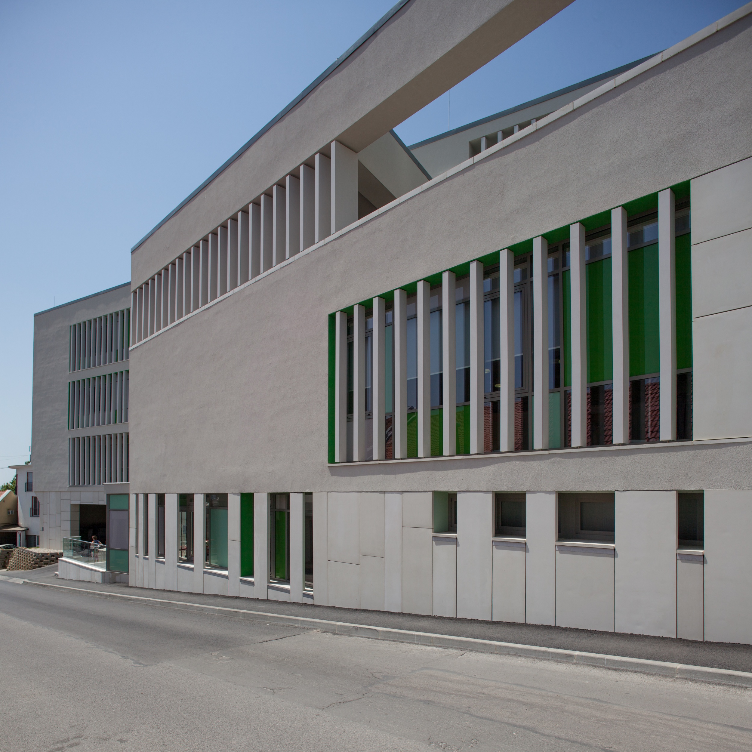Az épület homloksíkját az üvegfalak és ablakok csak a feltétlenül szükséges helyeken törik át, és általában mélyen a homlokzatsíktól visszahúzva, szinte rejtőzködve bújnak meg a díszítő-védő, és egyben részleges árnyékolást is adó keskeny függőleges épületelemek, a lamellák mögött. Ez a szigorú, függőleges osztást adó lamellasor (bár azt is megtehetné) mégsem a börtönszerű bezártság érzetét kelti, hanem megnyugtató biztonságot, védelmet sugároz. Visszatükrözi a kórtermekben, és vizsgálókban naponta megforduló betegeknek életük e meghatározó szakaszában (gyakran a lét és nemlét határán) önmagukkal és a világgal egyaránt viaskodó, néha magukba forduló, de mégis reményekkel teli, a külvilággal való kapcsolatot titokban igénylő érzelemvilágát. Ezt a kifelé fordulást, a külvilág szépségei iránti vágyakozást fogalmazzák meg a lamellák mögött rejtetten meghúzódó, de a falakon túli világra színekkel és üvegfelületekkel kinyíló ablakok és üvegfalak.