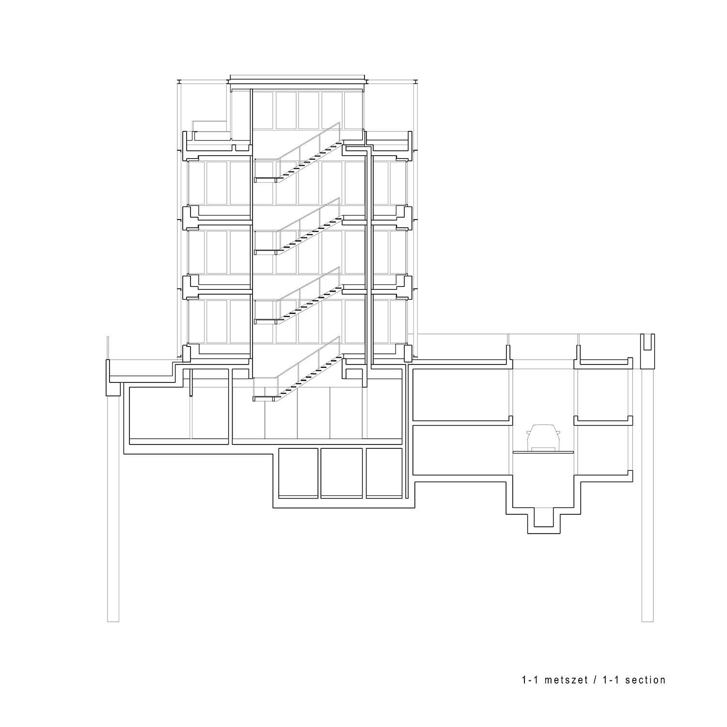 Turányiék a megbízó mélyépítő cég székházának esetében azonban pontosan azzal a lehetőséggel kezdtek el foglalkozni, hogy mi történnék akkor, ha ez alapkonstrukció nem játszana alárendelt szerepet a felépítmény megvalósításában, hanem a térszín alatt is esztétizáló, teljes értékű terekre törekvő építészeti elbeszélés jelenne meg, amire ráadásul nem ráépülne, nem kitöltené a székház felépítménye, hanem mintegy annak külső kontúrjából visszahúzva növesztenék ki az épület tartószerkezetét, emeleti födémet. Nem elváló rétegek valósulnának meg tehát, hanem egy szervesebb kapcsolat a két fő szerkezeti alkotóelem között.