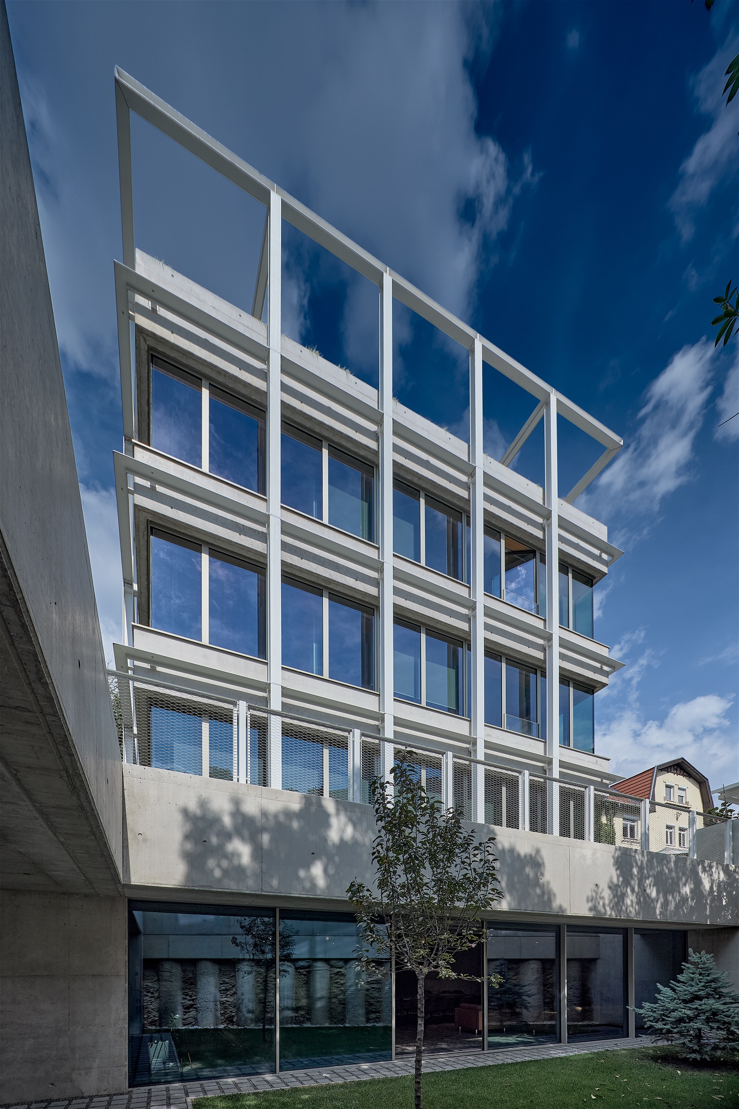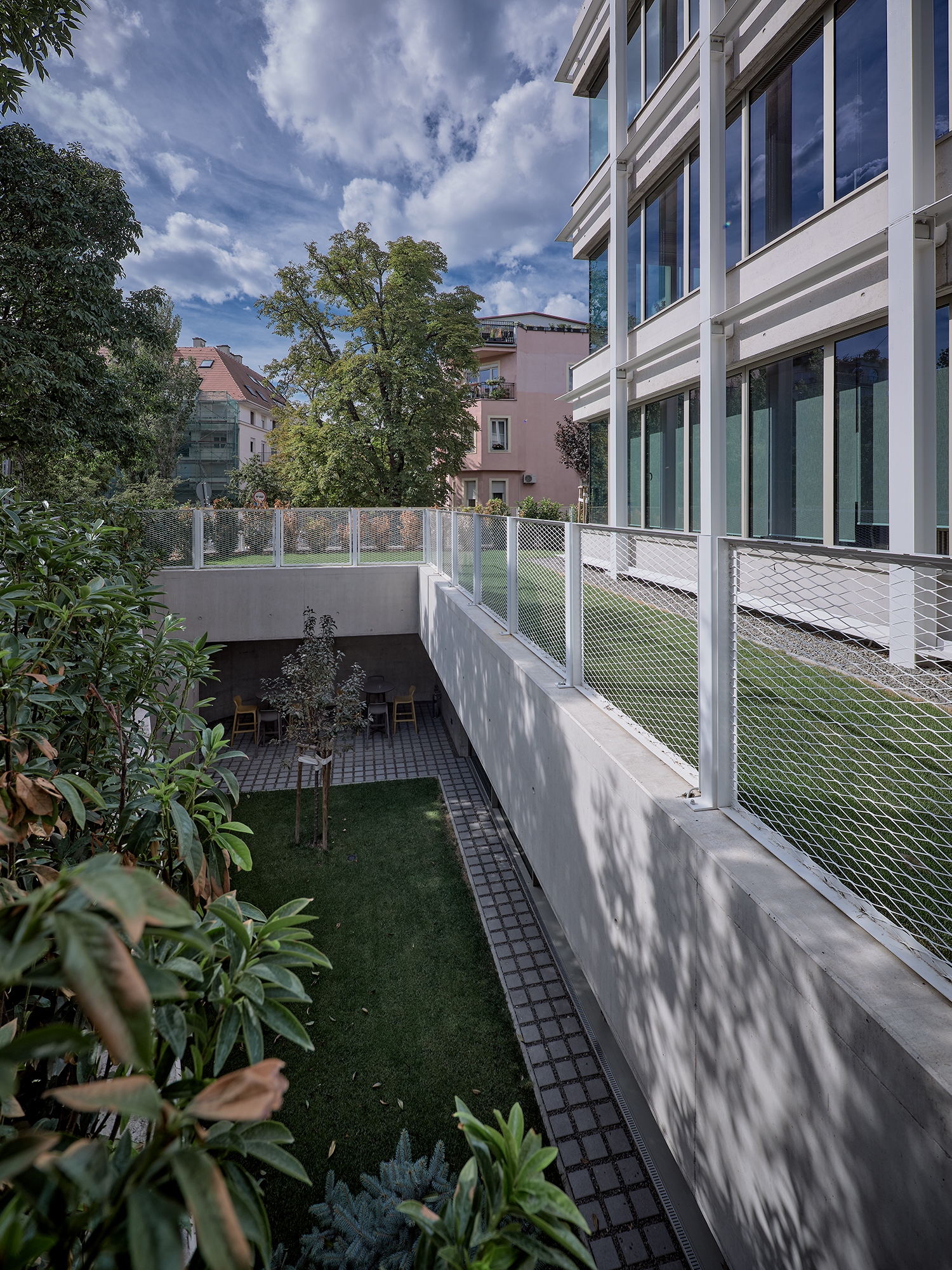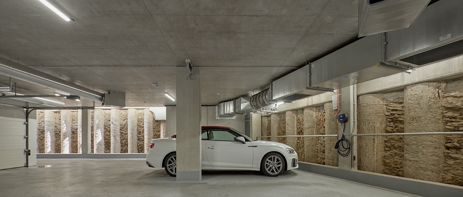 Az irodaterekre és erre a térre is igaz, amit az építész mondott: a végeredmény tulajdonképpen olyan, mintha szintenként egy-egy elegáns, modern villalakás jött volna létre. Ebbe az eleganciába ráadásul még egy összetevő is közrejátszik. A tervezőknek sikerült az összes gépészeti elemet elrejteni, így sem a kertben, sem az épület tetején nem éktelenkednek gépészeti elemek, miközben a ház a legkorszerűbb hőcserélő, hőszivattyús rendszerekkel szerelt, míg a teremgarázs használatát nem a hagyományos, de hatalmas helyigényű lehajtóval, hanem gépkocsiliftekkel oldották meg.