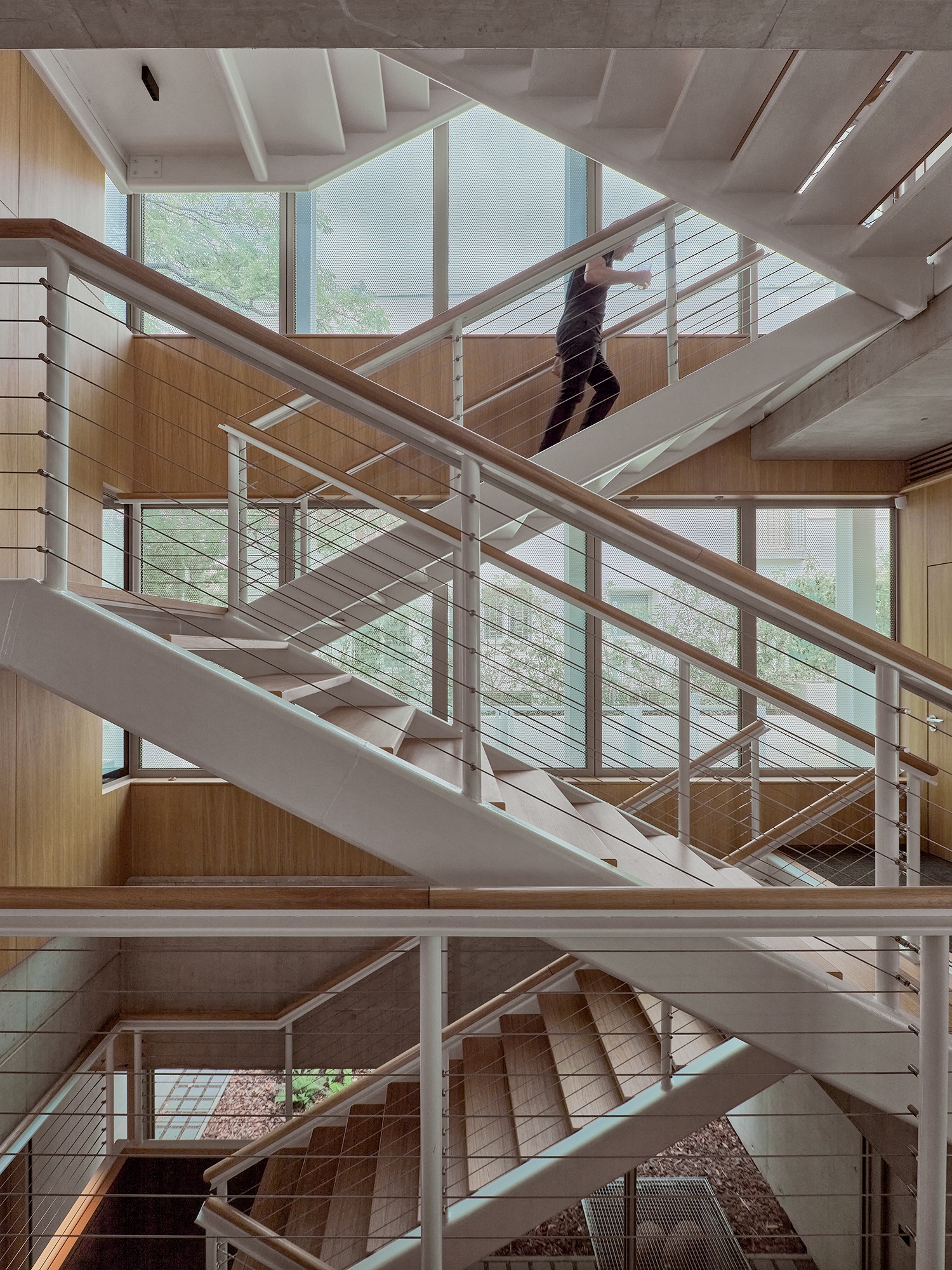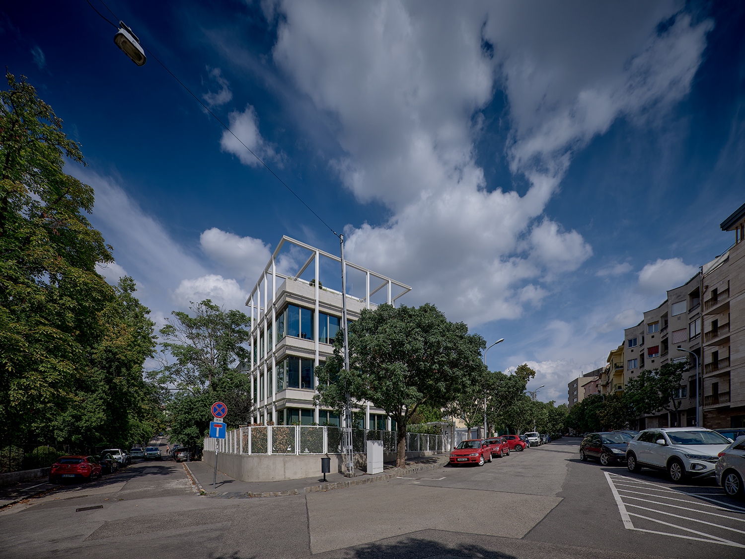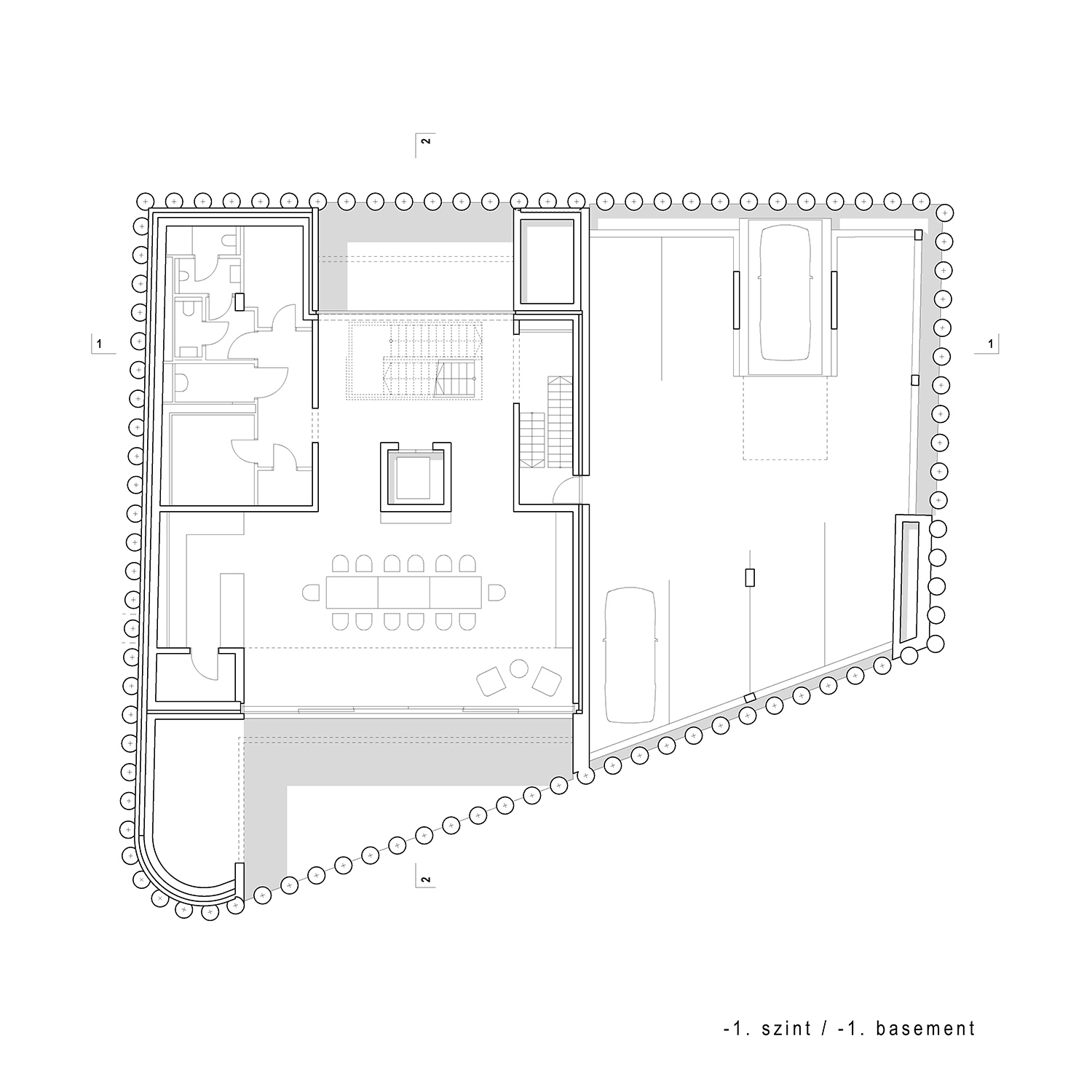 Az irodaterekre és erre a térre is igaz, amit az építész mondott: a végeredmény tulajdonképpen olyan, mintha szintenként egy-egy elegáns, modern villalakás jött volna létre. Ebbe az eleganciába ráadásul még egy összetevő is közrejátszik. A tervezőknek sikerült az összes gépészeti elemet elrejteni, így sem a kertben, sem az épület tetején nem éktelenkednek gépészeti elemek, miközben a ház a legkorszerűbb hőcserélő, hőszivattyús rendszerekkel szerelt, míg a teremgarázs használatát nem a hagyományos, de hatalmas helyigényű lehajtóval, hanem gépkocsiliftekkel oldották meg.