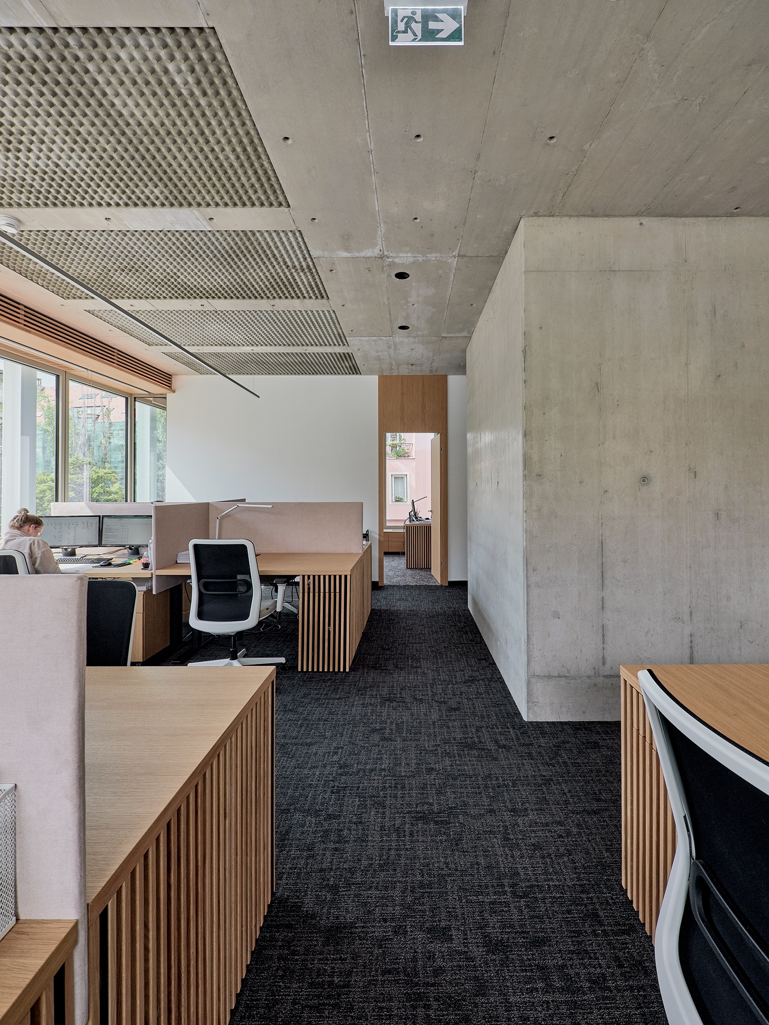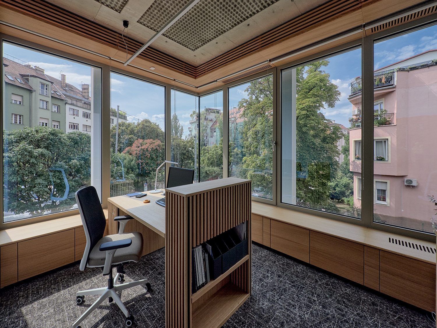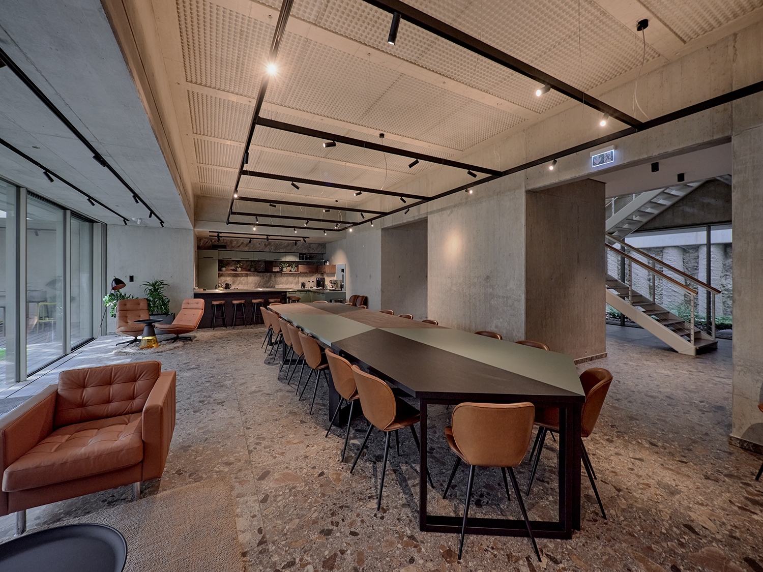 Kulcselemmé vált tehát az a koncepció, ami abból indult ki, hogy az építészeti szerkezet esztétikuma, feltárulkozó szépsége, az épületszerkezet őszinte megjelenítése valódi értékeket hordoz. „Mint egy ókori épület régészeti feltárása.” Ezt a mondatot szerkesztő kollégám mondta ki, amikor az első fotókat átnéztük a cölöpözéssel kialakított, légaknával (angolakna) feltárt földszinti közösségi térről és parkolókról készült fotókat. A legtöbbször eltűnő mélyépítési szerkezet felszínének archaikus, erőteljes kisugárzásától és látványától szinte földbe gyökeredzik a láb. Telitalálat! Az utcaszintek alatti titkos világ feltárulkozása, miközben pinceérzésnek nyoma sincs. A kivitelezés és kialakítás anyagszerűsége, illetve a közösségi irodatér bútorozása és belső tere, burkolatai is példátlan összhatást eredményeznek.