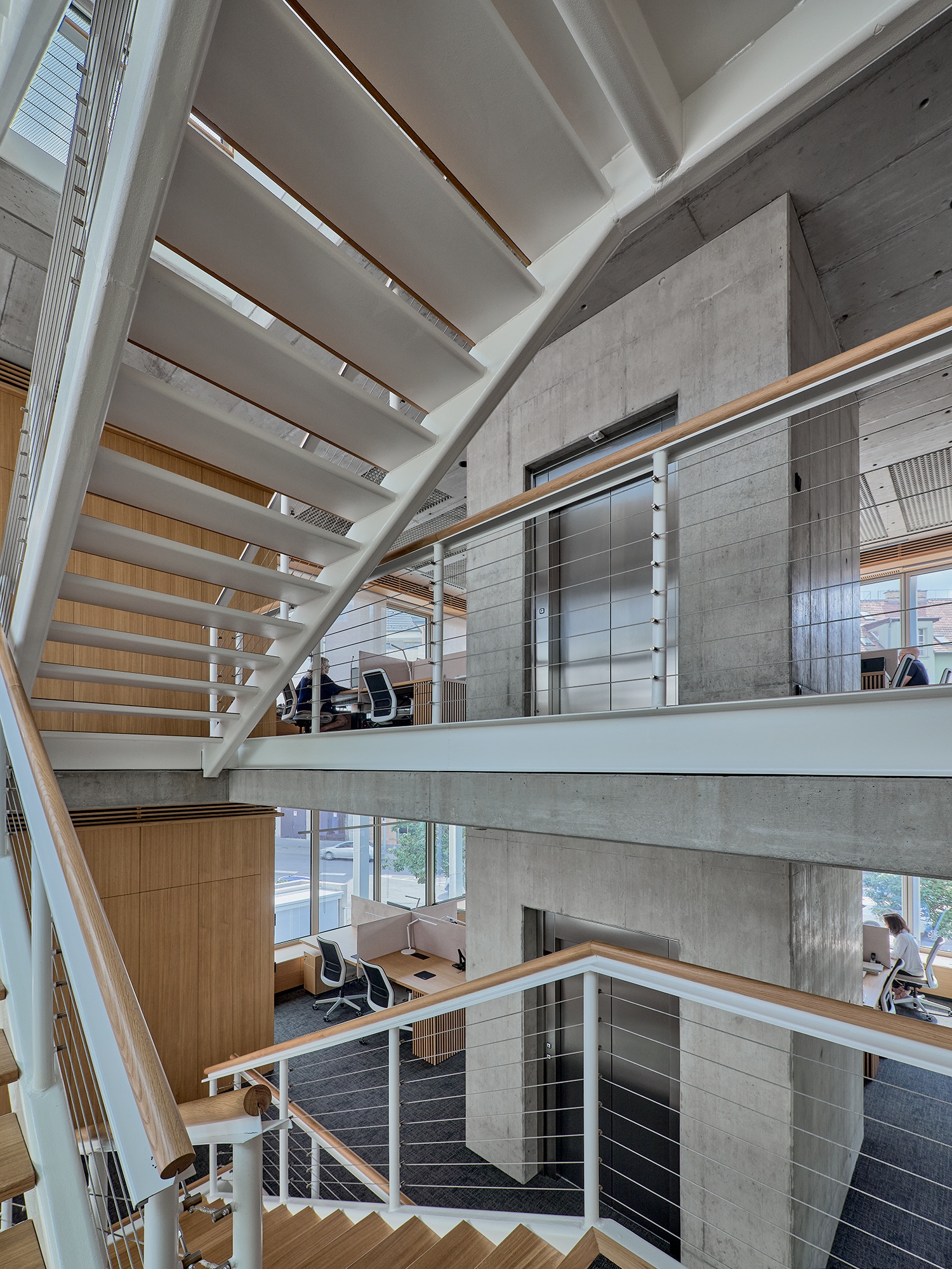 Ebben a logikában ráadásul az épület külső acélszerkezeti váza az irodai hasznos terekből sem vesz el, a visszafogott méretű irodaszintekben nem jelent belsőépítészeti problémahalmazt a belső oszlopok, pillérek jelenléte. Sőt! A külső tartószerkezet acéltartói a szerkezeti őszinteség homlokzati megjelenítése mellett egy filigrán vasbeton-liftmag, illetve egy lazán, légiesen és áttörten szerkeszthető lépcsőház beépítését tette lehetővé. Ez a struktúra a parapetmagasságtól kezdve a födémek vastagságán és az üveg nyílászárók méretén át a belső légkezelés gépészeti elemeinek elhelyezkedéséig, a beépített bútorok elhelyezéséig mindenre hatással volt.