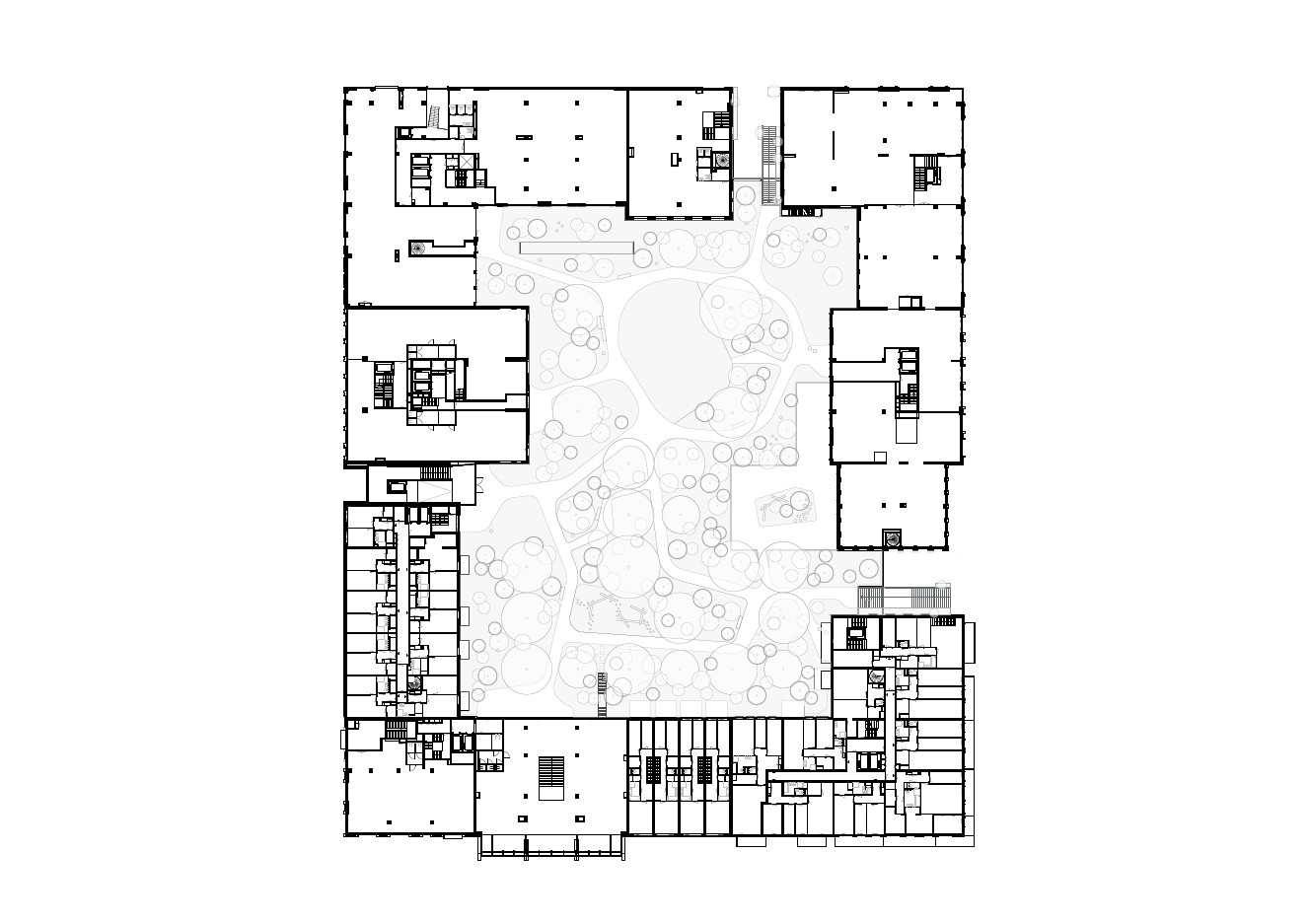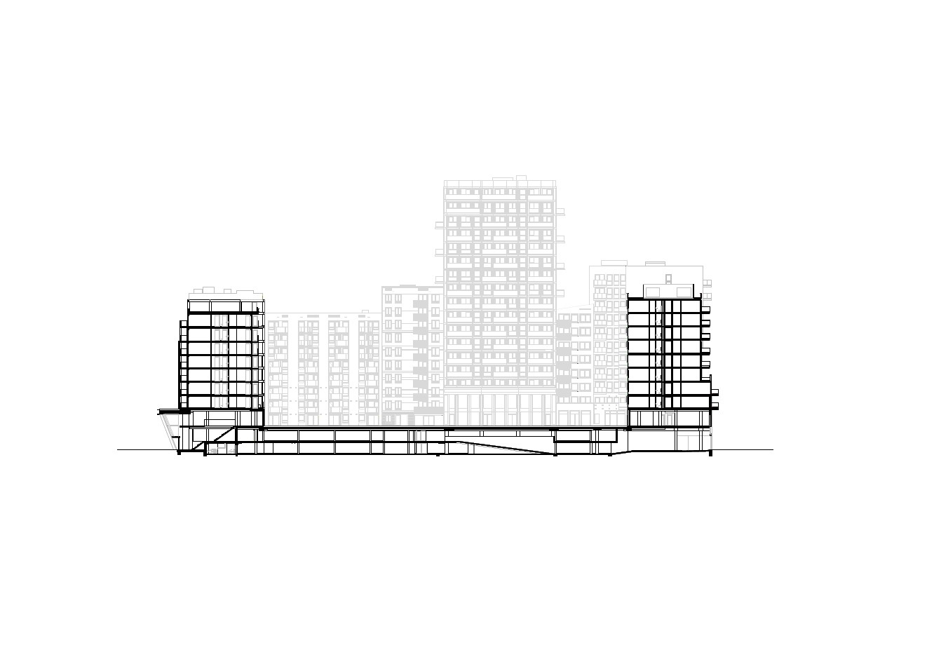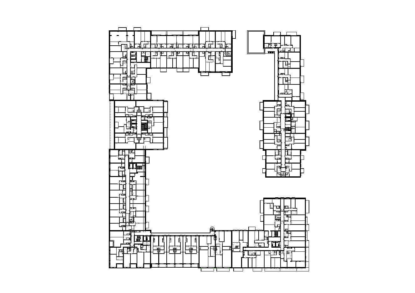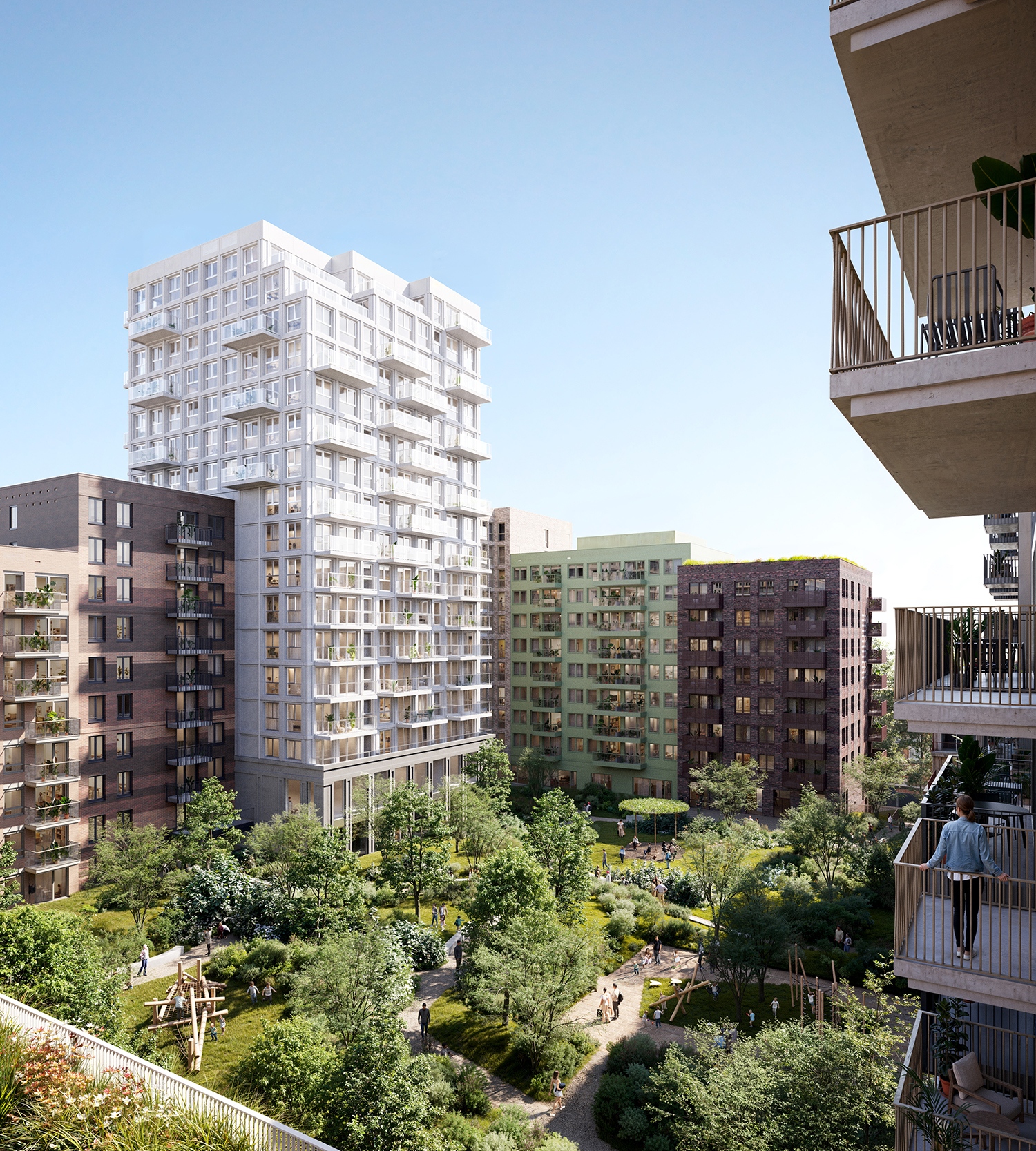 Egyedülálló kollaboratív modell, amelyben minden épület saját karakterrel bír, így hozva létre egy gazdagon rétegzett, mégis az emberléptékűség elvei mentén egységes együttest. Autómentes övezet, körforgásos anyaghasználat, CO2-optimalizált tervezés és biodiverzitást támogató, a hősziget-hatást mérséklő zöldfelületek. 575 lakás, 10 000 m²-nyi szolgáltatás, valamint irodai és kreatív terek – mindez egyetlen negyedben, 1000+ lakó és 400+ munkavállaló számára. Gazdagon részletezett földszinti zónák (plintusok), hangsúlyos bejáratok és a köz- és magánszféra közötti finom átmenetek segítik a közösségi élet kibontakozását. A nagy fesztávú, hatékony alaprajzi elrendezések biztosítják a terek rugalmas alakíthatóságát, garantálva a projekt hosszú távú relevanciáját.