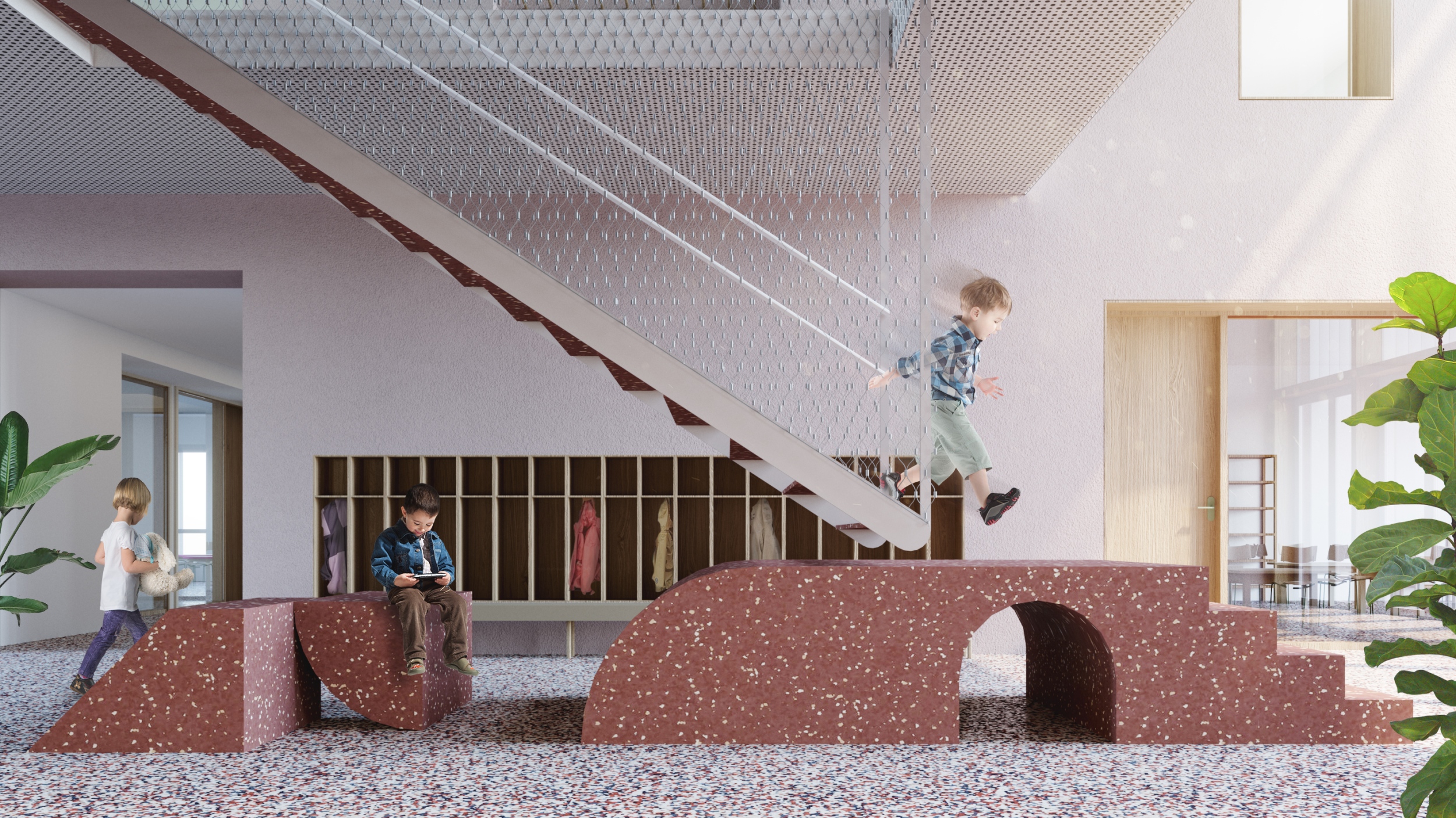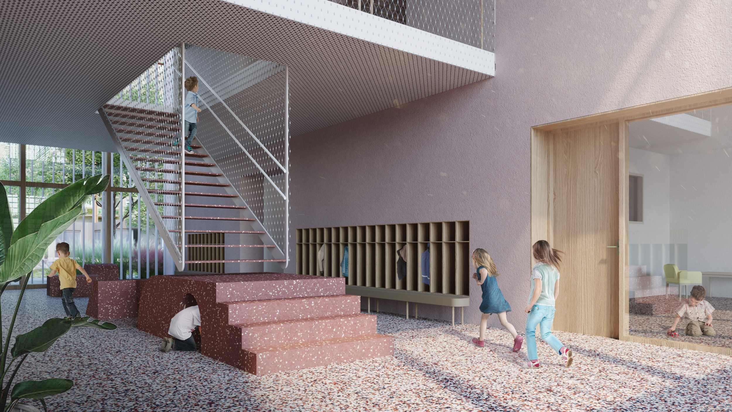 Ezekre a köztes épületrészekre négy-négy csoportszoba kapcsolódik, belső üvegezett felületekkel és átlátásokkal, izgalmas térélményt létrehozva. A galériákról egy-egy lépcső vezet az udvar irányába, amelyek az építőjátékok formáiból inspirálódott, játékos térbútorokra érkeznek.