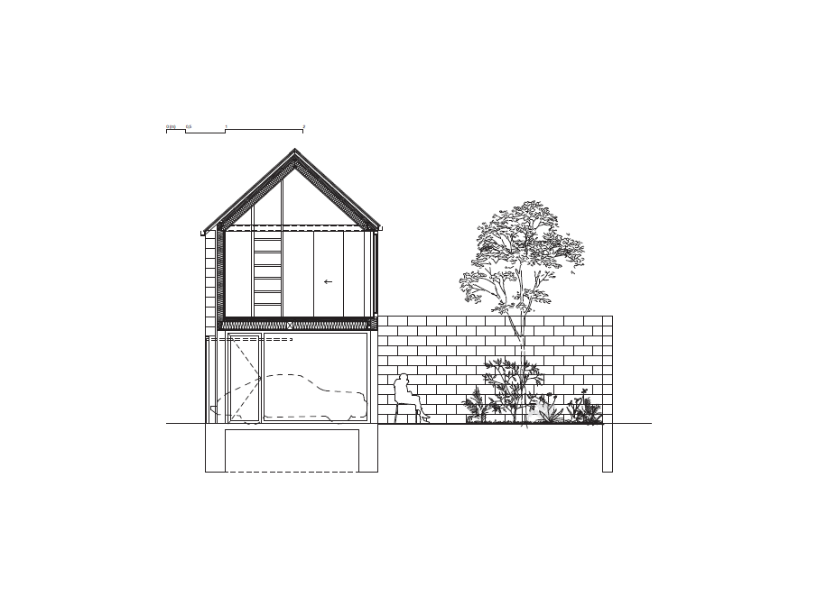A két irányából üvegezett alsó szint képezi az étkező-konyha tereit, közvetlen kapcsolatot biztosítva a kerttel, amely a minimalizált belső teret kiegészítve megnő, a kint-bent határa elmosódik. Az emeletre egy húzott karú lépcsőn keresztül érkezünk meg az egyterű nappaliba, mely a képlet folytatásaként teljes belső homlokzati felületével a kert felé kinyílik. A lépcső sávjában helyezkedik el a fürdő, felette pedig a tetőtérben kialakított hálóhelyiség.
