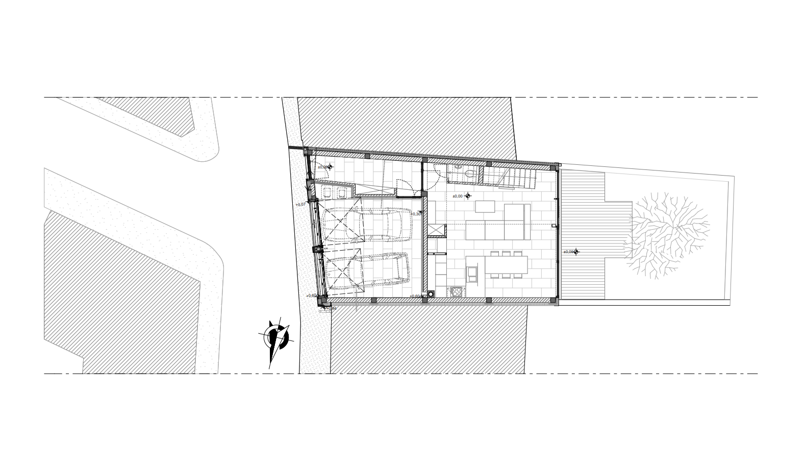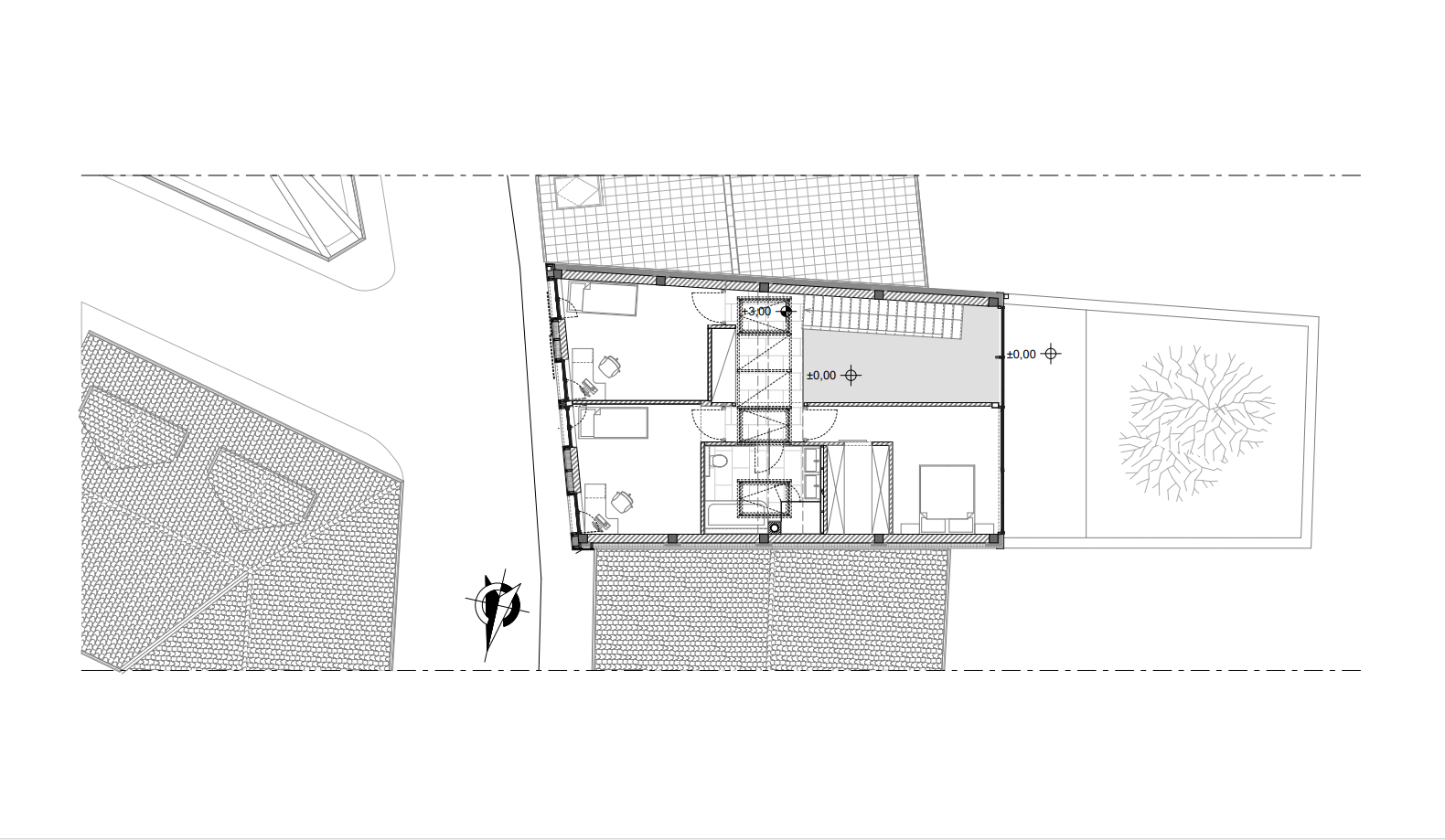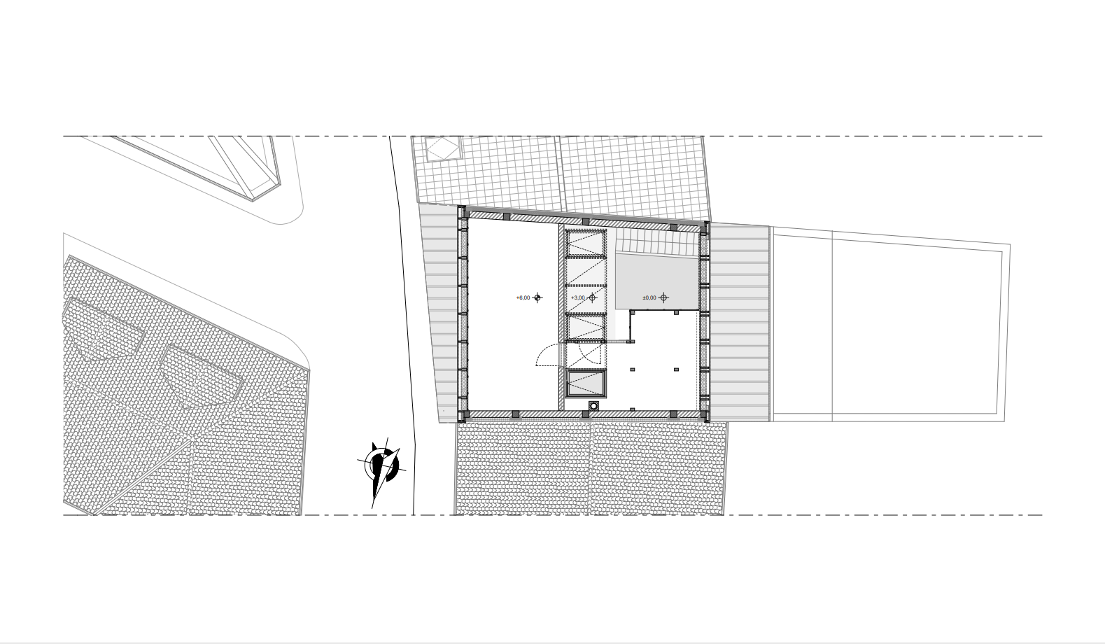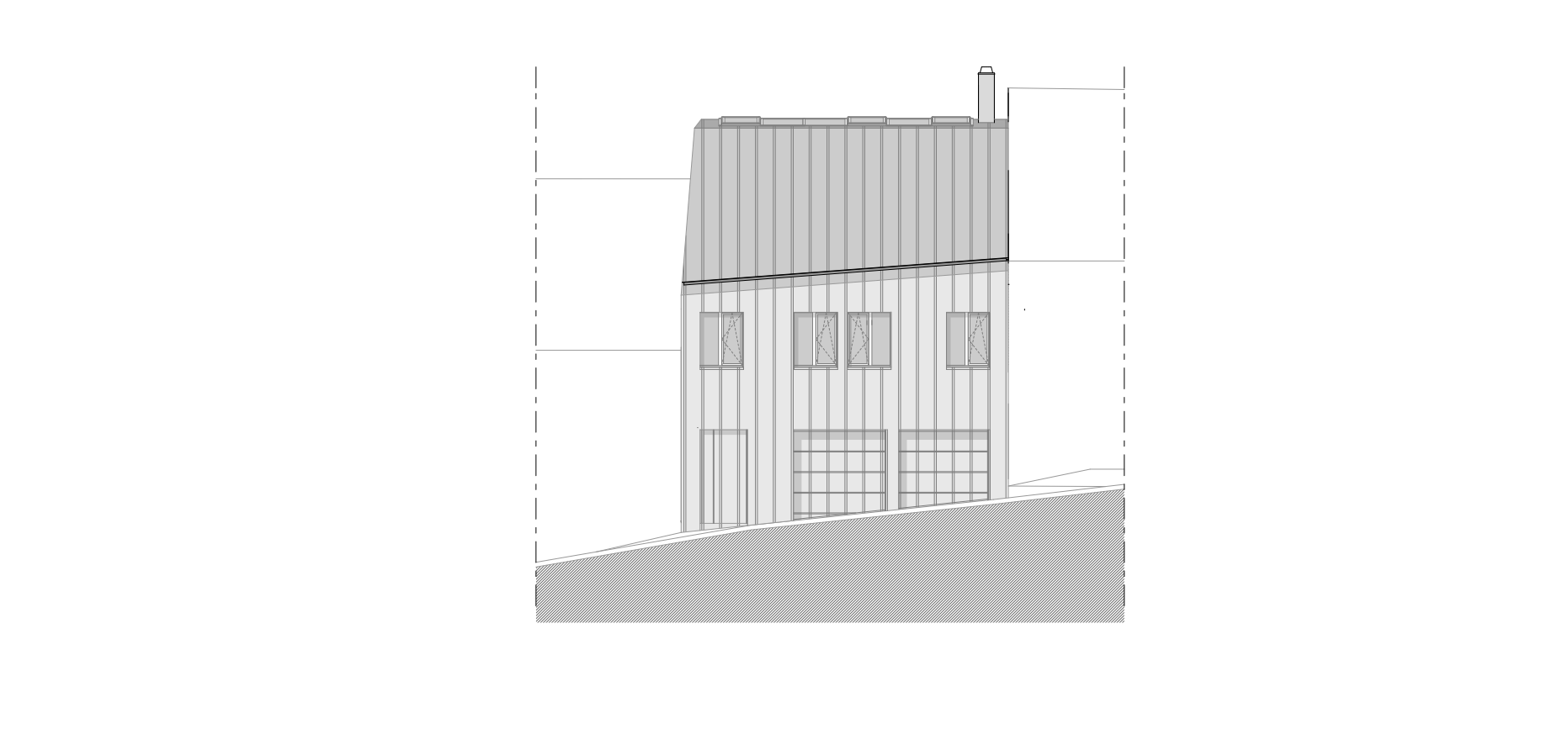 Ezúttal a pécsi óváros legizgalmasabb topográfiájú és településszerkezetű városrésze, Tettye nyugati határát kijelölő Szőlő utca egyik foghíjtelkén épült fel a környezethez való viszony radikális átértékelését tükröző lakóépület. A fiatal építtetők mértéktartó, mégis elegáns, egyúttal energiahatékony és környezettudatos otthont szerettek volna. A telek adottságai és az építési előírások igen intenzív beépítést generáltak: a mindössze 167 m2 alapterületű építési telken a 167 m2-nyi hasznos alapterület csak a telek maximális, 60 százalékos kihasználásával volt biztosítható. A szabályozás zártsorú, magastetős kialakítást írt elő, így alakult ki a földszint + emeleti szintből álló kb. 12,5x7,5 m méretű, kb. 6 méter magas, kétoldali szomszédjainak tűzfalaihoz tapadó, kompakt épülettömeg.