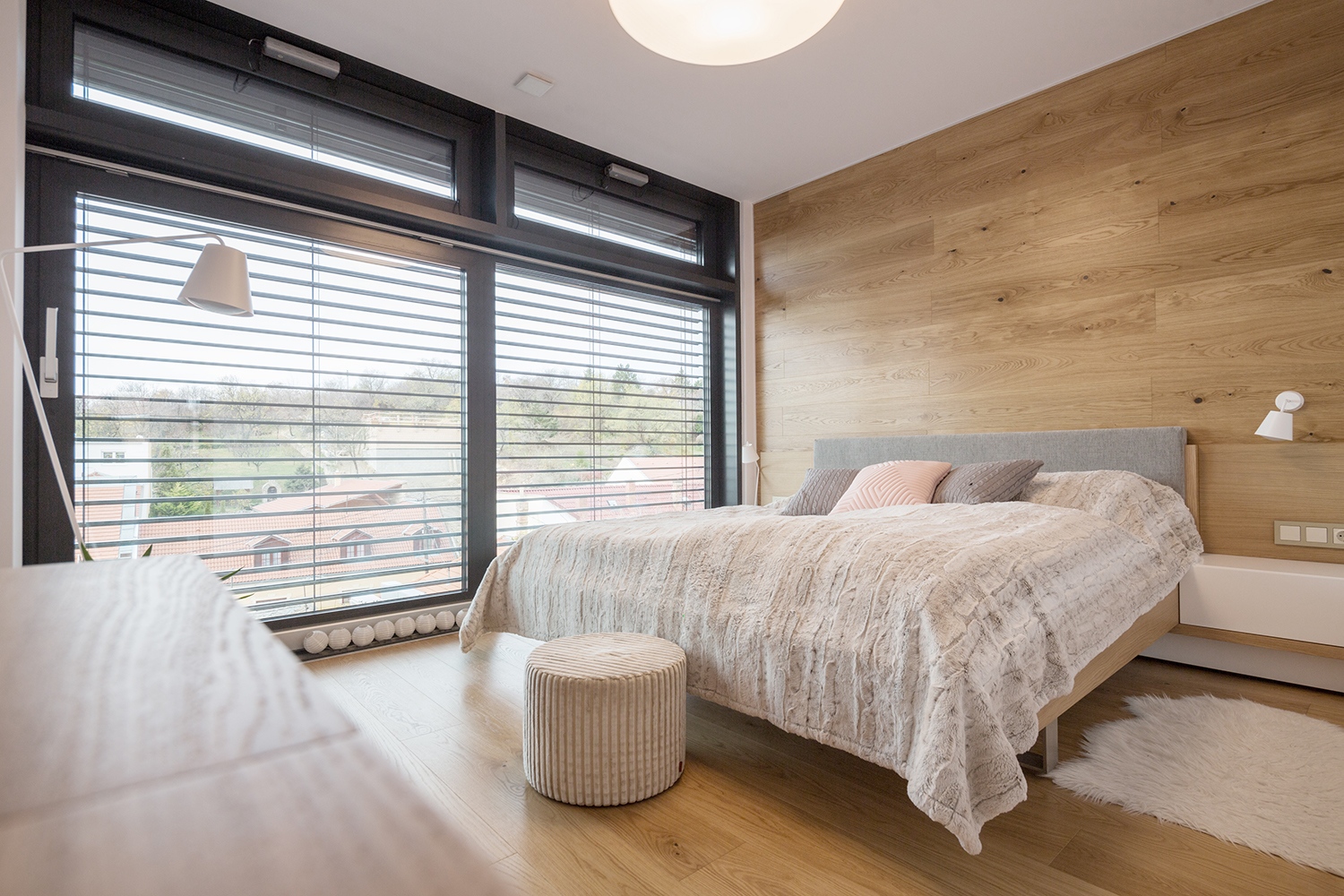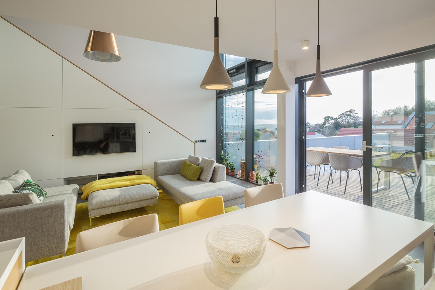 Az épületbelső koncepciója, a letisztult, minimalista formák, minőségi anyagok használata, a fehér falak, a bútorok és padló tölgy felületei, a textilek meleg szürkéi és az élénk sárga kiegészítők a mértéktartó, mégis nagyvonalú terek karakterét hangsúlyozzák, és az enteriőr talán legfontosabb hatáselemét, a fényt engedik érvényesülni.