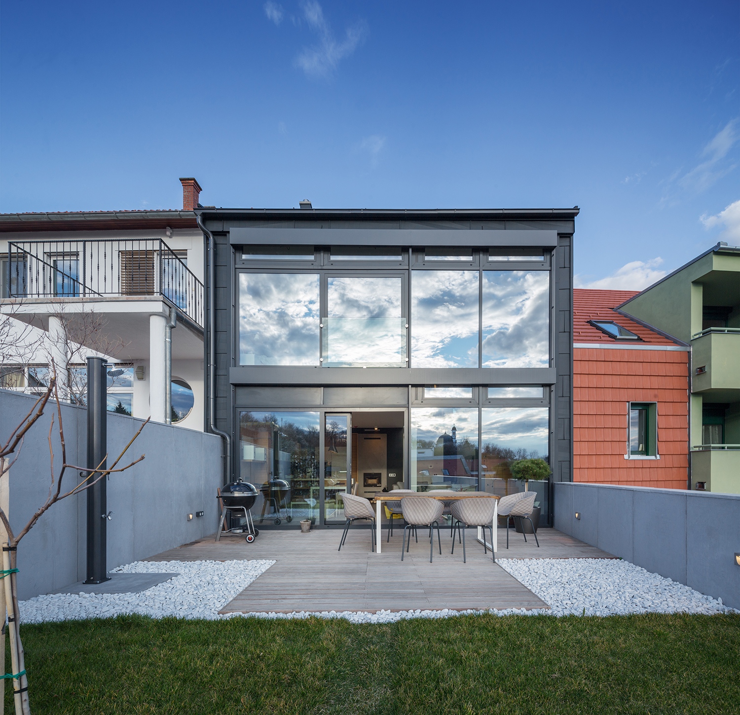 Az apró kert, vagy inkább zöldterasz felől pazar kilátás nyílik a belváros tetőtengerére, a szemközti Kálvária-domb gyümölcsöseire. A publikus felület és a privát szféra szigorú elkülönítésének egyébként megvannak a történeti előképei a városnak ebben a részében, ahol az egykori bosnyákházak élete szintén az utca felől magas, tömör kerítésfallal elrejtett, zárt belső udvarokban zajlott. A kerti oldalon, a földszinten a nappalit, a konyhát és étkezőt egyesítő multifunkcionális tér, az emeleten, az utcafronti oldalon két lakószoba, az északi tűzfal mentén a fürdő, a nyugati, kert felőli oldalon a hálószoba helyezkedik el.