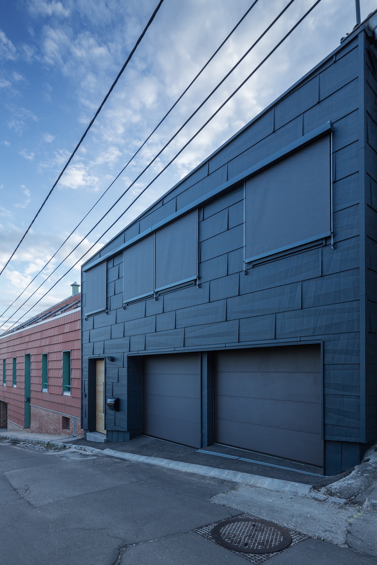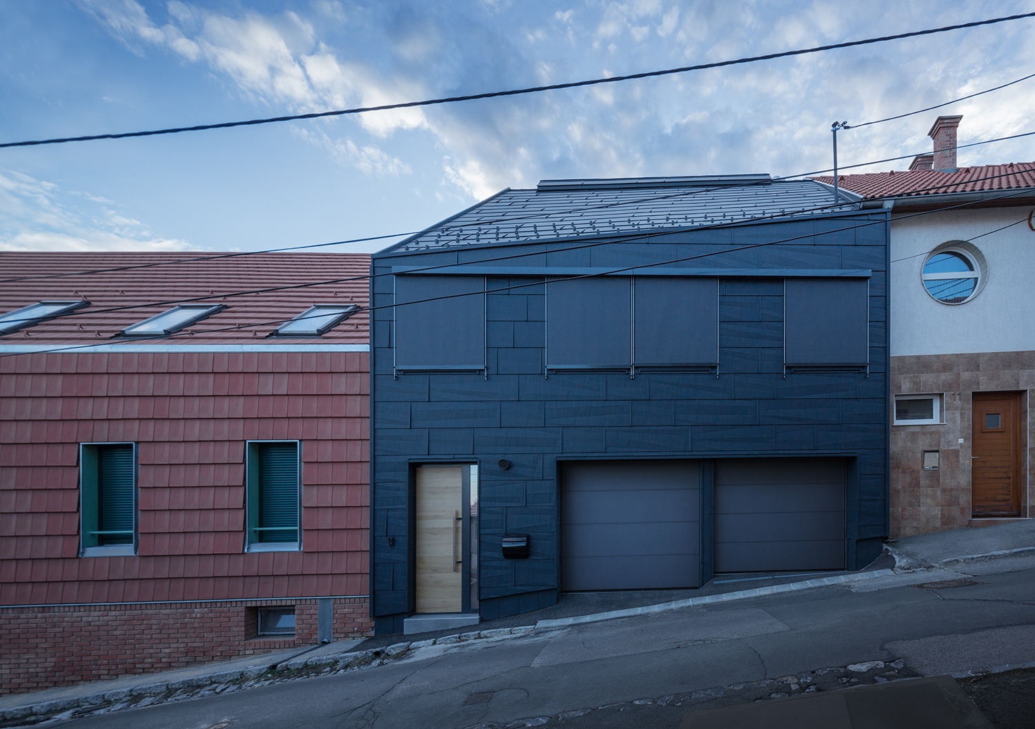 A sűrű beépítés miatt csak az utcai homlokzatnak van valódi városképi jelentősége, amelyet Kistelegdi igyekezett egyetlen, hatásos jelként megfogalmazni: a fal és a tető homogén, antracitszürke fémlemez burkolóelemekkel történő „becsomagolása” szakít a környezethez való alkalmazkodás szentimentális értelmezésével, és futurisztikus karakterével új életre kelti az ódon városi utcát. A sötét színű fémpáncélnak köszönhetően a homlokzati megnyitások (gyalogos bejárat, két garázskapu, emeleti hálók ablakai) ellenére az utca felé szinte bástyaszerű elzárkózást sugall. A szűkszavú külső lélegzetelállító kontrasztot alkot a zöldterasz felé néző nyugati oldal totális megnyitásával, a vertikálisan felnövelt belső terek szinte monumentális hatásával.