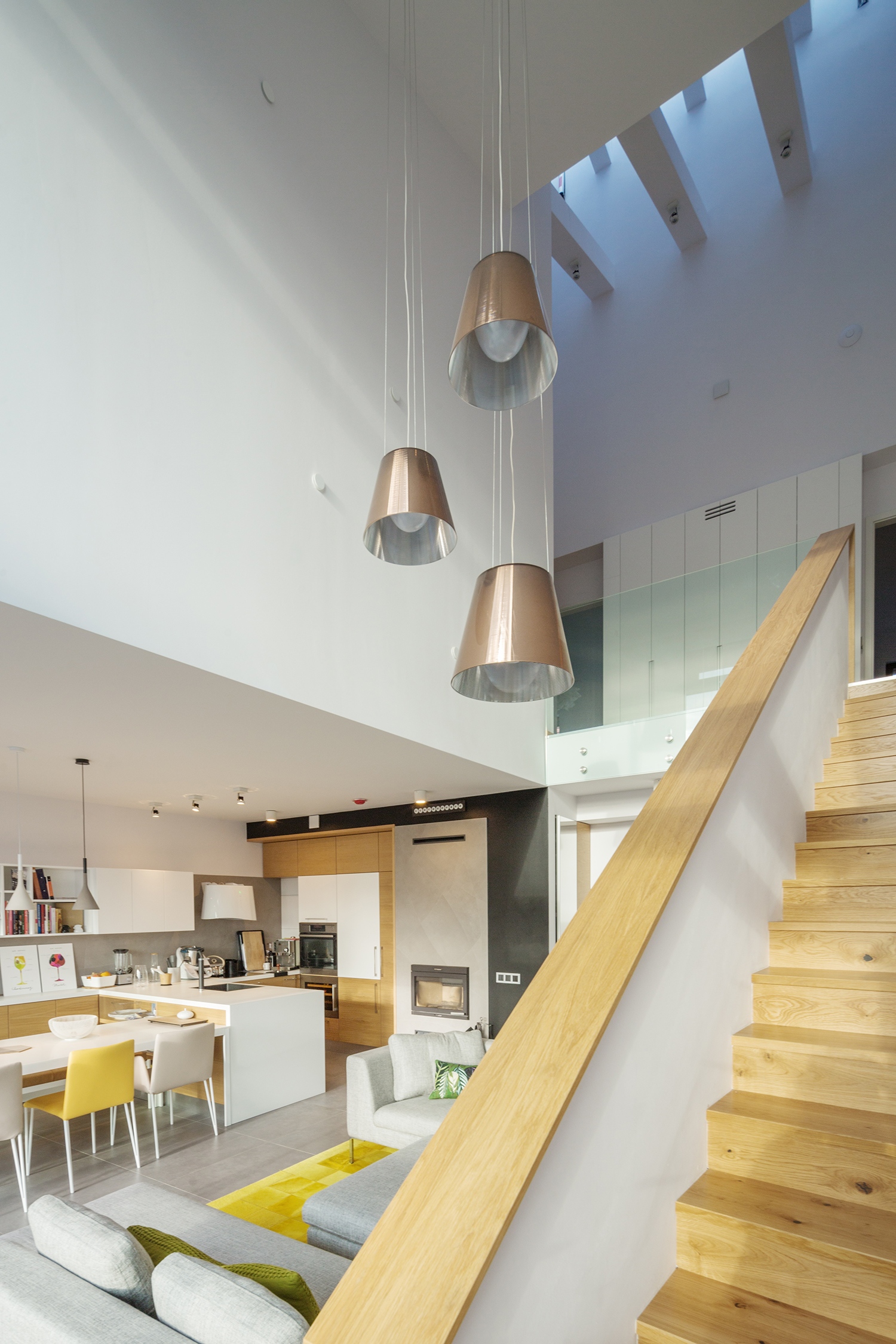 A két szinten kialakított helyiségek működése, természetes megvilágítása és szellőztetése, valamint a belső közlekedés szempontjából a nappali tér fölötti galéria és a födémáttörés révén létrejövő kürtő kulcsszerepet kapott. A három szintet összekapcsoló, a felülvilágítókból áradó fénnyel átitatott függőleges tér szinte templomszerű atmoszférát teremt az enteriőrben. A környező komplex tetőszövethez való illeszkedés követelménye miatt a tetőszerkezet geometriájának kialakítása gondos mérlegelést igényelt. Mivel magastetőt ír elő a szabályozás, így az utca felől egy klasszikus nyeregtető indul, a terasz felőli oldalon pedig egy megtört vonalvezetésű, lapos dőlésszögű tetősík mellett döntött a tervező, felfelé kónikusan szűkülő szellőztető kürtő keresztmetszettel.