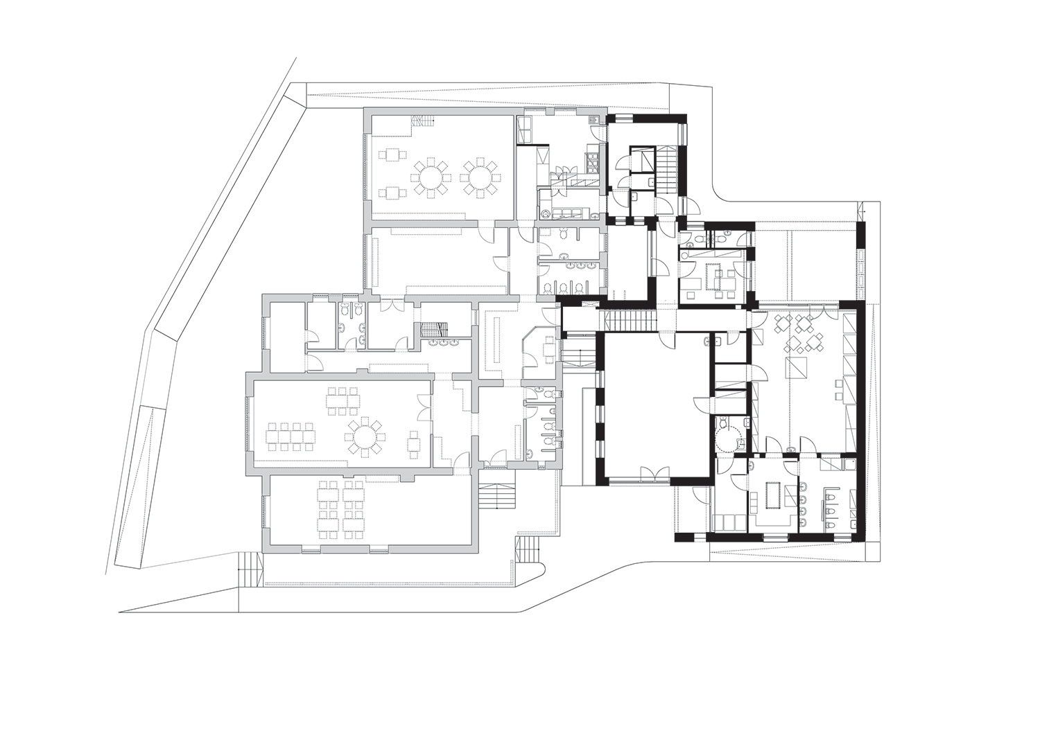 Kiindulópont a „csoportszoba”, amely tágas és multifunkcionális, játékra, étkezésre és alvásra egyaránt alkalmas. E köré szerveződik a kiszolgáló részleg: a mosdó, a raktár (ágyak tárolása) és a gondozók szobája, amely csupaüveg falú megoldásával egyszerre szolgálja a kontrollt és a gondozói magánszféra funkcióját. Az udvar felé fokozatosan nyílik meg a tér: a hatalmas üvegajtó mögött először tetővel fedett rész következik az esős, hűvösebb napokra, majd egy védett, de már tágasabb kertrésszel folytatódik a kiadósabb levegőzésre.