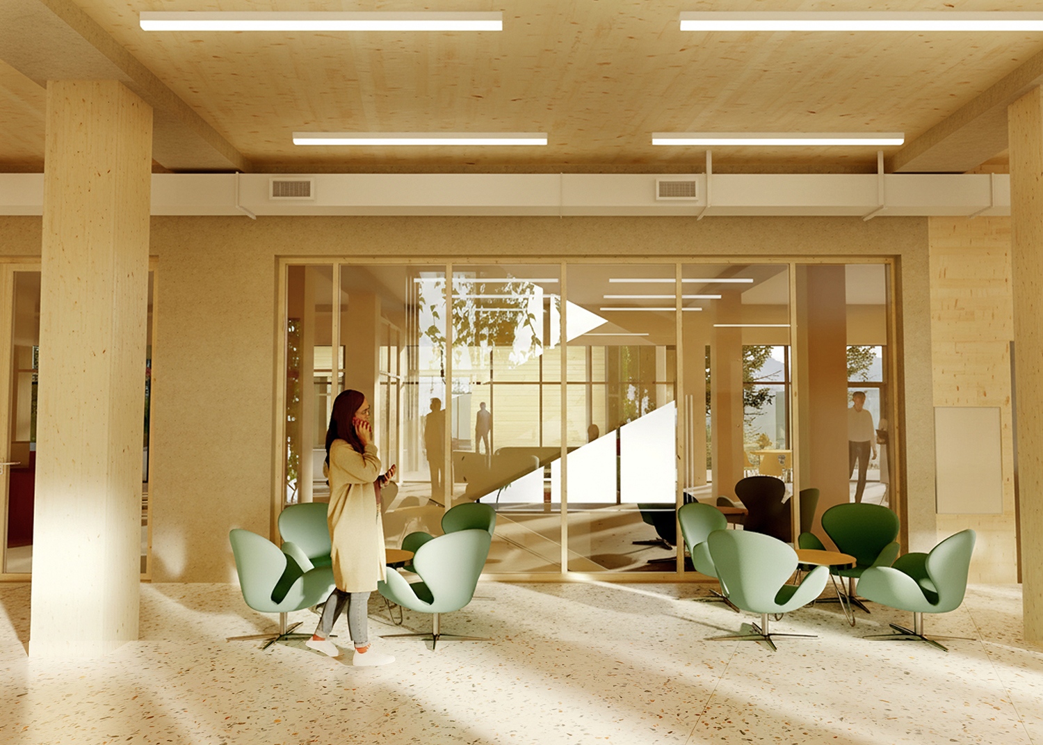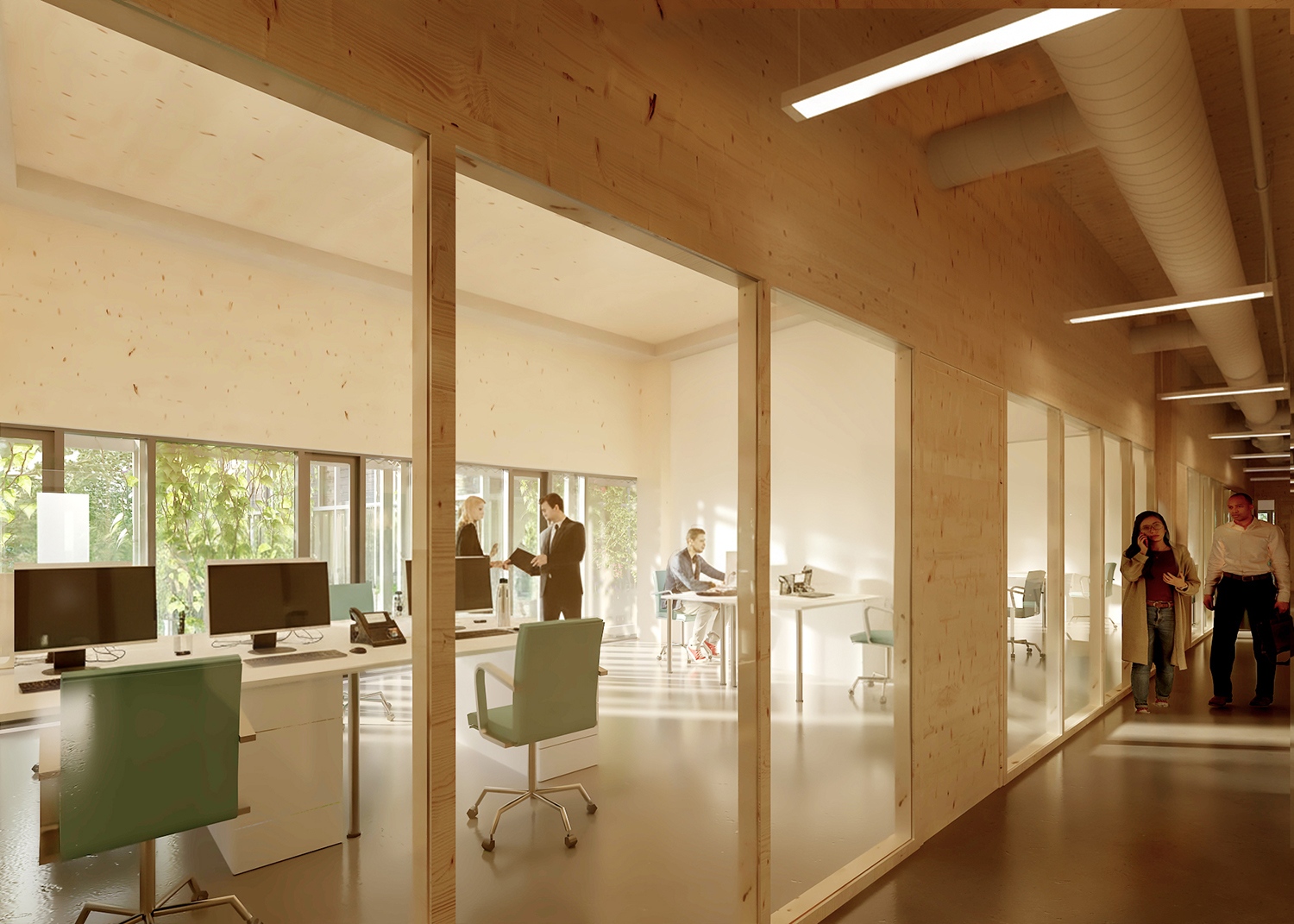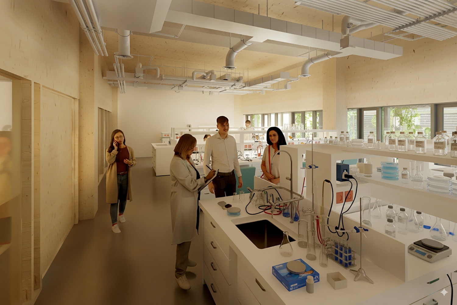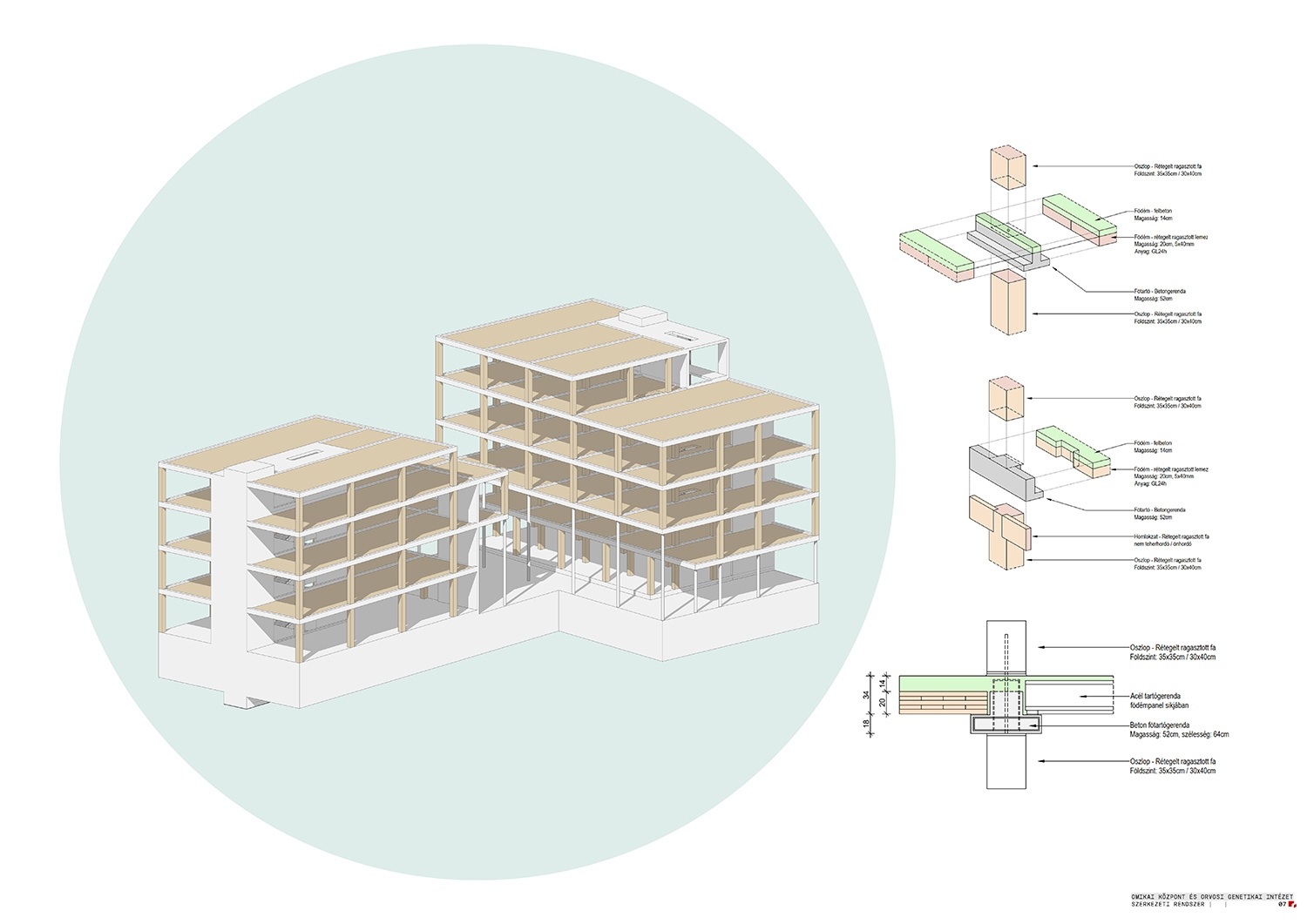 A laborépületben kutatás folyik, így az épületnek is a megszokott szerkezetekhez képest előremutató rendszerben kell gondolkodnia. Az innovatív szerkezetaz épülethasználók és a külvilág felé is a korszerű, környezettudatos szemléletet képviseli azzal, hogy érdemben tudja csökkenteni az épület karbonlábnyomát. Méghozzá úgy, hogy a komfortérzet, esztétika, egészséges beltér kritériumaiban sem köt kompromisszumot: ellenkezőleg, kiemelkedő minőségű, karakteresen egyedi környezetet teremt. Ezen két szempont alapján a Központ a pinceszint vasbeton szerkezete felett fa–beton hibrid szerkezetű ház tervezett, vasbeton merevítő magokkal.