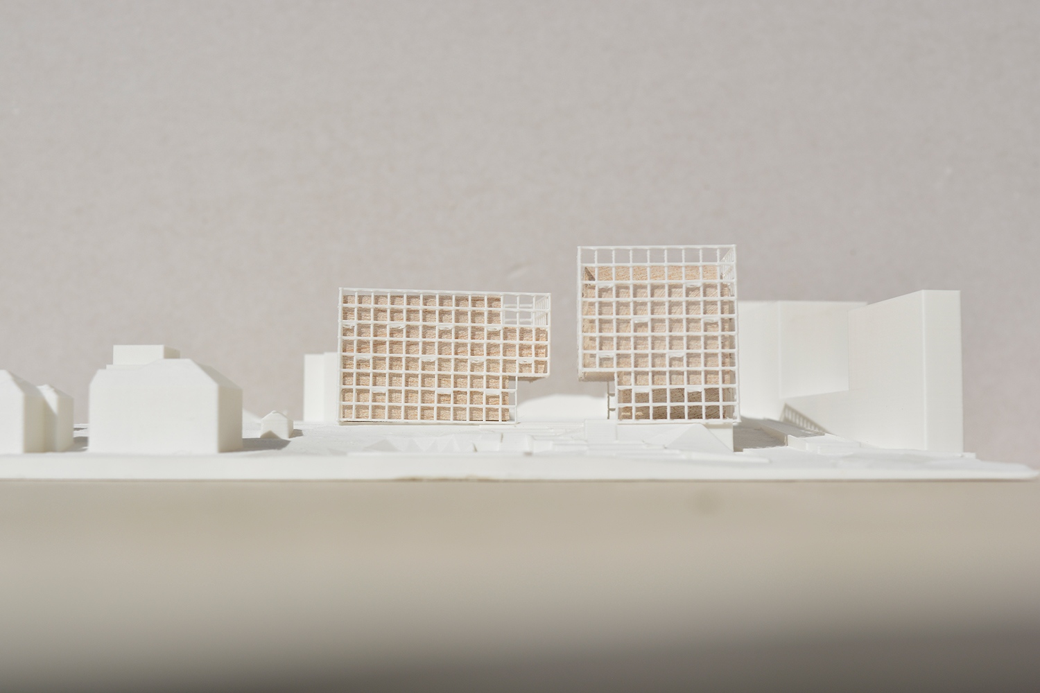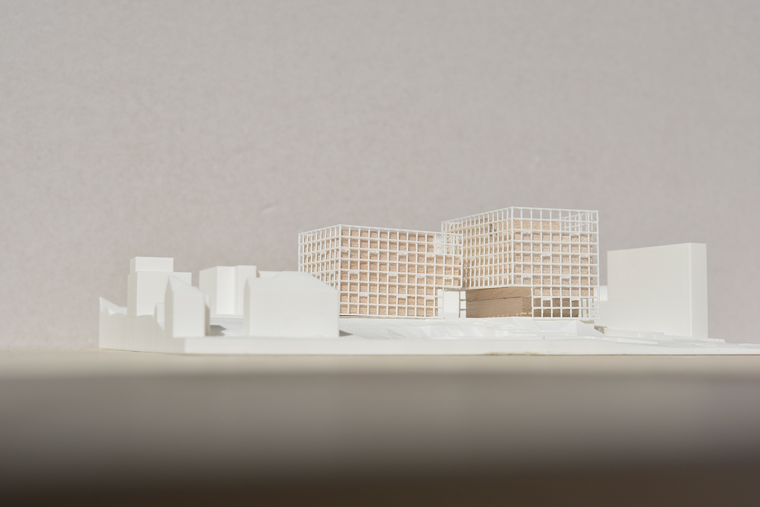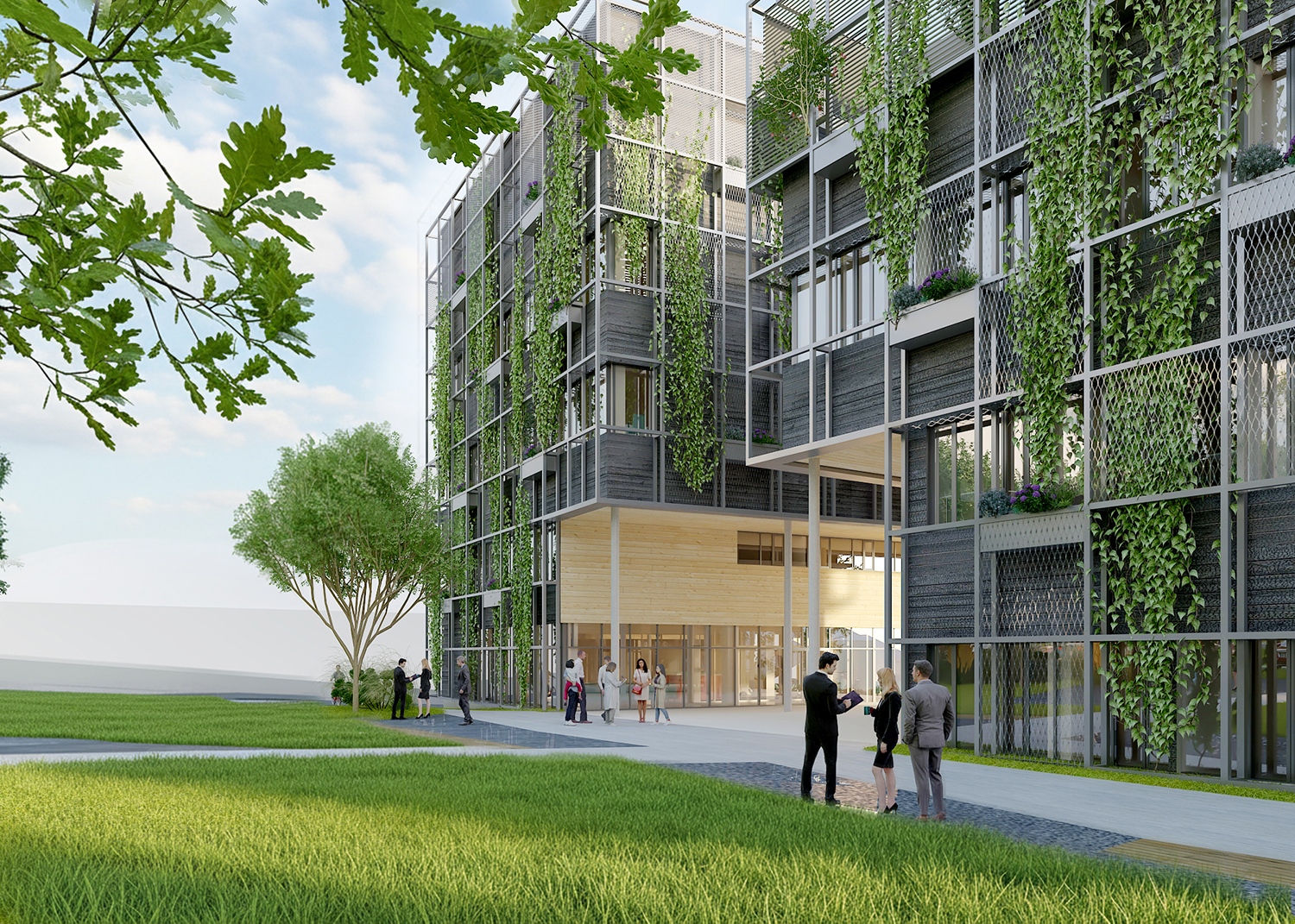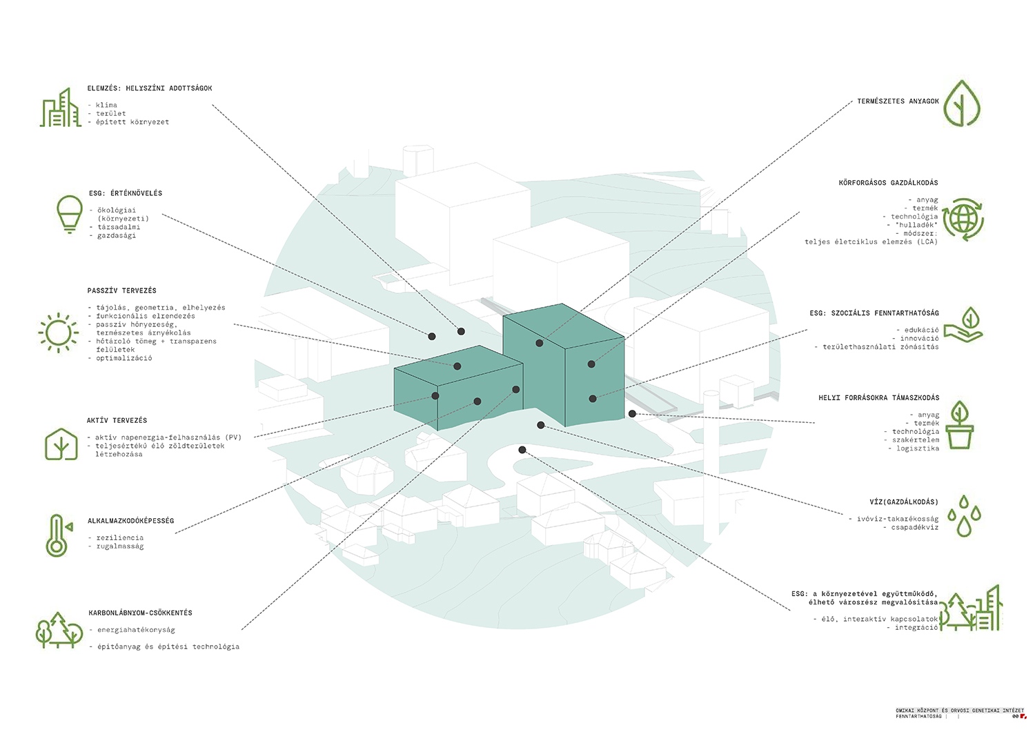 A KÖZTI által tervezett új épület elhelyezését három fő szempont határozta meg. Legfontosabb, a fejlesztési vízióknak megfelelően, a kampusz kialakítása a Tudományos Kutatási Szolgáltatások Tömbjén belül. Ennek érdekében az épület úgy helyezkedik el, hogy a területen található középületeket egy belső, privát park kapcsolja össze.