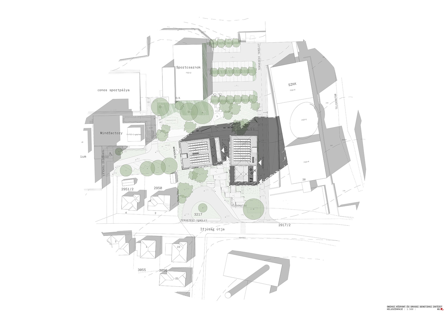 A park létrehozásán túl az épületsűrűség határozza meg a telepítést, keresve azt a helyet, ahol mind az új, mind a meglévő épületek elég teret kapnak maguk körül. A harmadik szempont, ami a végső helyére igazítja az épületet, az a térfalképzés. Az új Omikai Központ épülettömbjei az Ifjúság út mentén meglévő épületek sorába állnak, és a felújított buszforduló felett térfalat adnak. Így létrejön egy városias tér az érkezésre, és az épület tömbjei között áthaladva, mint kapu, elérhető a kampuszpark, és azon keresztül a kampusz többi intézménye.