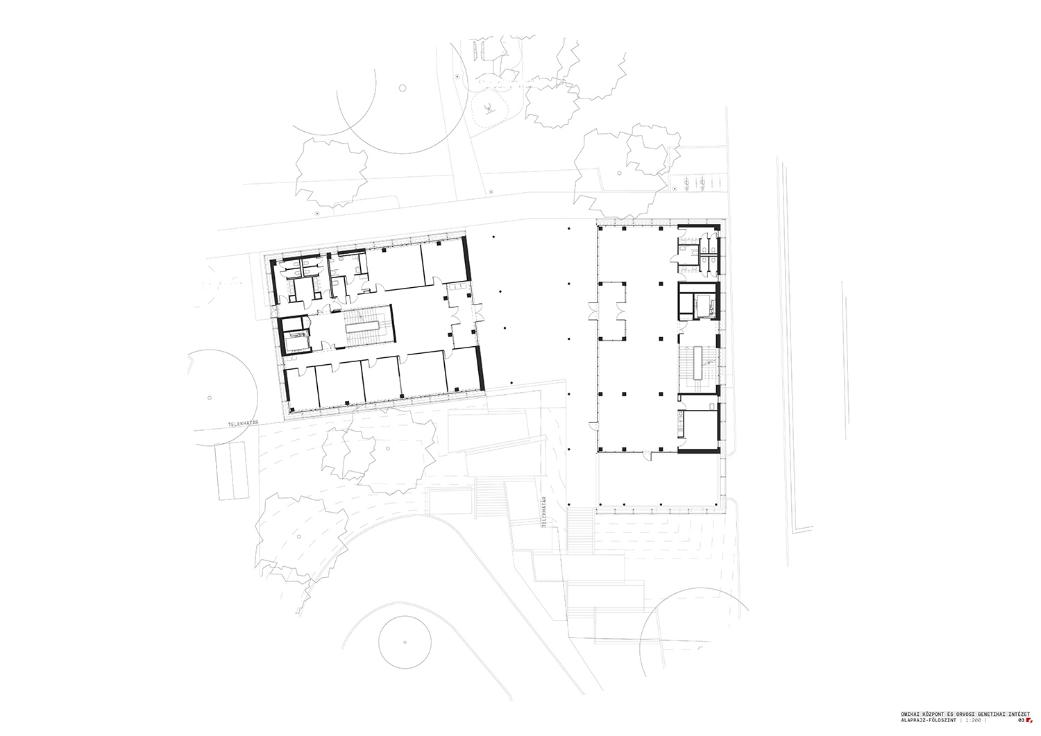 Az Omikai Központ pinceszintjén biobank, műszerterem, szerverterem, valamint nemenkénti öltözők kapnak helyet. A földszinten a két épülettömb közötti árkádos átjáróból érünk be a tágas multifunkciós aula térbe, ahol közösségi funkciók, büfé, valamit étkezőrész kap helyet. Dél felé egy fedett/nyitott terasz kapcsolódik ezekhez.