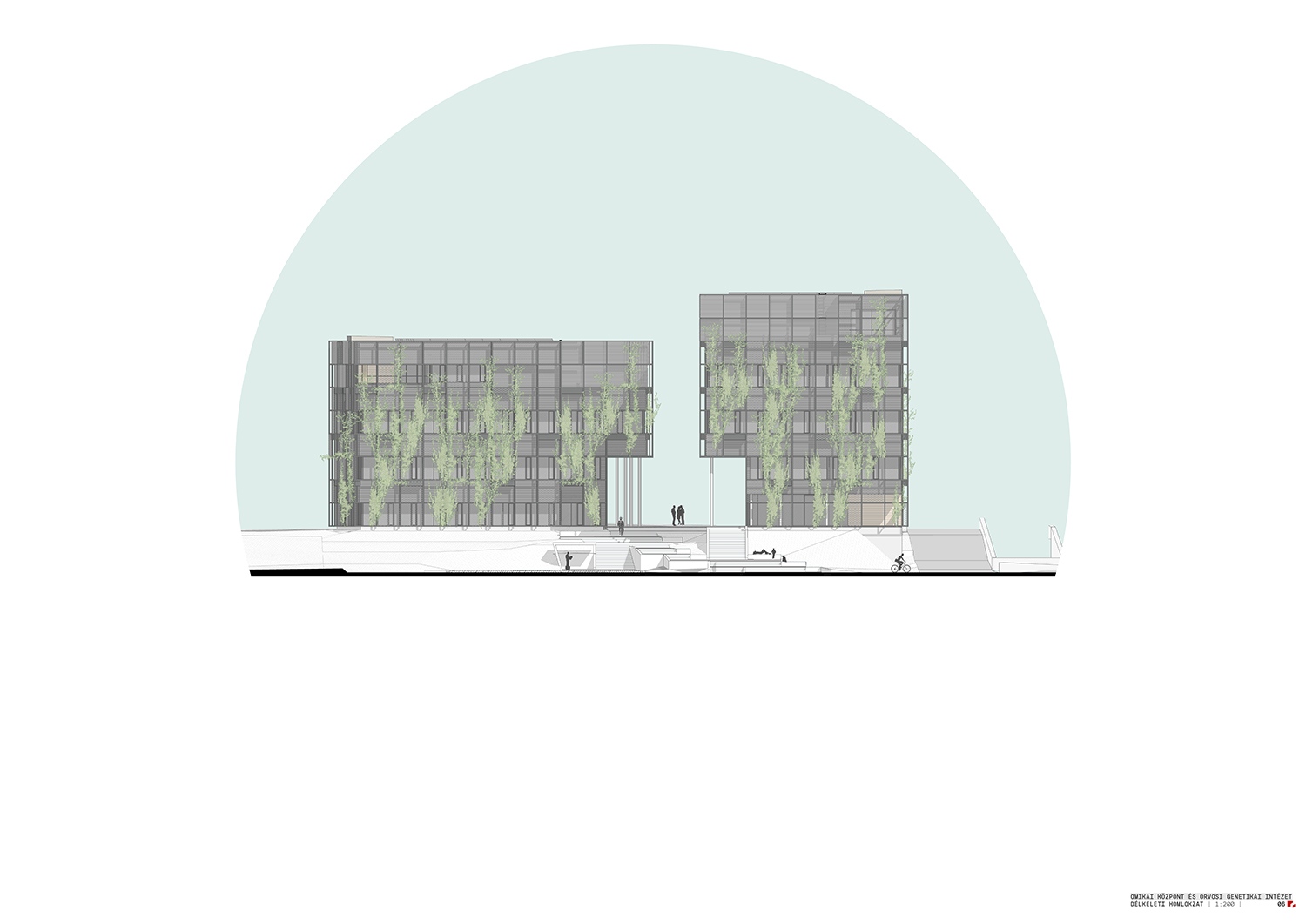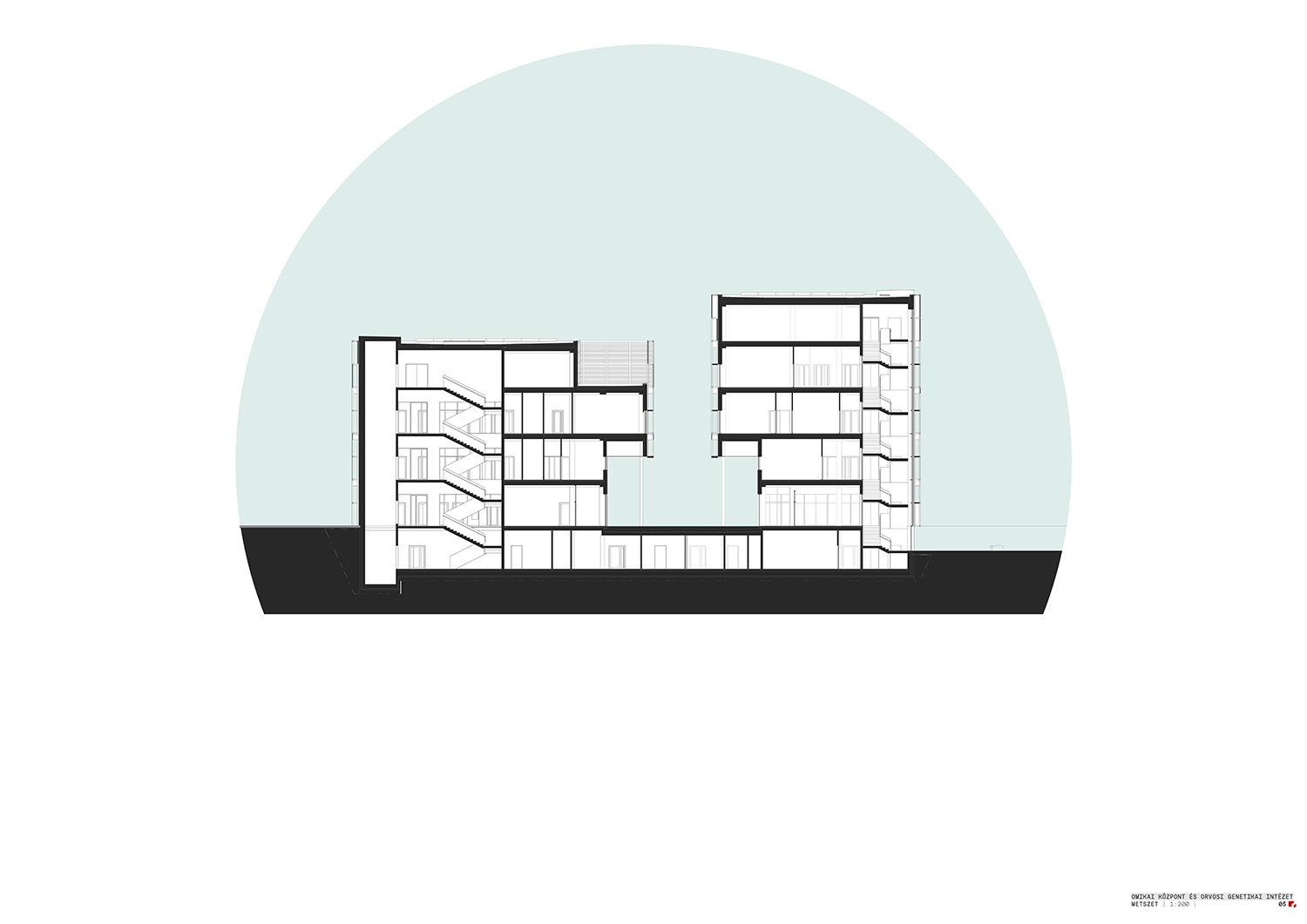 Az Orvosi Genetikai Intézet bejárata szintén a két épülettömb között nyílik, az árkádok alatt. A földszinten a betegfelvételi pultnál való bejelentkezés után érik el a várakozók az aula térből nyíló rendelőket és a tornatermet. Az első és második emeleten kevert funkciójú szintek épülnek ki, ugyanis a labor és irodai funkciók egy szinten belüli tartása volt szükséges. A harmadik emeleten a dolgozók számára közösségi teret alakítunk ki, ahol a mindennapi személyzeti pihenő funkción túl megbeszélésekre is alkalmas belsőépítészeti kialakítást tervezünk. Ehhez a helyiséghez fedett-nyitott terasz kapcsolódik, ahonnan pazar kilátás nyílik Pécs déli területeire.