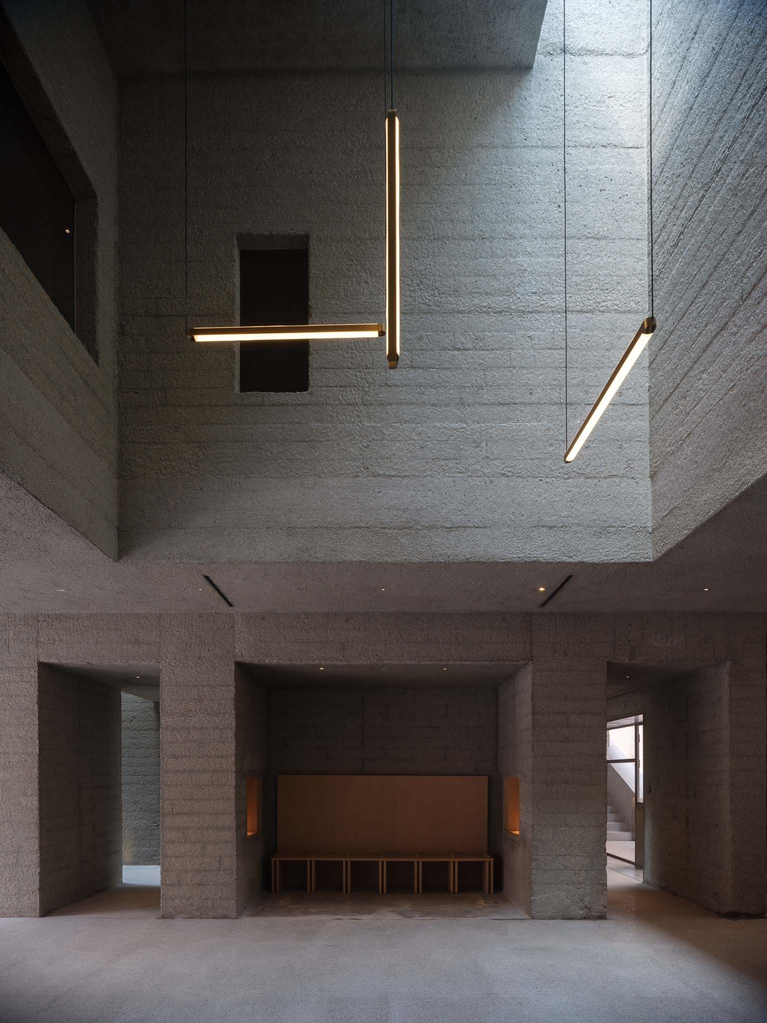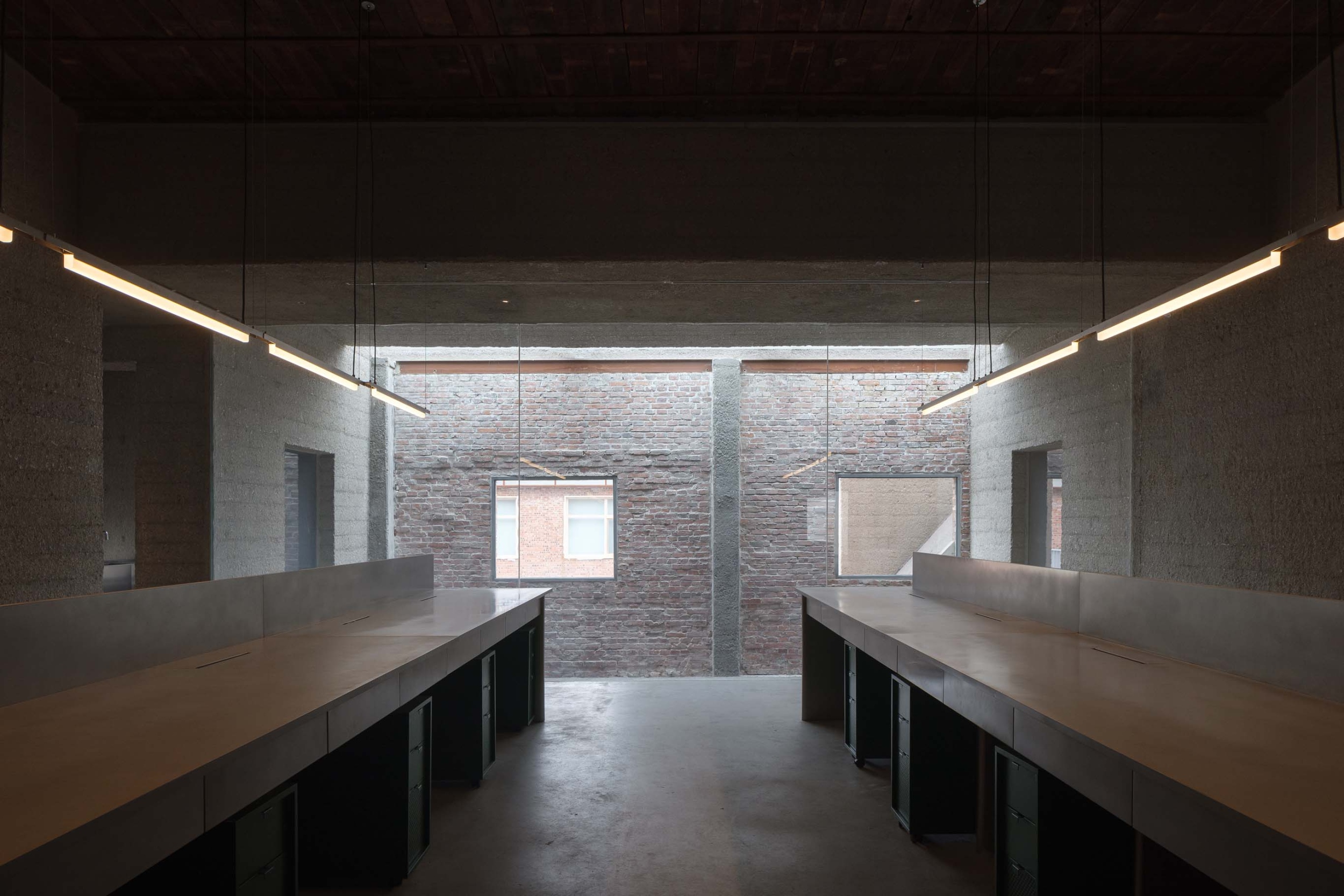 „Lényegében egy új öntött beton tárgyat terveztünk a régi téglahéjba, amelynek különböző nyílásai és negatív terei alkotják a fő kiskereskedelmi, galéria- és irodahelyiségeket. Bizonyos helyeken ez az új betonbelső kiszivárog, és megjelenik a homlokzaton, hogy kitöltse az üregeket, vagy új hozzáférési pontokat jelezzen” – mesélte megkeresésünkre a stúdió. Miután a betont kiöntötték, szakképzett mesteremberek olyan lágy textúrát hoztak létre a felületén, amely egyszerre alkot kontrasztot a régi téglákkal, ám ki is egészíti azokat.