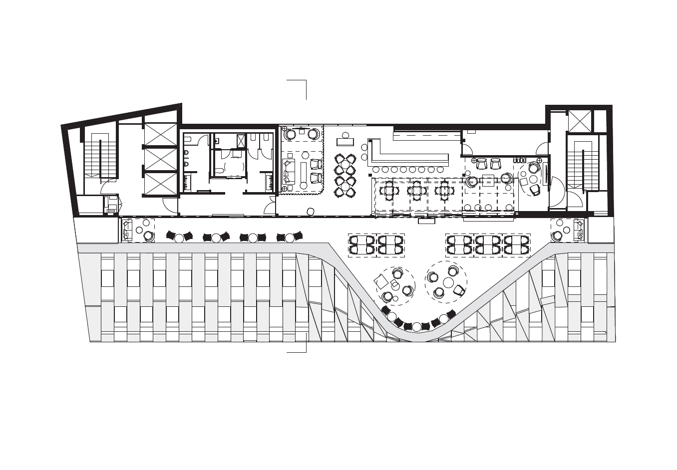 A külső homlokzati sík így mint egy rácsos mintázatú függöny borul rá a szerkezeti vázra, kiemeli a lábazati szintet, fentebb pedig érdekesen, plasztikus megjelenésével egybemossa a szintek határait. A bejárat és a tető egy szakasza itt is megkülönböztetett szerepet kapott, akárcsak a klasszicista szomszédnál. Mintha egy fuvallat lebbentené meg a függönyt, úgy válik láthatóvá a belső homlokzati sík antracit függönyfala a bejárati zónában. A sky bárhoz kapcsolódó tágas tetőterasz íve mentén pedig egyfajta hullám tűnik fel a homlokzaton.