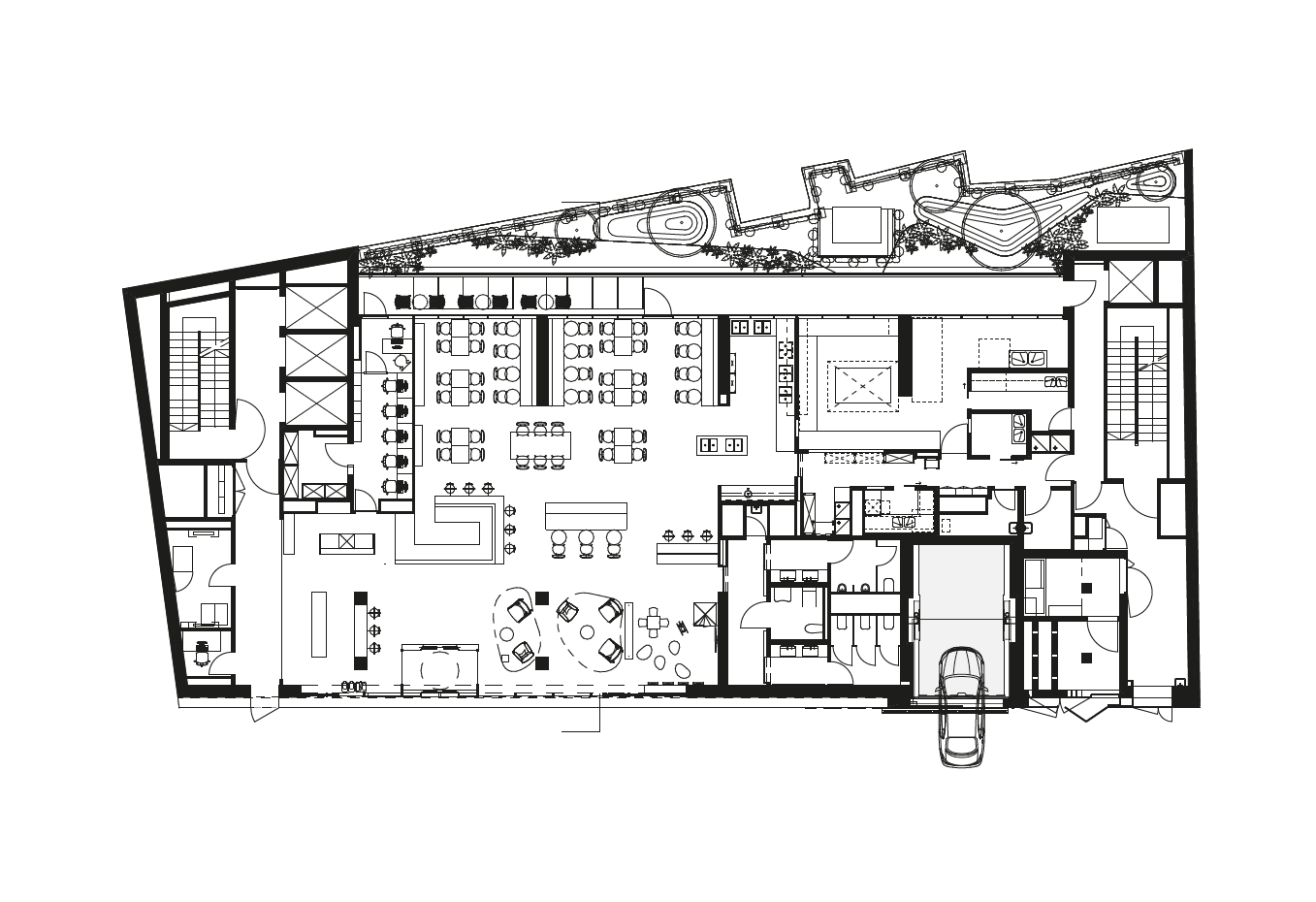 Az épület két szint mélygarázst is kapott, ahol egy fitness, előadóterem, gépészet, egyéb háttérterületek és a pakoló került kialakításra, melyet gépjárműlift segít. Az építtetői igényeket sikerült maximálisan kielégíteni, ami nem kis erőfeszítést jelentett a 670 m2 beépíthető alapterület és 16 méteres párkánymagasság mellett. Az egyetlen kompromisszum a szintek nettó belmagassága, amely 2,50-3,00 méter között mozog. Ám ezt a problémát feloldja a szobák kialakítása, hiszen teljes szélességben üvegfallal nyitnak az utca és a belső udvar felé.