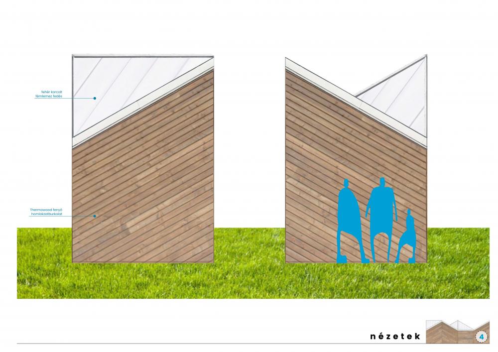 A tartószerkezet és a burkolatok megválasztásánál fontos szerepet játszott a természetesség, a környezetbe való illeszkedés, a könnyű telepíthetőség és szerelhetőség kívánalma. A tartószerkezet erdeifenyő váz, melyet UV-védelemmel ellátott Thermowood fenyő homlokzatburkolat fed kívül és belül. A váz oszlopai közé