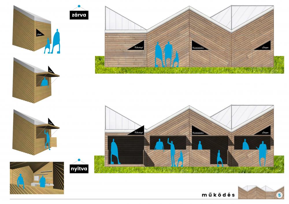 A gépészeti és elektromos csatlakozások pavilononként egy padlódobozban megoldottak, innen a vezetékek és csövek a falon kívül mennek a könnyű karbantarthatóság érdekében. Minden pavilon egy oldalról nyitható: itt van a kiszolgálóablak és a bejárat is. A felnyitható előtetőkön vannak az egységes arculatú cégérek, melyek a pavilon zárvatartása alatt is ki vannak hajtva, láthatók, megvilágításuk beépített ledszalaggal, minimális fényszennyezéssel megoldott.