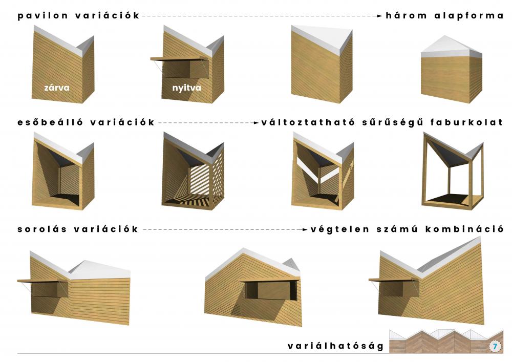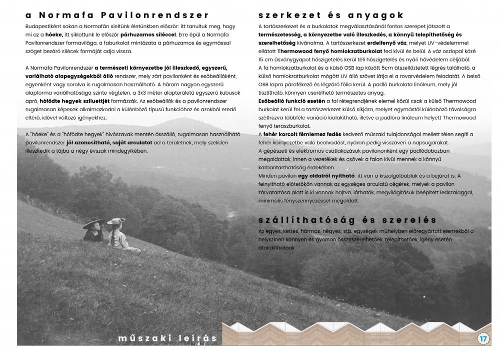 A Normafa Pavilonrendszer a természeti környezetbe jól illeszkedő, egyszerű, variálható alapegységekből álló rendszer, mely zárt pavilonként és esőbeállóként, egyenként vagy sorolva is rugalmasan használható. A három nagyon egyszerű alapforma variálhatósága szinte végtelen, a 3x3 méter alapterületű egyszerű kubusok apró, hófödte hegyek sziluettjét formázzák. Az esőbeállók és a pavilonrendszer rugalmasan képesek alkalmazkodni a különböző típusú funkcióhoz és azokból eredő eltérő, idővel változó igényekhez.