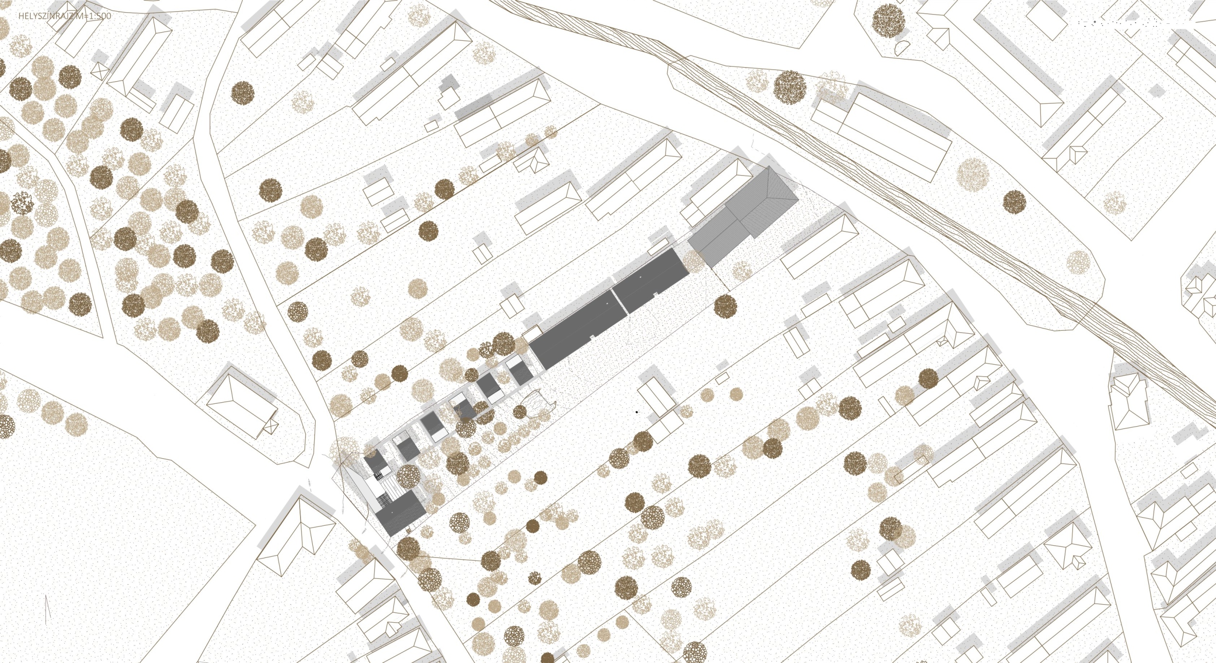 A telepítés a falu oldalhatáron álló beépítéséhez igazodik. A gondnoki lakás a felügyelői pozíció és a falubeli beépítés miatt a Táncsics úti utcafronton kapott helyet. A faházak a domboldalon a fák sűrűjében, ami így a gyerekek varázslatos birodalmává válik. A nagyobb tömegű központi épület pedig a sík terepen, amely mellett egy jókora terület is megmaradt az udvaron szabad sportolásra, játékra.