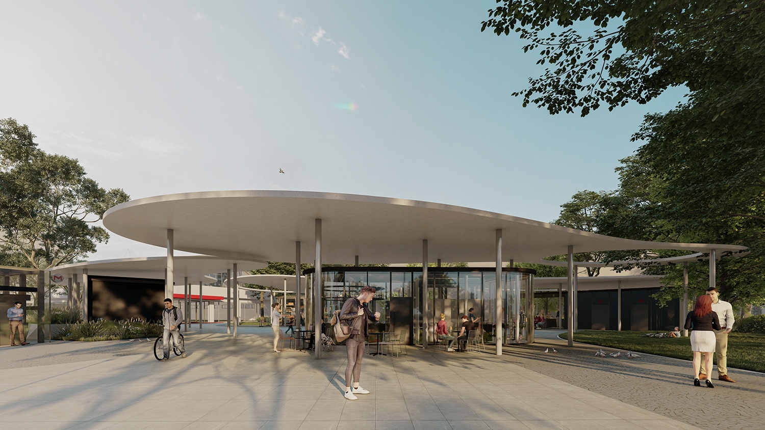 A tájépítészeti formálásra két alapvető szempont hatott. Egyrészt a gyalogos áramlások organikus útvonalai, másrészt az a kényszer, hogy komolyabb fásszárú növényzet ültetése a metró magas födémszintje miatt csak jelentős kiemeléssel megvalósított zöldfelületekben lehetséges.