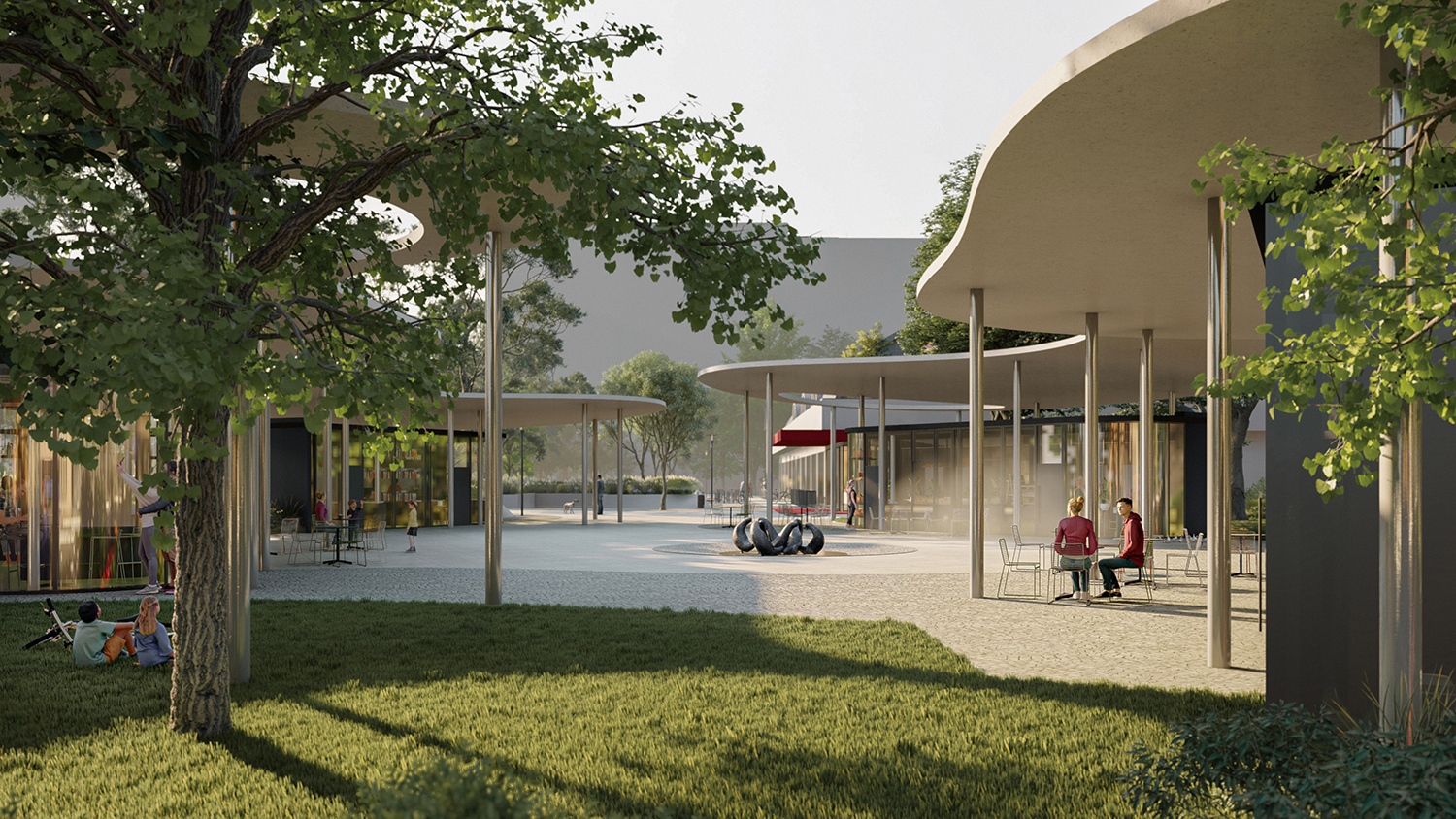 A célként megfogalmazott kapu jelleget egy minden érkezési irányból elérhető „szolgáltatási központ” létrehozásával hangsúlyoztuk, melyet a körben elrendezett pavilonok határoznak meg, az általuk kijelölt belső tér központjában pedig a „Fókák” c. alkotás, csobogó áll. Ennek a lehatárolt mikrotérnek sajátos hangulata van. Miközben kellően szellős annak érdekében, hogy átjárható legyen, egy kicsit ki is vonja a használót a nyüzsgésből, megállítja, leülésre, maradásra csábítja. A József Attila-lakótelep méretes zöldfelületei is kiúsznak a térre, a közlekedés alól felszabadított területek zölddé változnak. A meglévő, árnyékadó fák mellé újakat ültetünk, kihasználva azt az előnyt is, hogy az elbontott parkoló területén már talajkapcsolatos növényfelületek létesíthetőek.