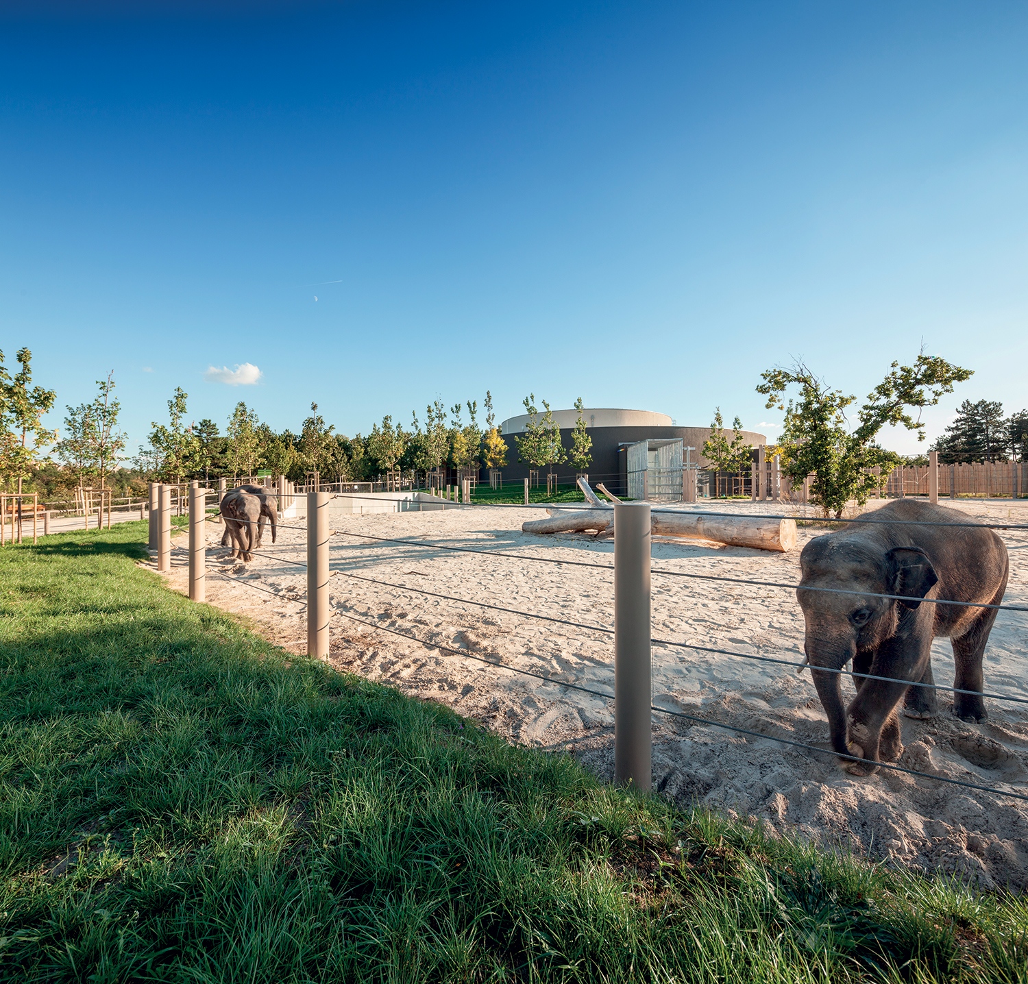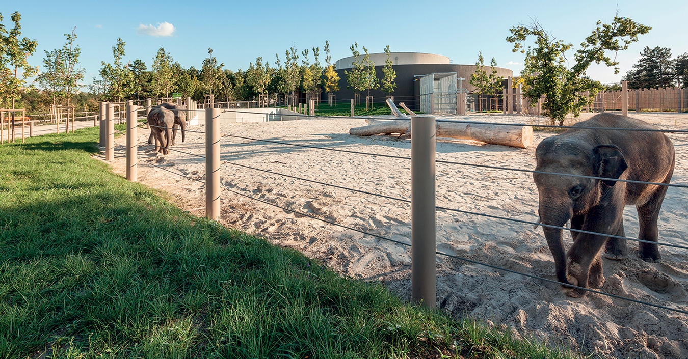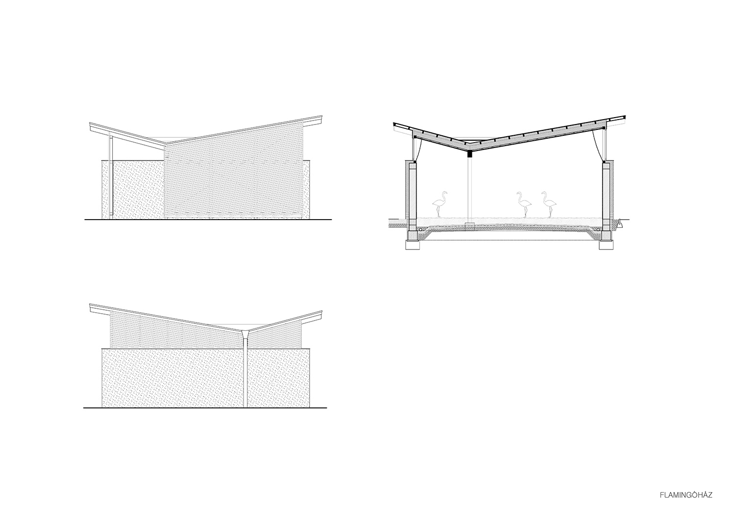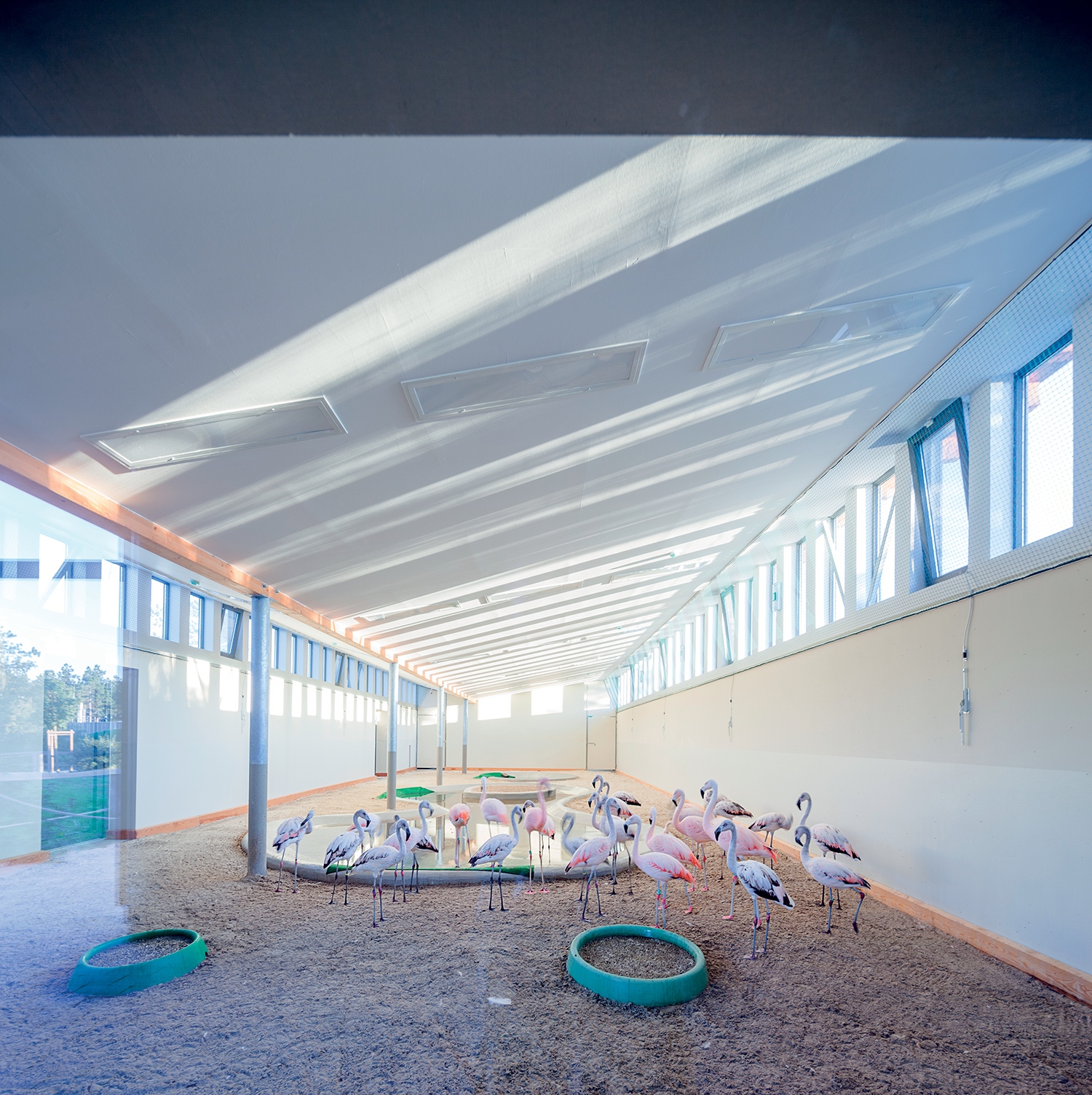 Az ember itt úgy gyalogolhat be a flamingók világába, hogy a pókhálóként feszülő kötéltartós lehatárolás szinte észrevehetetlen marad a háttérben. A műtárgy egyediségéhez tartozik az a tény, hogy a kivitelezés során a lehető legtöbb helyszínen, az ott élő facsoportokat megőrizték, gondosan óvták. Így a jelenlegi „belső” világ a korábbi jól beállt faállomány asszisztálásával minden művi érzetet mellőzve, teljes pompájában nyújt természetes hátteret a színes madárvilágnak. Továbbhaladva egy, az előzőtől eltérő formálású, de hangnemében passzoló épülethez, az elefántok házához jutunk, az objektumhoz felvezető rámpa az épület volumenét optikailag is növeli.