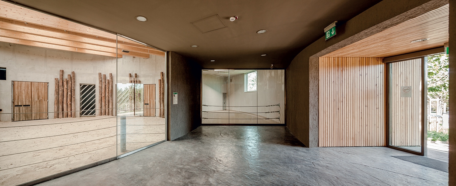 A belső térben a kiemelés emelt horizontot nyújt, vagyis sajátos látványt enged a plázsszerűen kialakított belső térre: a nagy testű állatokkal egy szinten, azok nézőpontjával megegyező magasságban pásztázhatjuk az hatalmas felülvilágítók jóvoltából ragyogóan benapozott belső teret. A „wellness-hangulatot” a kiépített mesterséges esőztető, valamint az elefántok számára épített élménymedence teszi teljessé, a karámok szakszerű kialakításának köszönhetően a gondozók biztonságosan meg tudják közelíteni az állatokat. A tetőzetet tartó rétegelt-ragasztott tartók pozicionálása ügyesen rejti a szükséges gépészeti részleteket, így azok a letisztult belsőben rejtve maradhattak mindenféle utólagos elburkolást mellőzve. A mélyhomokos belső tér zsilipeken keresztül csatlakozik a szabadtéri karámokhoz.