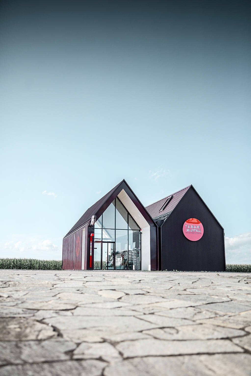 Lehetséges, hogy az építészek egy cigarettaszünetben felszálló füstben látták meg a kettő, középen összekötött meredek és keskeny tetős megoldást, az viszont biztos, hogy akár milyen kicsi is a fekete-vörös PREFA alumínium burkolattal borított, szokatlan formájú épület, de annál izgalmasabb kihívást biztosított.