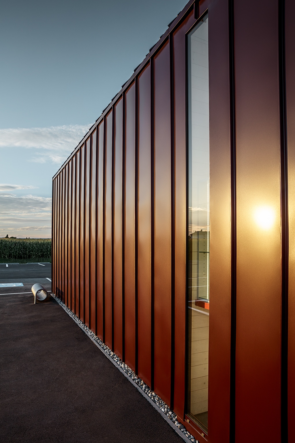A végeredményt látva az talán nem is kérdés, hogy a kivitelező, az építész, a gyártó és a megrendelő azonos nyelvet beszél. Az építész és a megbízó közös, gyors döntése volt a Prefalz termék. Az építész szerint a burkolat a hajtási éleknek köszönhetően mintegy bőrként feszül az homlokzatra és a tetőre. Poppe javaslatát a megrendelő felé a termék előnyeivel indokolta: rugalmas, könnyű és robosztus, karbantartást nem igénylő alumínium elemek.