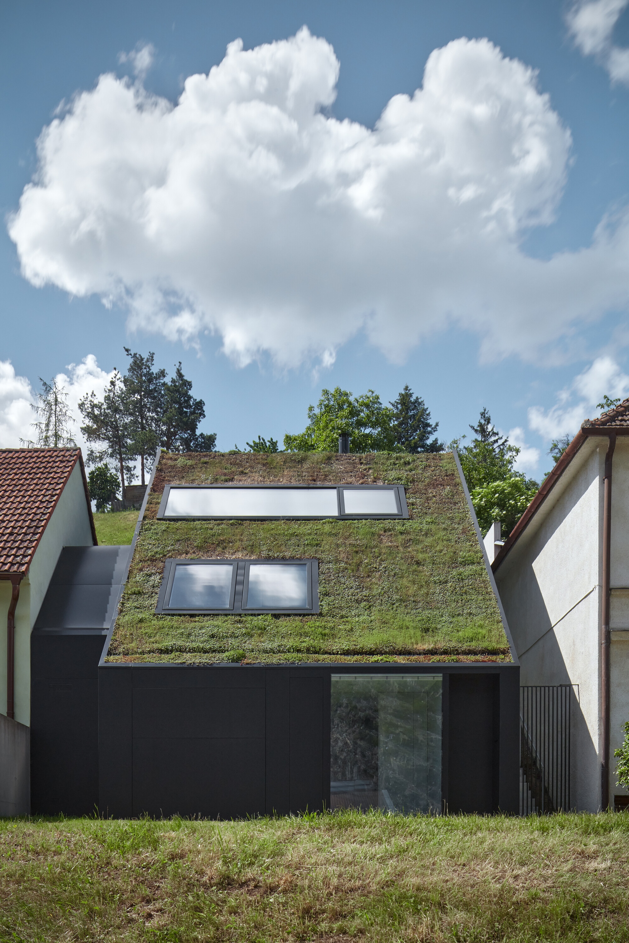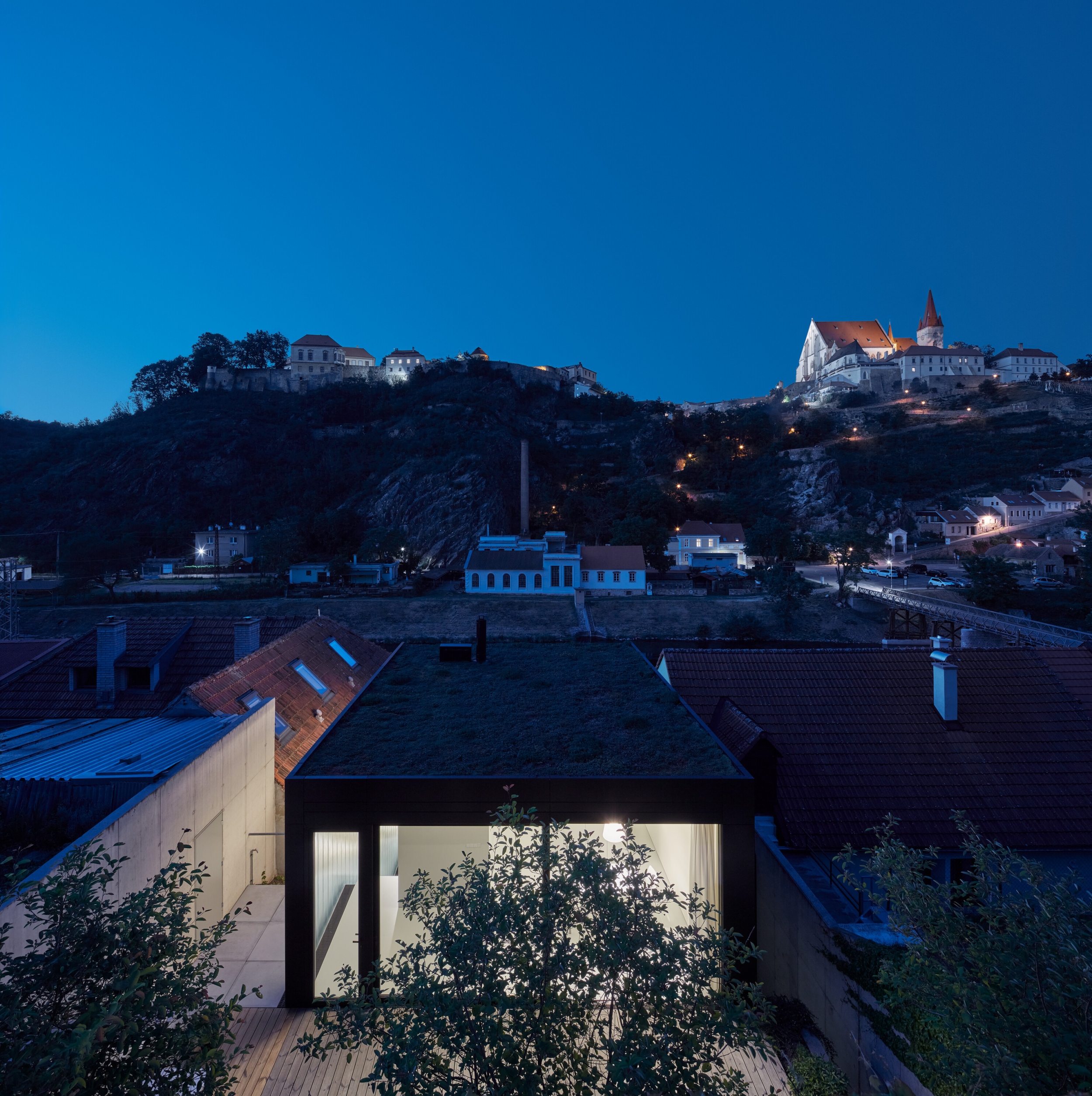 A Brnótól 68 kilométerre található, dél-morvaországi Znojmo városkában, a Dyje folyó partján álló házsorba egy különleges, zöldtetős, modern lakóházat ékeltek, ami úgy simul bele környezetébe, hogy közben annak összes előnyét magába szippantja.