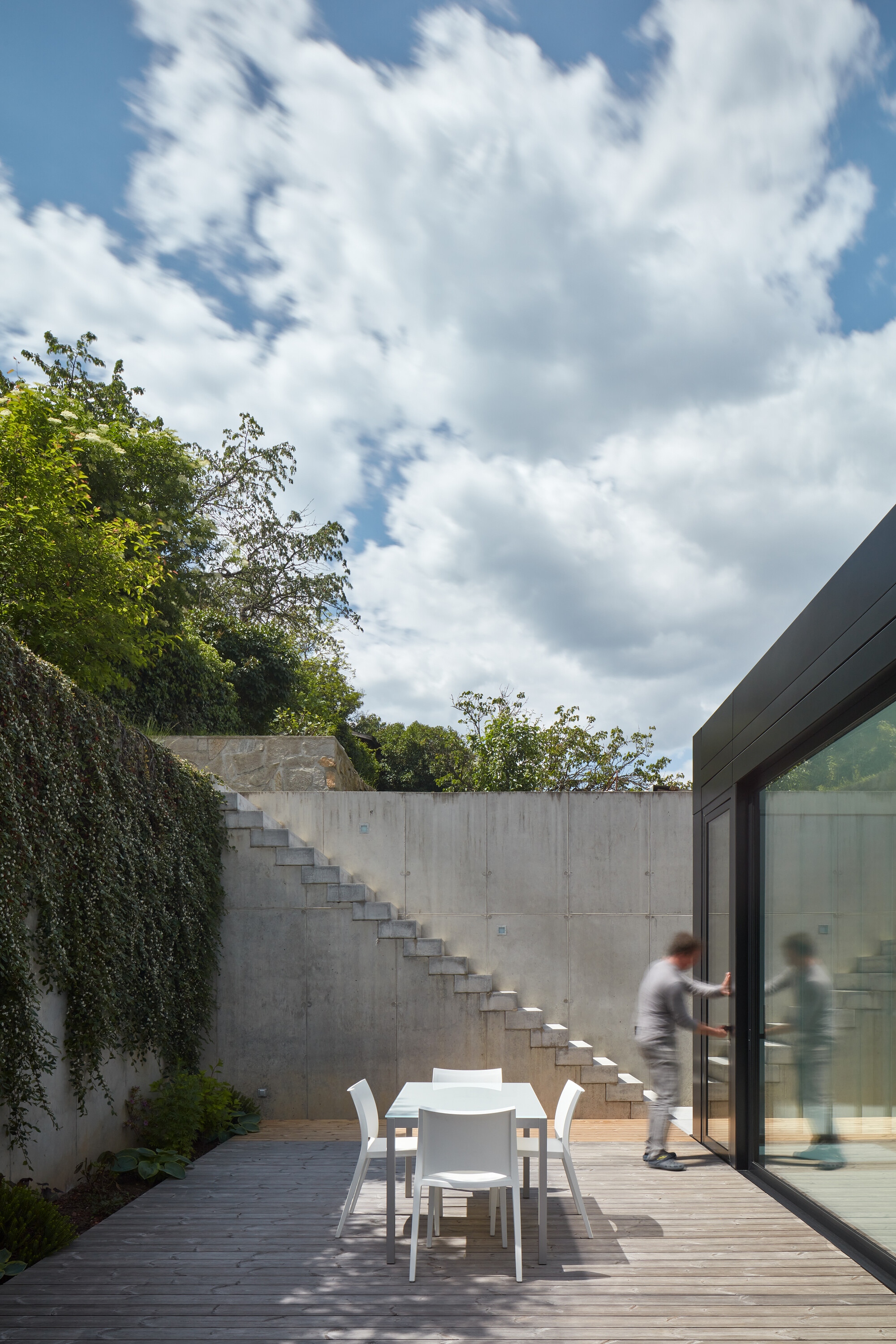 A lépcsős, teraszokra épült, részben a föld süllyesztett ház három szintje közül három a víz felöli oldalra néz és csupán egy a hegyoldal irányába. A ház északi – folyópart felöli – része, a szomszédos házak tetőinek jellegét követve döntött zöldtetőt lett, amivel úgy simul bele optikailag a ház mögött emelkedő zöld környezetbe, mintha jóformán ott sem lenne. A zöldtetőbe két aszimmetrikusan elhelyezett ablak került, melyek a gyerekszobák és a legfelső szinten lévő nappali ablakai. A ház keleti, szomszédos háztól elválasztó falát a telekhatárról beljebb tolták, így megoldódott a szülői hálószoba és a második emeleti folyosó természetes világítása.