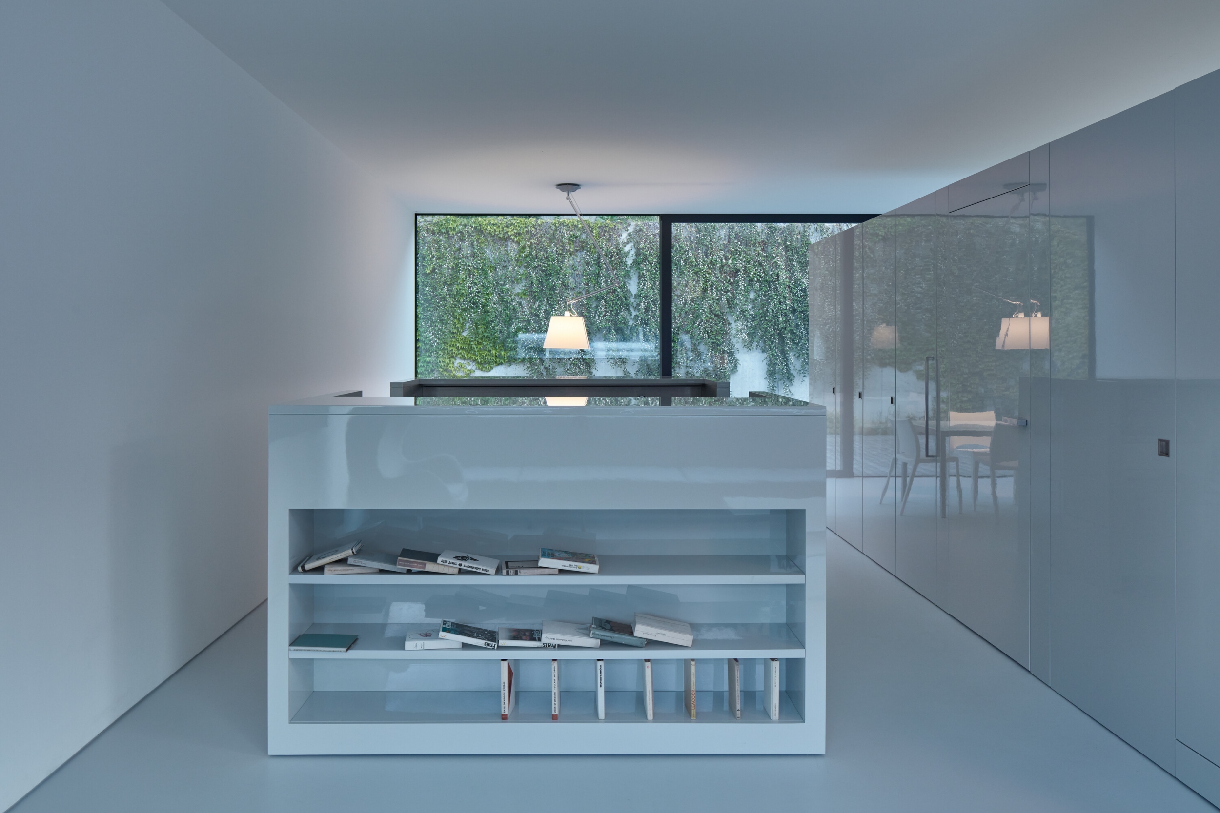 A legfelső szint közepén álló konyhától északra található a nappali modern kanapékkal és fotelekkel berendezett tere, míg az étkező a déli oldalra került. A nyitott tér közepén egy szigetszerű dobozban kapott helyet a kamra és egy mosdó. A konyhai szekrények, a kandalló is ennek a tér közepén álló „konténernek” a falába lettek beépítve.