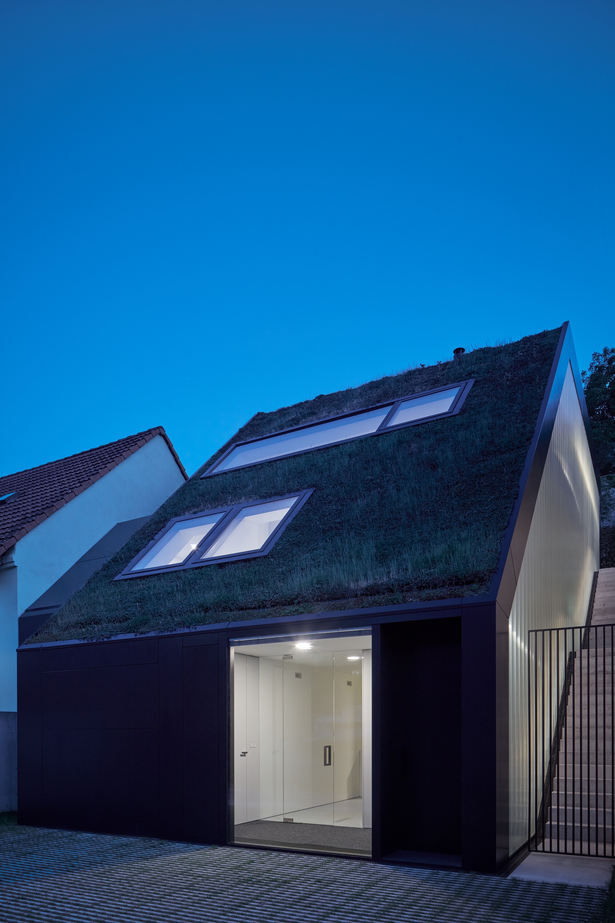 Döntött zöldtetőjével beleolvad a tájba ez a szűk, hosszanti telken kialakított, fantasztikusan jó elrendezésű, modern családi ház.