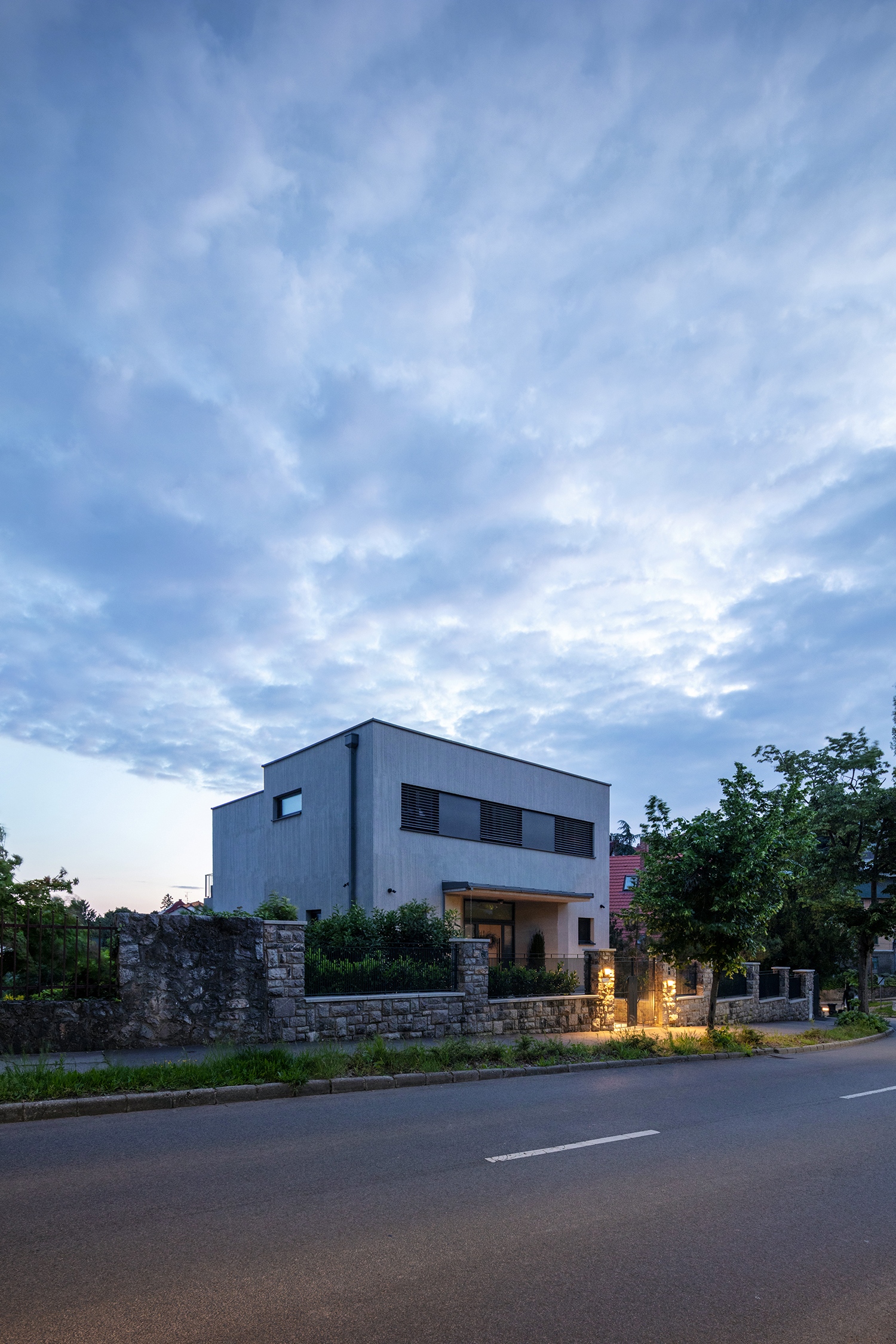 Az épület lapostetős, egyszerű kubus megjelenése valóban a korai modern jegyek kortárs átírása. Rögtön szembeötlik az utcai homlokzat szimmetriája: a bejárat középen, látszóbeton-előtetővel és a falaktól eltérő burkolattal hangsúlyozott megjelenése már egyfajta eleganciát kommunikál. S ez a visszafogott, de mégis határozott formálás az egész házra igaz. Jól kiegészíti ezt a kefével texturált vakolt felület, amely bevallom, üdítően hat és kiemeli a fehér vakolatos „villák” világából az épületet. Az egyszerű formálást a két oldalon körbefutó, konzolosan kiugró épületrész oldja, amely szerelt homlokzatburkolatával is eltér a fő tömegtől.
