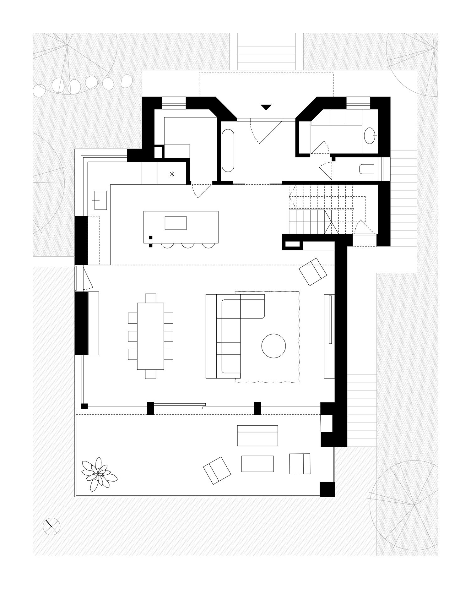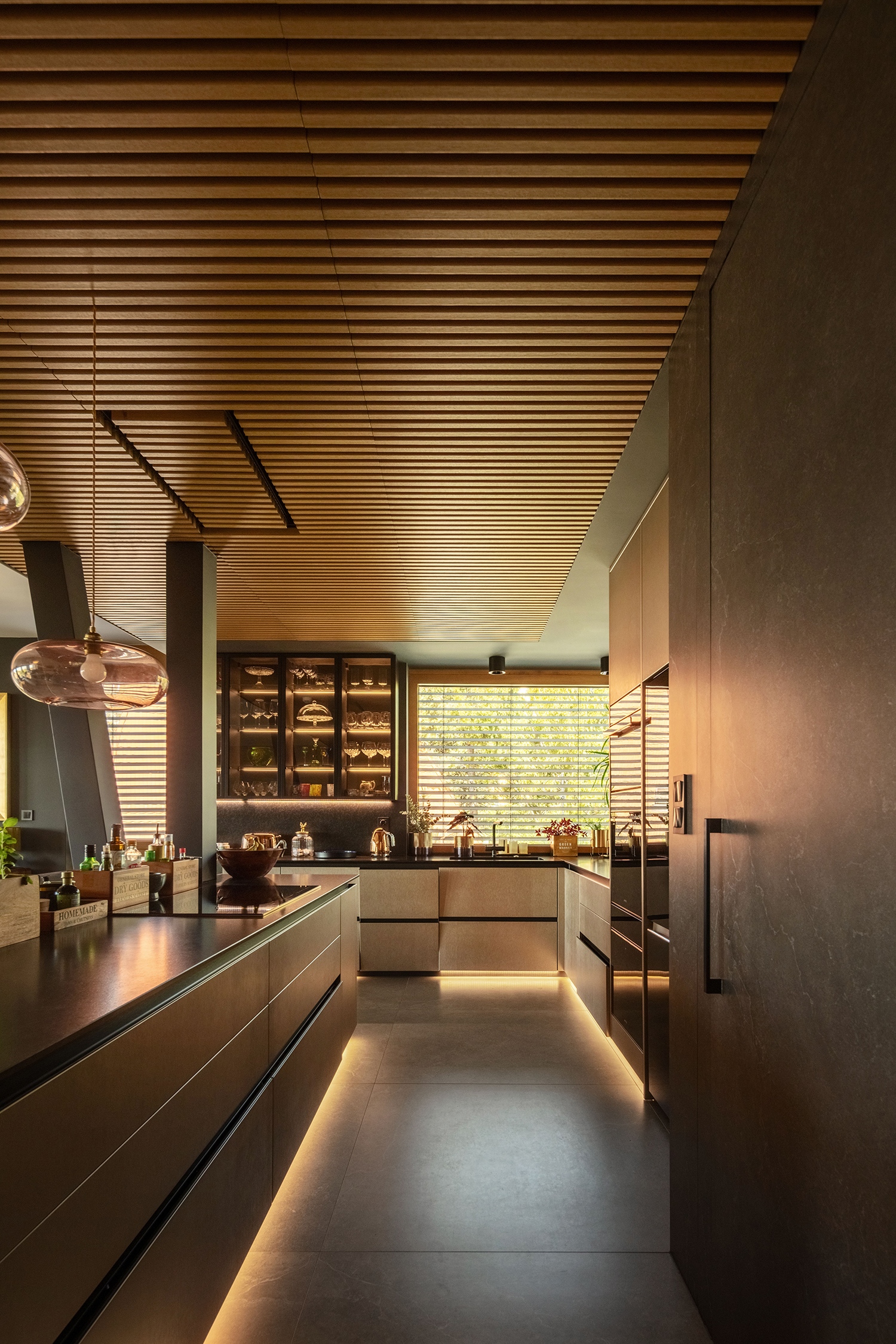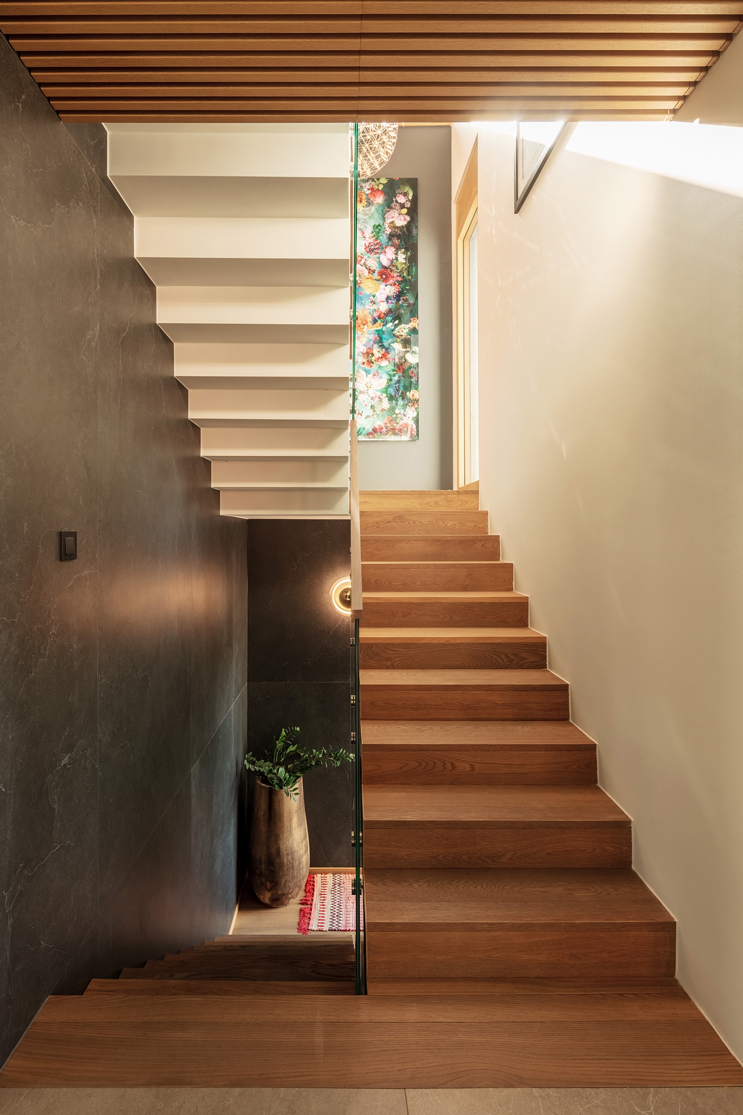 Kompromisszumos ez a megoldás, hiszen a nappalinak nincs közvetlen kapcsolata a kerttel – ez a lépcsőházból megoldott, és a ház kompaktságának köszönhetően nem egy fájó pont. Sőt, mint a ház előre megtervezett narratívája, rögtön ezzel a vizuális élménnyel indul a megérkezés. A konyha, étkező, nappali és a lépcsőház is egy teret alkot, nagyvonalúsága már-már zavarba ejtő. Ez nem csak a négyzetméterekre értendő, hanem az egész házra jellemző anyagminőségekre és részletekre is. A belső felületek anyagukban és színükben is összhangban vannak a külső megjelenéssel, nyílászárókkal. A fények játéka egész nap és egész évben különös itt – mindig más sarkot ér, mindig más arcát mutatva a térnek. A felső szint nagyvonalúan túlnyúló, konzolos terasza árnyékol, nyáron is élhetővé téve a nappalit a zsaluziák teljes bezárása nélkül.