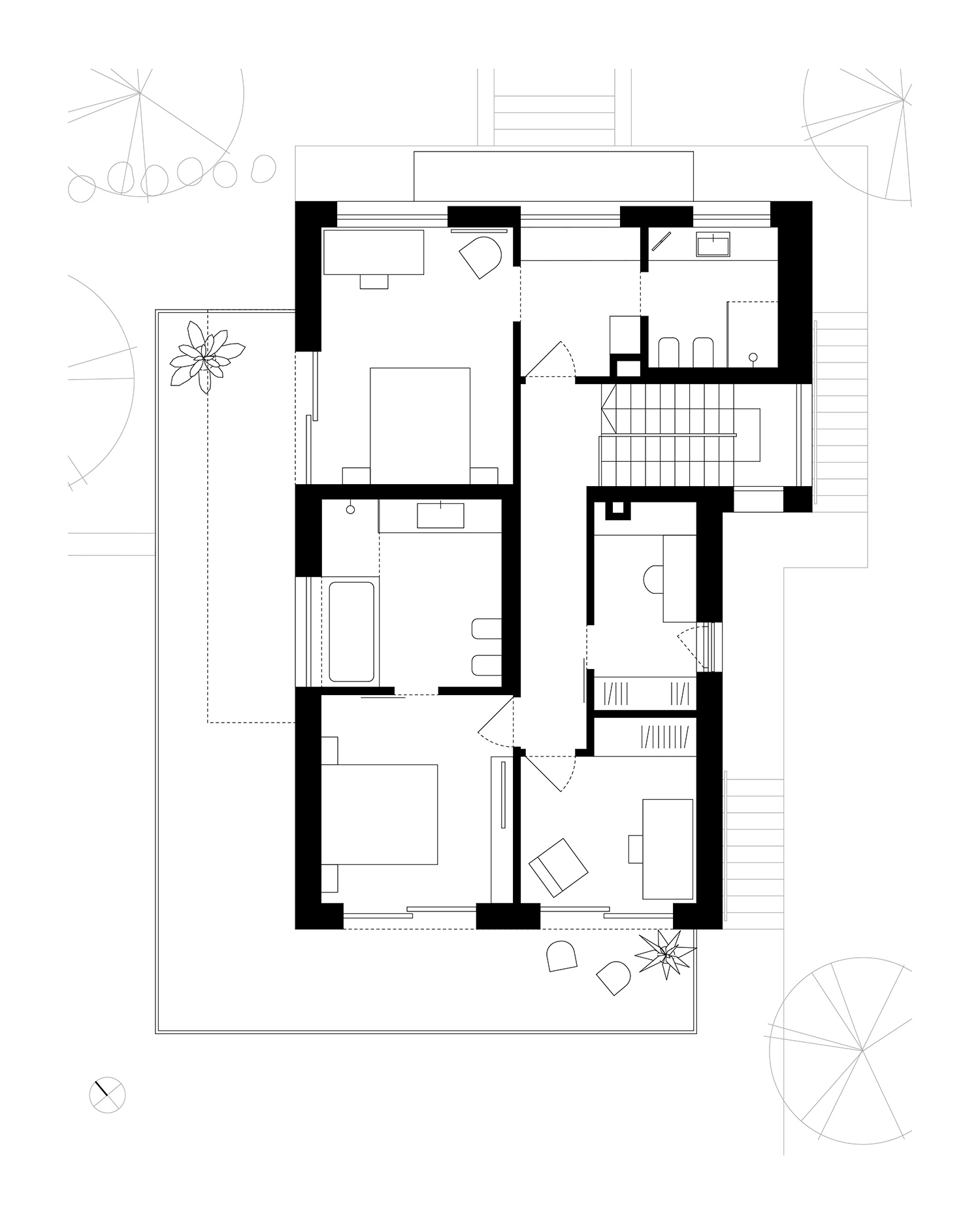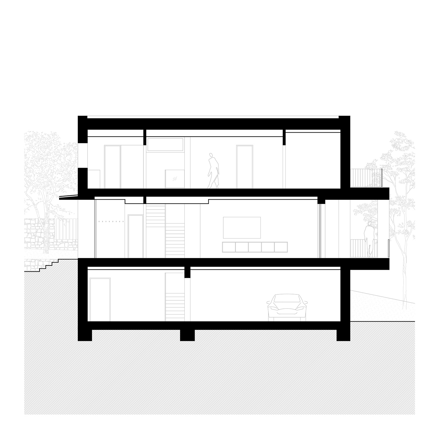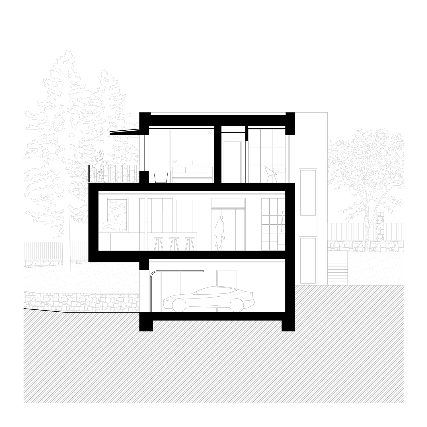 Bár az utcáról elsőre nem látszik, a ház háromszintes: a legalsó szinten a garázs és az épületet kiszolgáló funkciók találhatók, a bejárati szint a nappali tereké, az emeletre a hálóblokkok kerültek. Az előbbiek elhelyezéséből adódik is, hogy az utcai homlokzatról hiányzik a garázskapu. Ez a hiány persze pozitív; és bár azzal, hogy meghosszabbodott az út az utcáról a garázsig, a burkolt felület is megnőtt. Szerencsére a gondosan és lelkiismeretesen karbantartott zöldfelületek ezt kompenzálni tudják. A használat sem csorbul, a terepadottságok kedvezőek a garázs lenti elhelyezésére; így tartva fent az utcaképi minőséget.